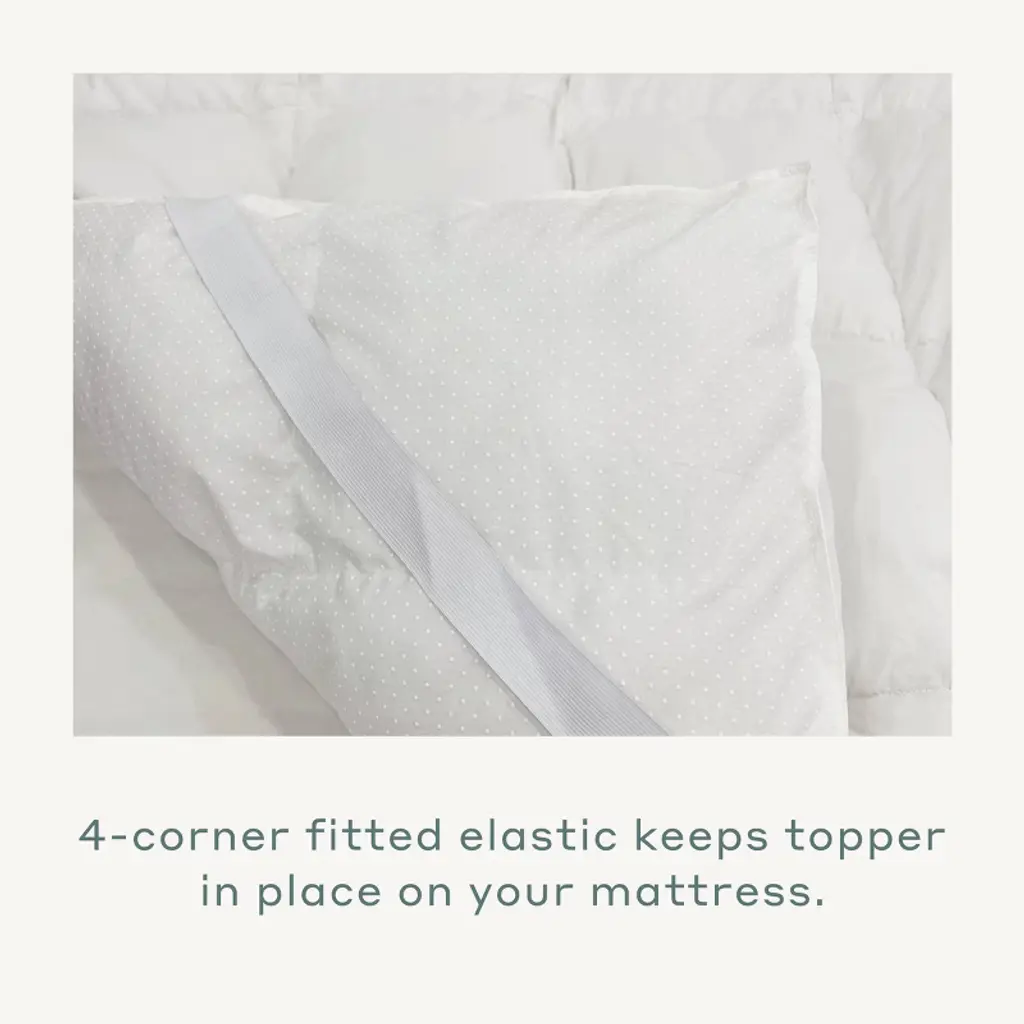 With the Ultra-Loft Down Alternative Mattress Topper from Casaluna™, you can protect the top of your mattress while adding even more welcoming and supportive softness to your bed. This 2.5-inch-thick mattress topper is designed with a firm down alternative fill for a soft feel that you can sink into after a long day. End-to-end and baffle-wall quilting help keep the fill evenly distributed for lasting use, while fitted elastic on all four corners keeps this down alternative mattress topper in place so it doesn't slide around when you top with your sheets and other bedding. This is your invitation to create a space that’s just for you. Make room to relax with Casaluna, where calm and comfort are naturally at home.Tested for harmful substances and produced sustainably in accordance with OEKO-TEX® guidelines.
