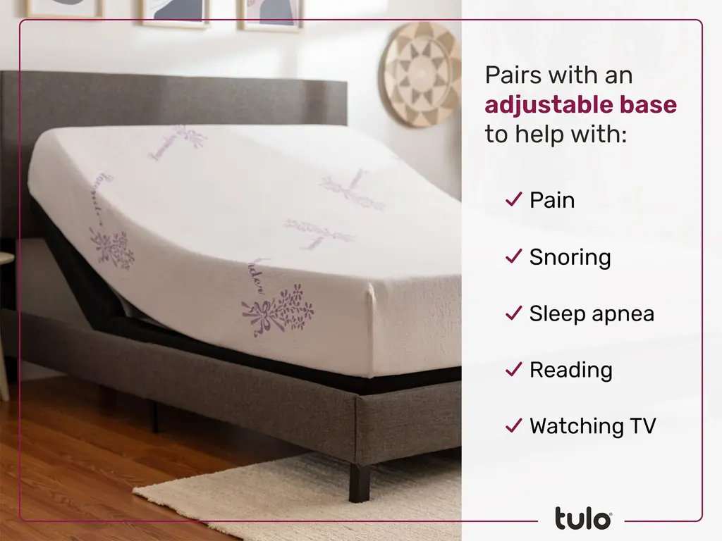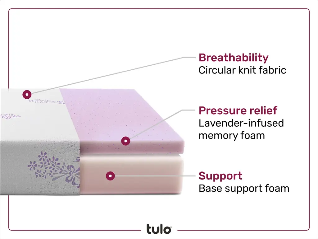 For a well-priced mattress that provides comfort, durability and freshness, meet our exclusive Tulo® 10” Memory Foam Lavender Mattress. The medium-plush feel offers unbeatable comfort for side sleepers and back sleepers who like a little leg elevation, while the infusion of lavender into the memory foam keeps your mattress feeling fresh and clean. Lavender, a botanical herb named for the French word “lavare,” meaning “to wash,” adds a boost of germ- and mite-fighting power without the addition of scents, allergens or chemicals. Plus, a deeper layer of memory foam provides all-night pressure relief and sag-free, firm support foam keeps your spine aligned.