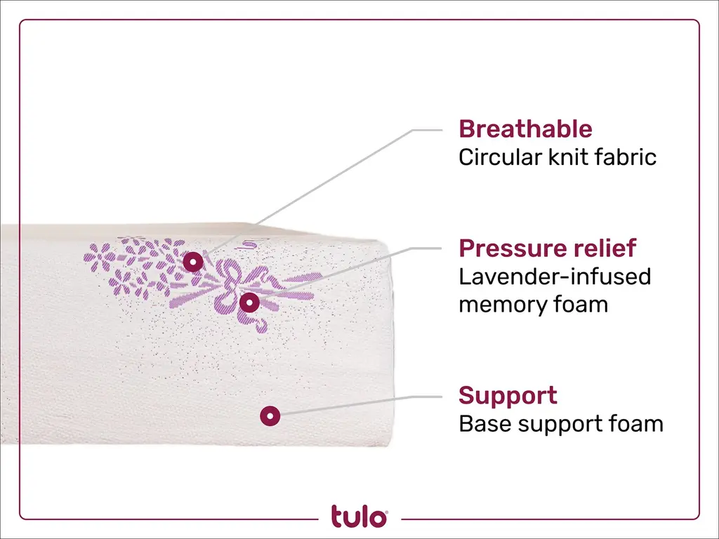 For a well-priced mattress that provides comfort, durability and freshness, meet our exclusive Tulo® 12” Memory Foam Lavender Mattress. The plush feel offers upgraded, pillowy comfort for side sleepers and for back sleepers who like a little leg elevation. And the infusion of lavender into the memory foam keeps your mattress feeling clean. Lavender, a botanical herb named for the French word “lavare,” meaning “to wash,” adds a boost of germ- and mite-fighting power without the addition of scents, allergens or chemicals. Plus, a deeper layer of memory foam provides all-night pressure relief and sag-free, firm support foam keeps your spine aligned.
