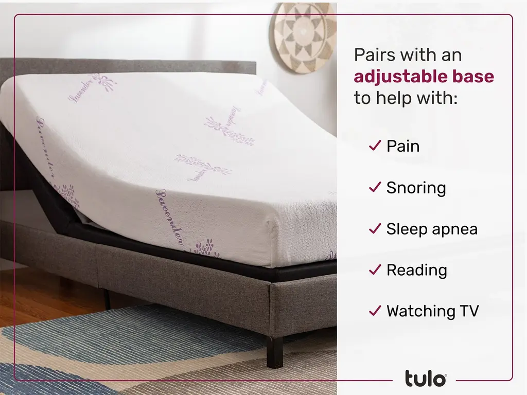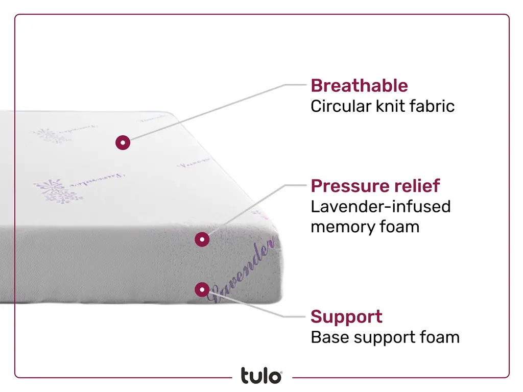 For a well-priced mattress that provides comfort, durability and freshness, meet our exclusive Tulo® 8” Memory Foam Lavender Mattress. The medium feel means this mattress is ideal for side sleepers, and the infusion of lavender into the memory foam keeps your mattress feeling clean. Lavender, a botanical herb named for the French word “lavare,” meaning “to wash,” adds a boost of germ- and mite-fighting power without the addition of scents, allergens or chemicals. It’s comfy, too, with a layer of memory foam that provides all-night pressure relief to your hips and shoulders and sag-free, firm support foam that keeps your spine aligned.