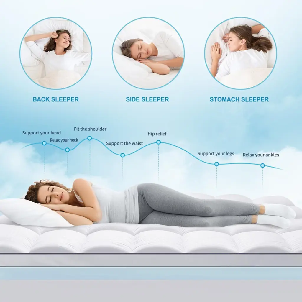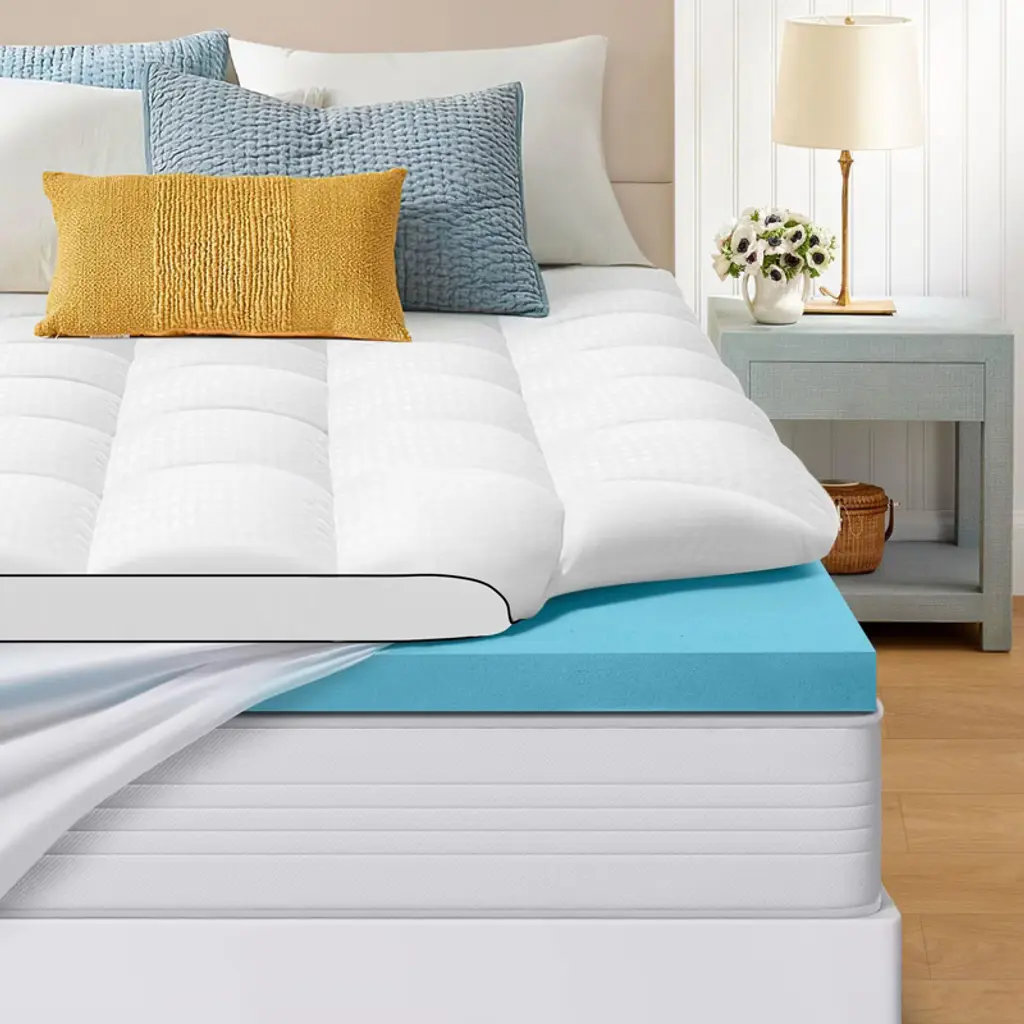 2 In 1 Adjustable Dual Layer Design - This plush dual layer mattress topper features a 2-inch cooling gel memory foam and a 2-inch quilted breathable pillow top mattress topper with snow down alternative overfilling. When combined, it can become a 4-inch thick mattress topper, which not only has strong support, but also provides a cloud-like comfortable experience.