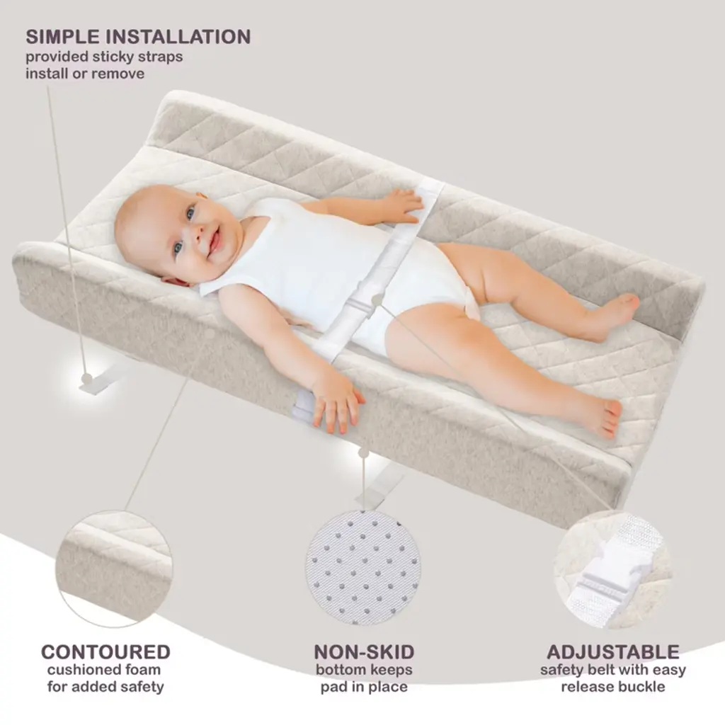 Make changing time a bundle of joy. Pamper your little one with cloud-like comfort atop the Organic Cotton Changing Pad from Modera Baby. Featuring a premium waterproof mattress, soft cotton cover, and unique curved design, this versatile cushion keeps little ones safe, clean, and dry during diapering and other everyday activities. Thick CertiPUR-US certified foam supports infants growing bodies, while contoured walls help secure and quiet tots as they settle into the pad’s cozy embrace. For stress-free setup, parents simply affix the mat to any standard size changing table or dresser via temporary adhesive hooks. Once placed on the pad, baby always stays put with an adjustable safety belt and non-slip grips that stick to the table’s surface. And since accidents are bound to happen, mom and dad love the mattress’s waterproof design and removable organic cotton cover. Another dirty diaper? Turn it into a beautiful bonding experience! Add a Modera Baby Changing Pad to your cart today!