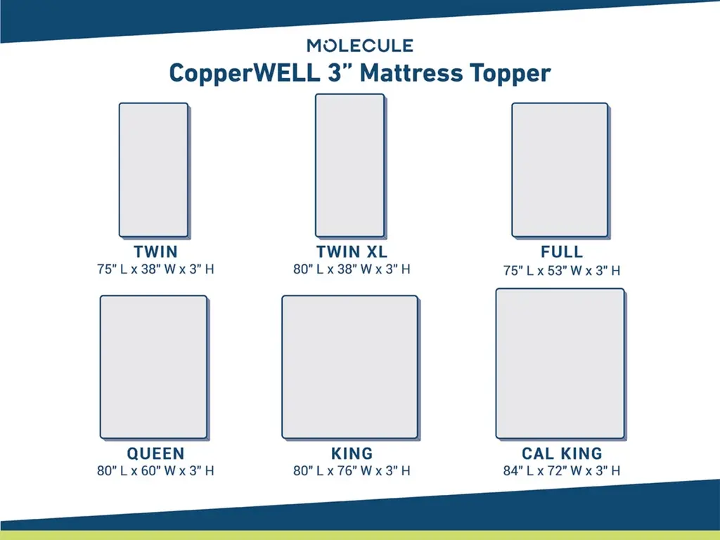 Improve your sleep quality and recover faster on the MOLECULE 3" CopperWELL Gel Memory Foam Mattress Topper with HexFLO Surface Technology. Experience MOLECULE's proprietary HexFLO design with 7 zones of dynamically responsive support, pressure relief, and airflow. The MOLECULE CopperWELL Topper features memory foam infused with copper for improved heat transfer and breathability, providing the ideal temperature for optimized rest and wellness. MOLECULE is tested and approved by the world's elite athletes, including Alex Morgan and Michael Phelps, helping them rest and recover while they sleep so they can maximize their performance during the day. Sleep like a Champion. Sleep on MOLECULE.
