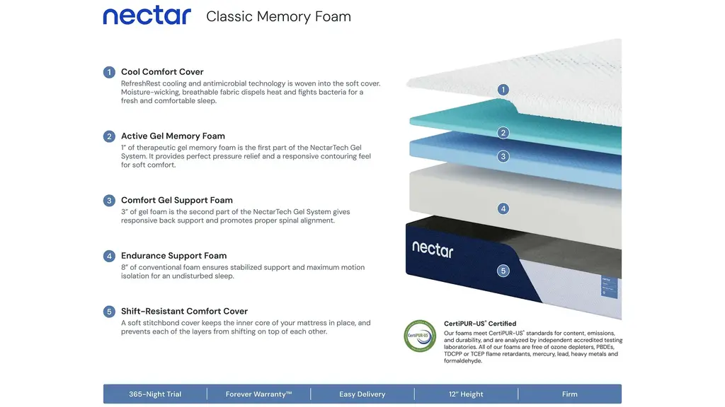 The Nectar Classic redefines bed-in-a-box comfort, uniting advanced cooling and antimicrobial technology with therapeutic gel memory foam to deliver the most restorative, indulgent sleep you've ever experienced.