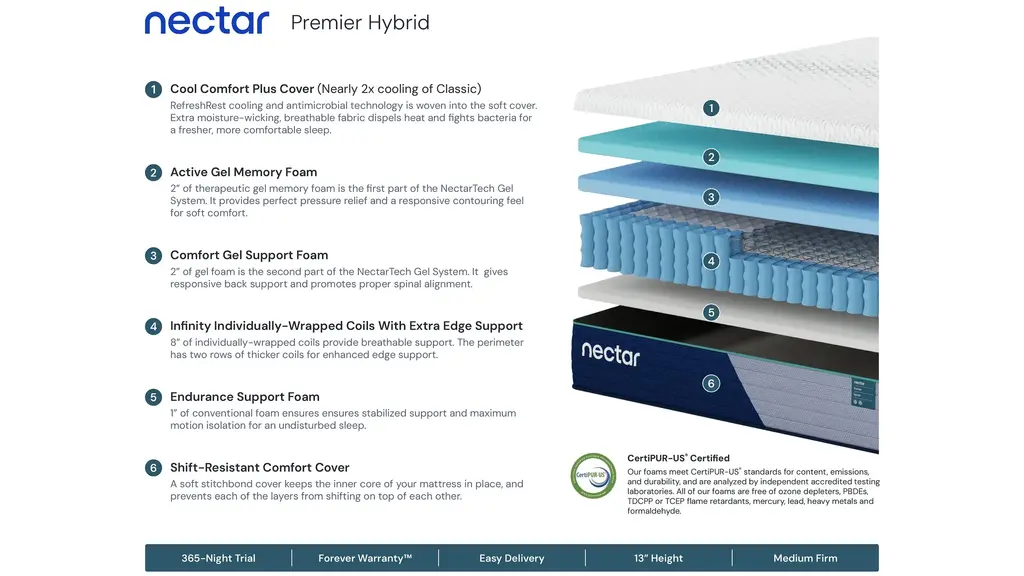 Nectars Hybrid mattress combines memory foam and individually wrapped steel springs for contouring support and boosted breathability. With thicker coils around the perimeter of the bed, Nectar hybrid mattresses offer superior edge-to-edge support. Nectars hybrid mattress layers have the ideal ratio of softness, firmness, and support. We took the contouring comfort of memory foam, and paired it with the breathable support of coils. Its a delicate balance, but we got it right.