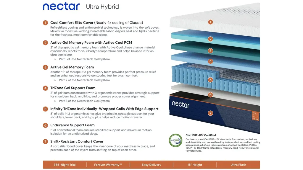 Nectars Hybrid mattress combines memory foam and individually wrapped steel springs for contouring support and boosted breathability. With thicker coils around the perimeter of the bed, Nectar hybrid mattresses offer superior edge-to-edge support. Nectars hybrid mattress layers have the ideal ratio of softness, firmness, and support. We took the contouring comfort of memory foam, and paired it with the breathable support of coils. Its a delicate balance, but we got it right.