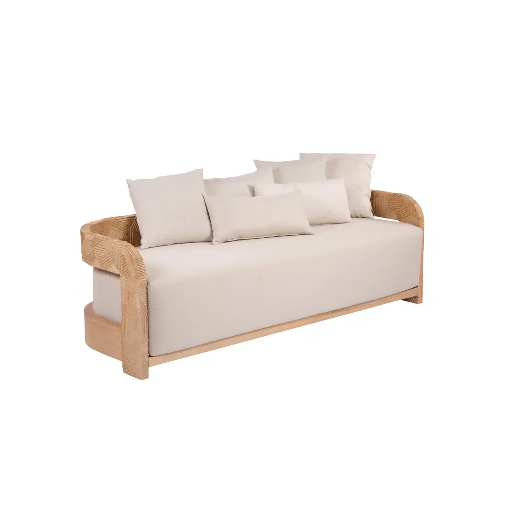 Outdoor oil-treated oak wood 2-seater sofa with double mattresses.Have you checked out our comfortable and durable For the Love of Nature outdoor sofa yet? Swing into summer with our newest bespoke line of outdoor furniture, crafted from outdoor-friendly oil-treated Oak wood that is made to last. The upholstery is made of two separate layers in beige and off-white, giving this sofa even more flair and style. It is part of a modular composition that can combined in multiple variations to suit any space; 3-seater, 2-seater, right and left chaise longues.Price does not include accent pillows.