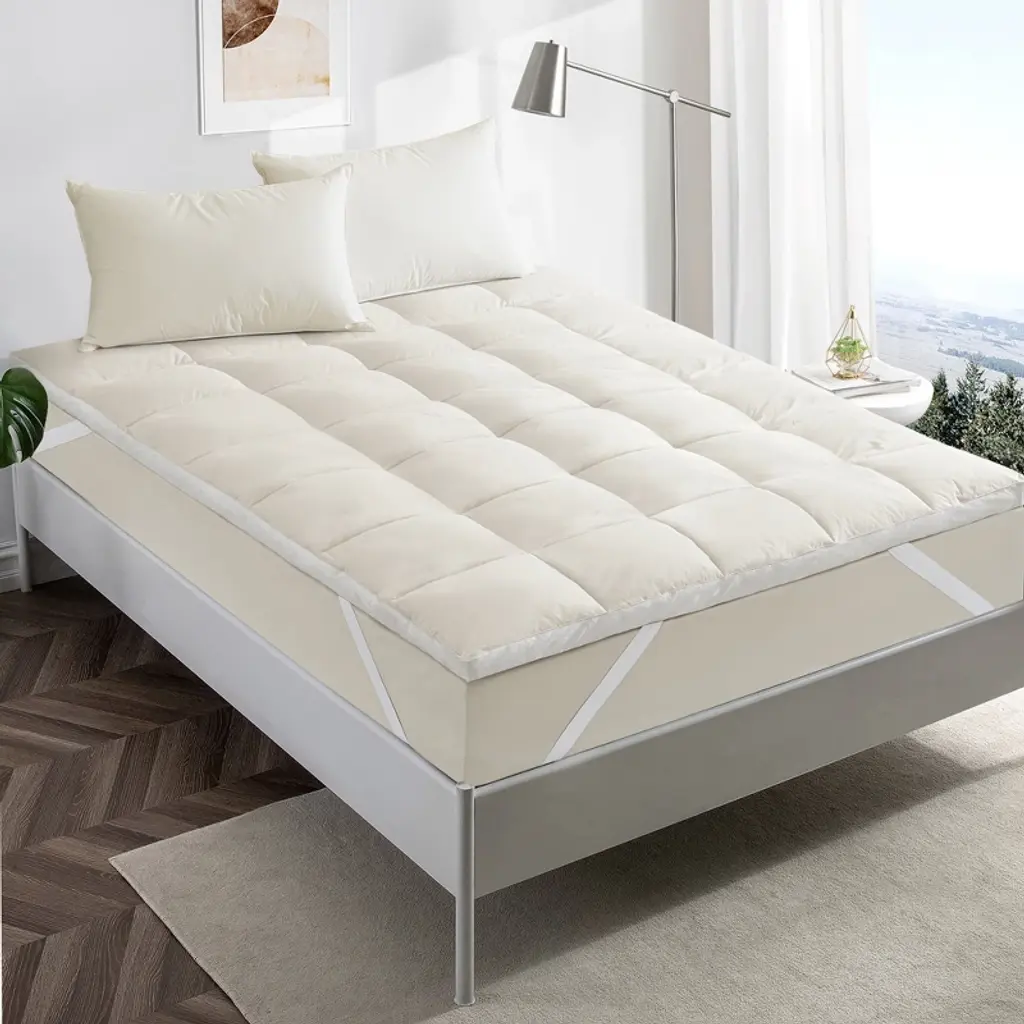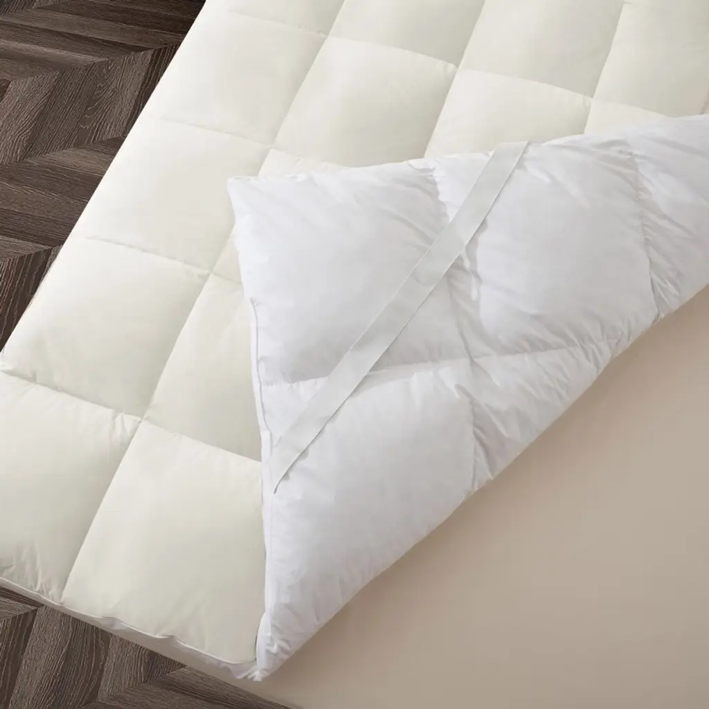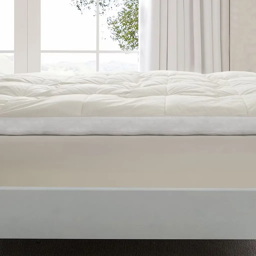 Transform your bed into a haven of comfort with our cloud-like mattress topper. The top layer, crafted from soft organic cotton, offers a smooth and gentle touch, while the durable white cotton side and bottom panels provide a secure, long-lasting fit. Inside, the top chamber is filled with plush polyester for a cushy, pillow-top feel, and the bottom chamber features a supportive blend of 95% white goose feathers and 5% white goose down. With a 2-inch thickness and secure straps that fit mattresses up to 18 inches deep, this topper delivers the perfect balance of softness and support for restful sleep.
