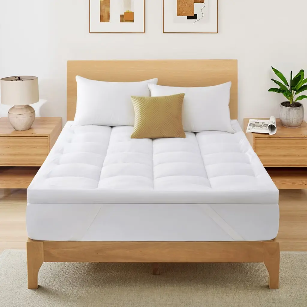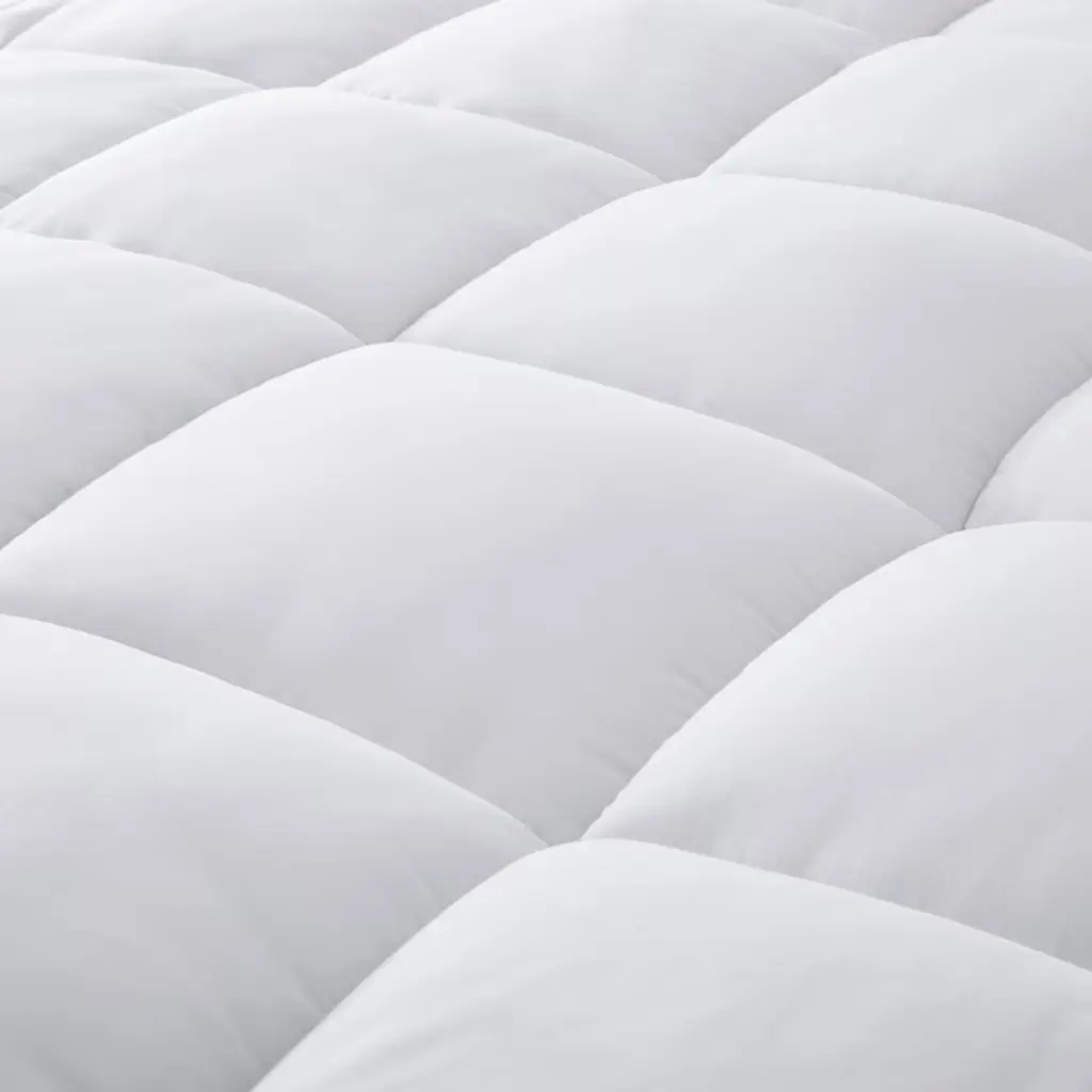 Upgrade your bed with our ultra-soft down alternative mattress topper, designed to provide cloud-like comfort. 4" thickness, the elegant quilted design adds a refined touch while enhancing the plush feel.Crafted from smooth microfiber fabric and generously filled with plush polyester, this topper creates a cozy, inviting sleep surface. Its soft, skin-friendly material ensures you wake up feeling refreshed and well-rested.Elastic corner straps keep the topper securely in place, fitting mattresses up to 18" deep. Designed for convenience, this topper is machine washable and dryable, making upkeep effortless. Delivered in a vacuum-sealed package to minimize waste, simply shake it out and allow 24-72 hours to expand to its full, fluffy shape. Enjoy the ultimate blend of softness and support for nights of restful slumber.