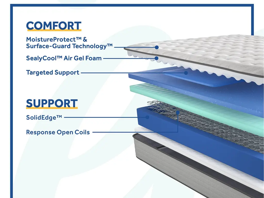 The Sealy® Posturepedic Spring Bloom Medium mattress is great for side and back sleepers who want a little extra targeted back and core support. Plus, the reinforced edge offers increased durability, and the antibacterial soft knit cover helps keep the mattress protected. After just one night, you’ll feel the difference.
