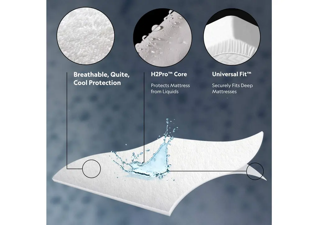 The Prime™ Comfort mattress protector features a hypoallergenic and absorbent cotton terry surface that sleeps comfortably and will not change the feel of the mattress. It also features the laboratory-certified H2Pro® liquid-proof membrane which creates a quiet, and breathable barrier against allergens and dust mites. The universal fit elastic ensures a secure fit for mattress depths of 6"-22". Pillow protectors are also available to create a healthy sleeping environment. Weight 21.400 lbs. (9.63kgs.)