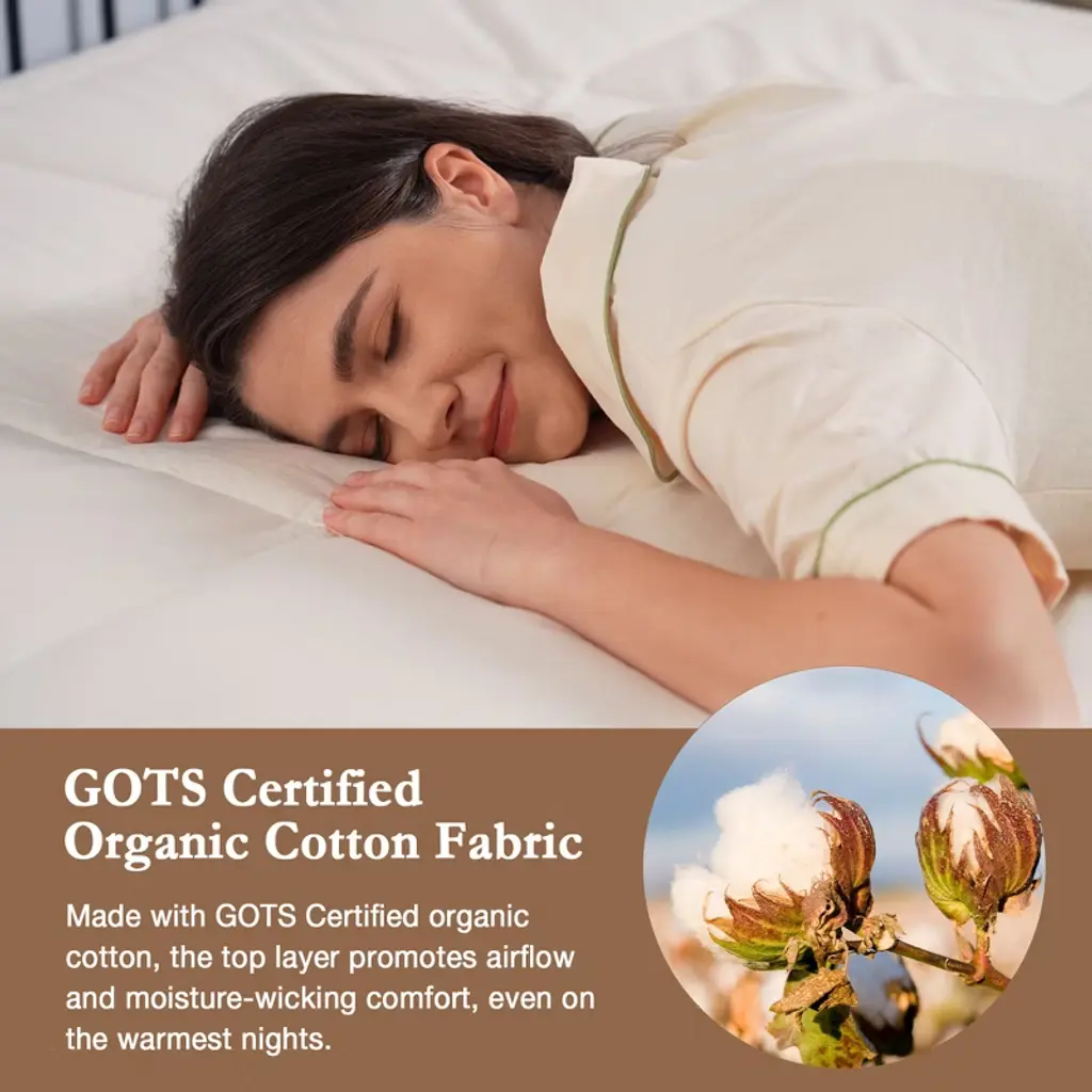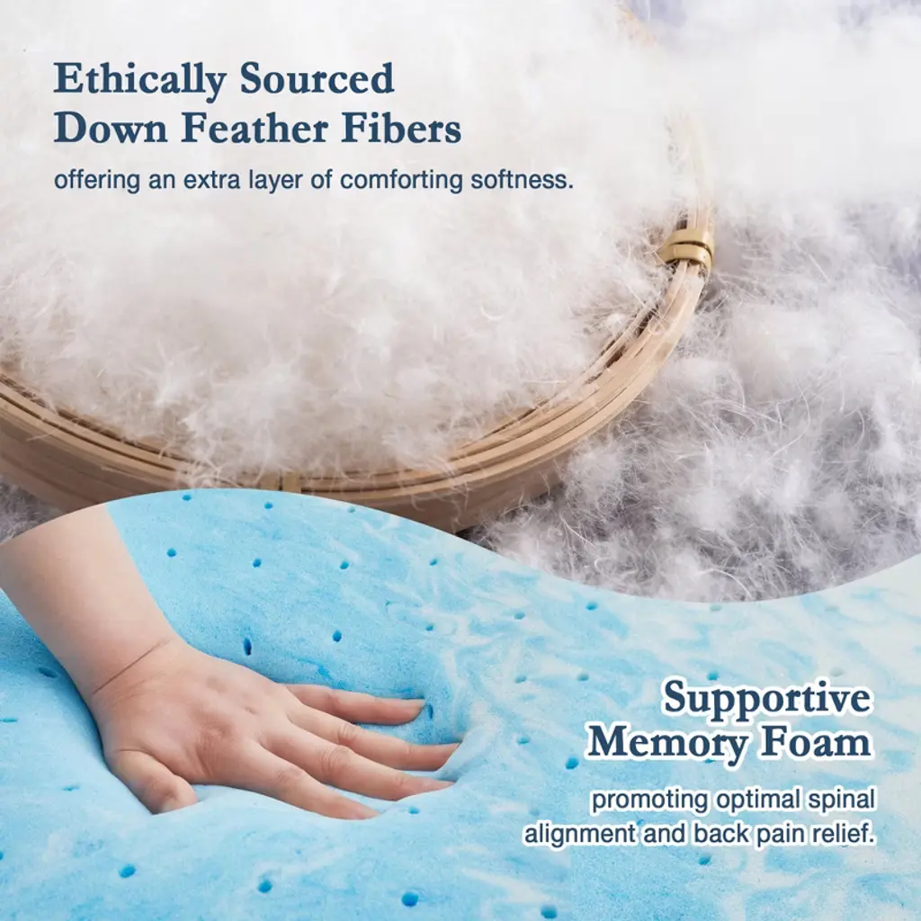 Upgrade your sleep with our Organic Cotton Layered Memory Foam Mattress Topper, designed for ultimate comfort and support. This dual-layer topper combines a 2-inch cooling gel-infused memory foam base with a luxurious feather and down-filled top layer, delivering both pressure relief and plush softness for a hotel-quality sleep experience. The 100% organic cotton cover enhances breathability, creating a cooler and more comfortable sleeping environment. Unlike traditional toppers, this design features a removable zippered cover, making it easy to clean and maintain. The secure zipper closure ensures the inner layers stay in place, providing a consistently cozy and supportive sleep surface. Available in Twin, Full, Queen, and King sizes, this 2-inch thick mattress topper is the perfect way to rejuvenate an old mattress or enhance the plushness of a firm bed. Experience the perfect blend of softness, breathability, and support for a truly restful and refreshing night¡¯s sleep.