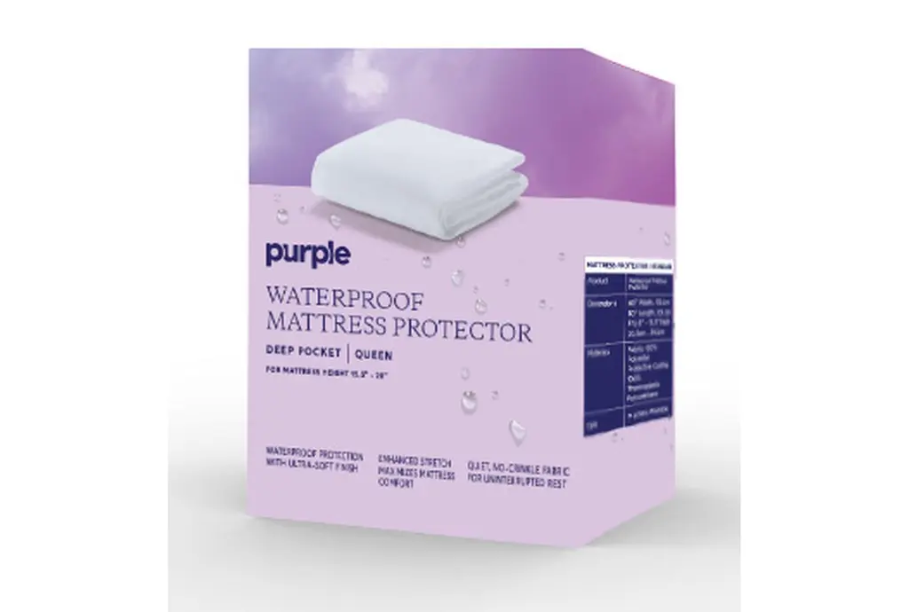 The Purple Waterproof Polyester Mattress Protector is designed to keep your king size mattress safe and clean. This white mattress protector features a 20" deep pocket, ensuring a secure fit on your bed. It is machine washable, making it easy to maintain and keep fresh.
