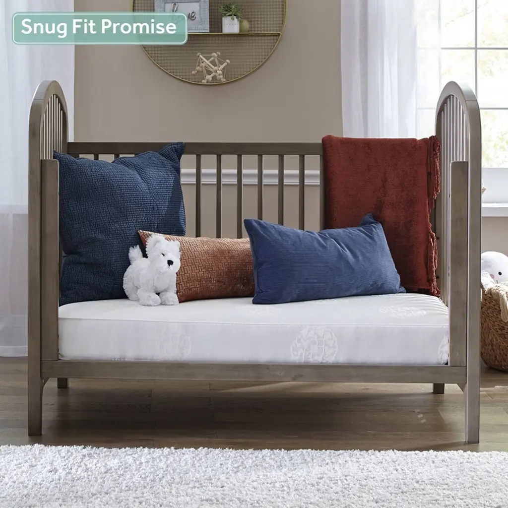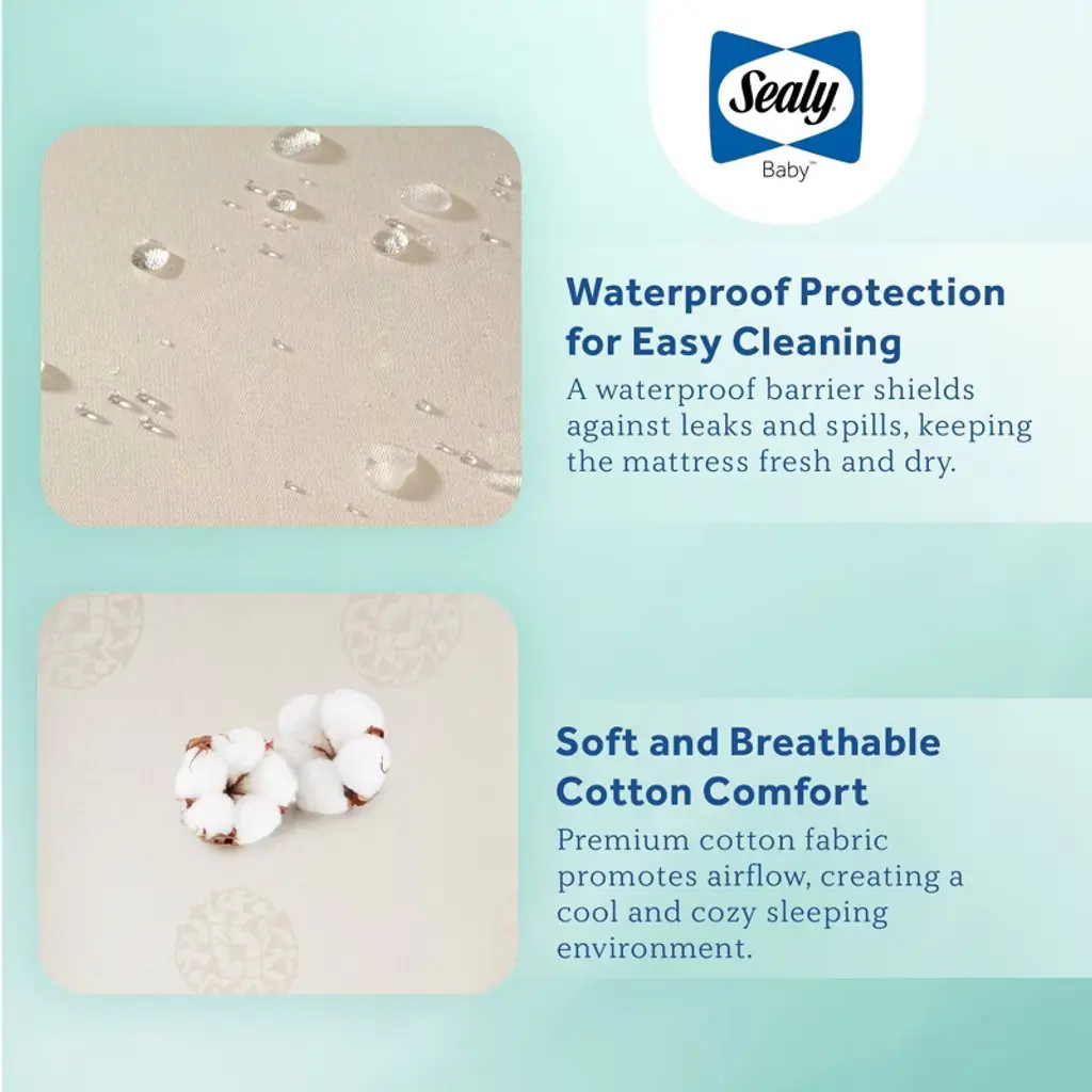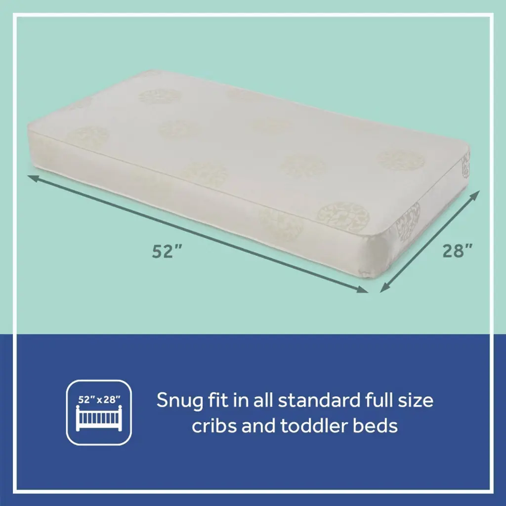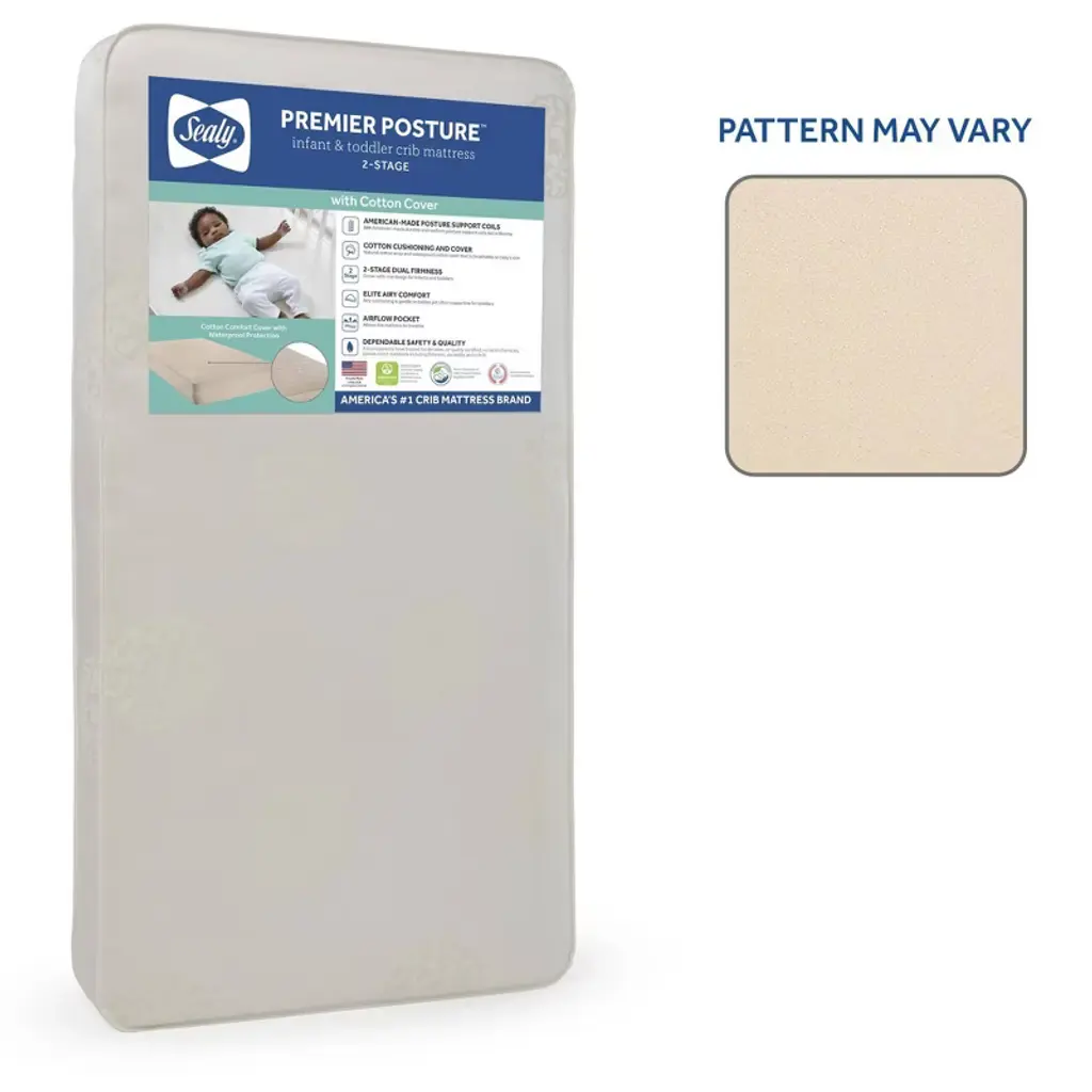 The Sealy Premier Posture 2-Stage Dual Sided Crib and Toddler Mattress is a popular choice for your baby's crib and toddler bed. It offers a premium design at an incredible value. With a high coil count and multiple layers of hypoallergenic cushioning, your newborn, infant and toddler will have firmness, support, comfort and protection. The 204 posture supportive steel coils offer long-lasting strength and a firm core. Our American-made coils are quality tested for firmness and durability, made with care by our expert baby mattress builders. Innerspring crib mattresses are in demand because they are resilient and move with your baby's body weight, providing proper posture support throughout. The Sealy Premier Posture is enhanced with secure edge border wire plus EverEdge corner and side protection in all the right areas just like an adult mattress. 2-Stage design means there is a firmer side for infants and then flip over the mattress for a softer side for toddlers who might love to curl up in comfort to sleep on their sides. Waterproof mattresses are a must have! The reinforced cotton cover is breathable on baby's skin and designed with a protective waterproof barrier underneath the cotton cover so no leaky messes will seep inside. Mattresses that are not waterproof may be filled with bacteria and germs on the inside, so to help create a healthier, sanitary sleeping surface, always look for a waterproof baby mattress. Plus, the exclusive airflow pocket allows the mattress to breathe without any small metal vents punched into the side, which Sealy products never use. 100% hypoallergenic layers, no harsh chemicals are added, the crib mattress is pvc-free and does not contain lead, phthalates or any harmful chemicals of concern to children. This mattress meets the voluntary ASTM crib mattress standards including lock-stitched seams for added safety and is properly tested for size. Sealy crib mattresses pass strict safety and quality tests that go above and beyond any standard testing. The Sealy Premier Posture 2-Stage Crib Mattress works perfectly in any crib or toddler bed and is tested to fit all US-Standard size cribs and toddler beds properly. Proudly made in the USA with US and globally sourced materials. Lifetime warranty on workmanship and materials. Sealy is America's best-selling crib mattress brand, offering incredible quality and safety features for a baby mattress you can trust. Sealy…Proud Supporter of You.-All the materials are GREENGUARD GOLD Certified for a healthier indoor environment. The Gold standard is a strict air quality standard designed for products used with children, especially sensitive children. -Sealy baby mattresses meet Washington State's Chemicals of High Concern to Children standards for harsh chemicals. -Cotton soft surface with waterproof and allergy barrier bottom layer.-Measures 51.63 x 27.25 x 5.5 inches to fit in cribs and toddler bed frames for years of use.All New Material Consisting of "64% Polyester Fiber Batting36% Blended Fiber Batting (44% Rayon, 36% Cotton, 20% Polyester)Innerspring Unit"Reg No PA 23169(NC)Certification Certification is made by the manufacturer that the materials in this article are described in accordance with law.Made by "Made by Kolcraft Enterprises, Inc. 10832 NC Hwy 211 East Aberdeen, NC 28315(800) 453-7673"Finished Size 27 1/4 x 51 5/8 inchesNet Weight of Filling Materials: 4 lbs., 10 oz.Made in Made in USA of US and Imported Parts