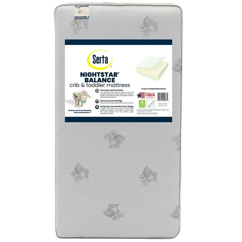Be sure your child is getting the best sleep possible with Serta’s Nightstar Balance Extra Firm Crib & Toddler Mattress. Built to fit both standard size cribs and toddler beds, it features a firm high-density thermo-bonded fiber polyester core for the supportive sleeping surface your baby needs. This sturdy mattress is uniquely covered for each stage of you child’s life, the infant side has a durable waterproof cover for easy cleanup, and the toddler side features woven fabric, which is water and stain resistant. Finished with square corners to help create a secure fit inside the crib, its lightweight design makes changing the sheets easy. Designed by the same brand that’s been leading the way in mattress innovation and technology for more than 80 years, Serta’s crib and toddler mattresses deliver the same quality craftsmanship and attention to detail as their adult mattresses.All Serta crib mattresses are GREENGUARD Gold Certified and meet the strictest standards offered by the GREENGUARD Environmental Institute, which recognizes products with low chemical emissions, contributing to improved indoor air quality.