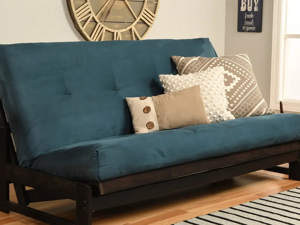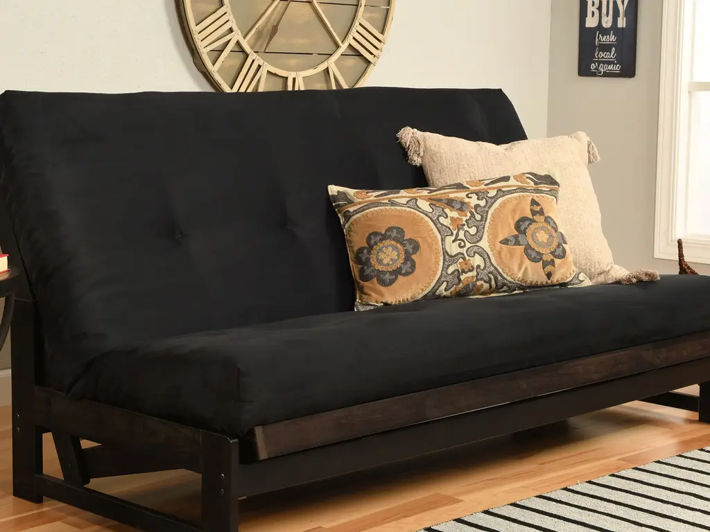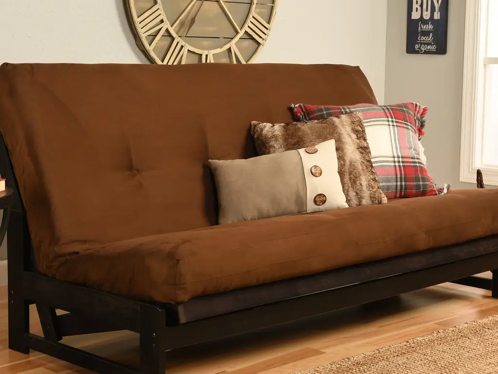 The upholstery grade fabric is tufted to the mattress both for durability and design. The springs flex with your body to offer support while you sit or sleep. The flexible layers of Certipur-US foam and plush layers of cotton add to the superior comfort. The conversion from sitting to sleeping position is made easy with this unique hinge system. The Aspen futon is a classic hardwood frame with a space saving design in Mocha. This unique and versatile full-size futon sofa easily converts to a Bed.