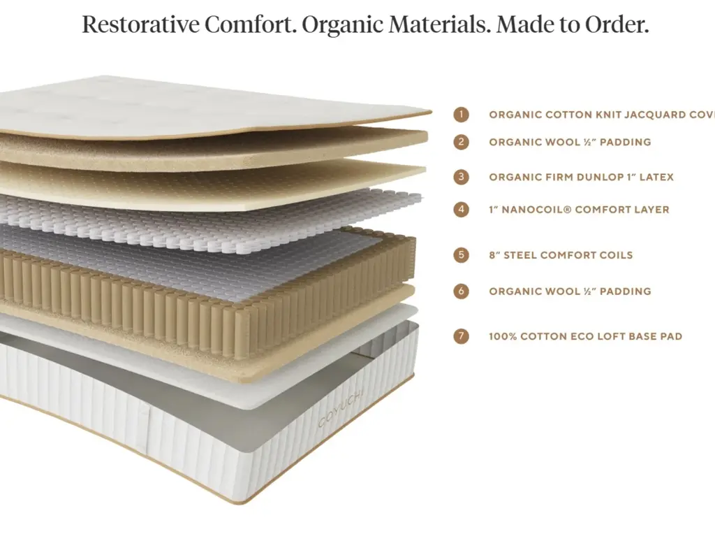 Voted "Best New Mattress" by in the GQ Sleep Awards and "Best Organic Mattress" by House Beautiful Introducing The Natural Restorative EcoMaterials (REM) Mattress—the first mattress of its kind, thoughtfully designed to deliver all-natural comfort and unparalleled support for your best night’s sleep. Crafted from 100% GOTS certified organic cotton and wool, plus GOLS certified organic latex, its eco-friendly materials are free from the harmful chemicals, toxins, and dyes found in conventional mattresses. Made to order in the USA from sustainable materials, our revolutionary mattress offers a pure, restorative and better way to sleep—both for you and the planet. Seven carefully engineered layers, including thousands of individually wrapped coils, provide pressure relief, body contouring, and motion isolation, while wool padding regulates temperature, wicks moisture, and resists allergens for cool, comfortable sleep.