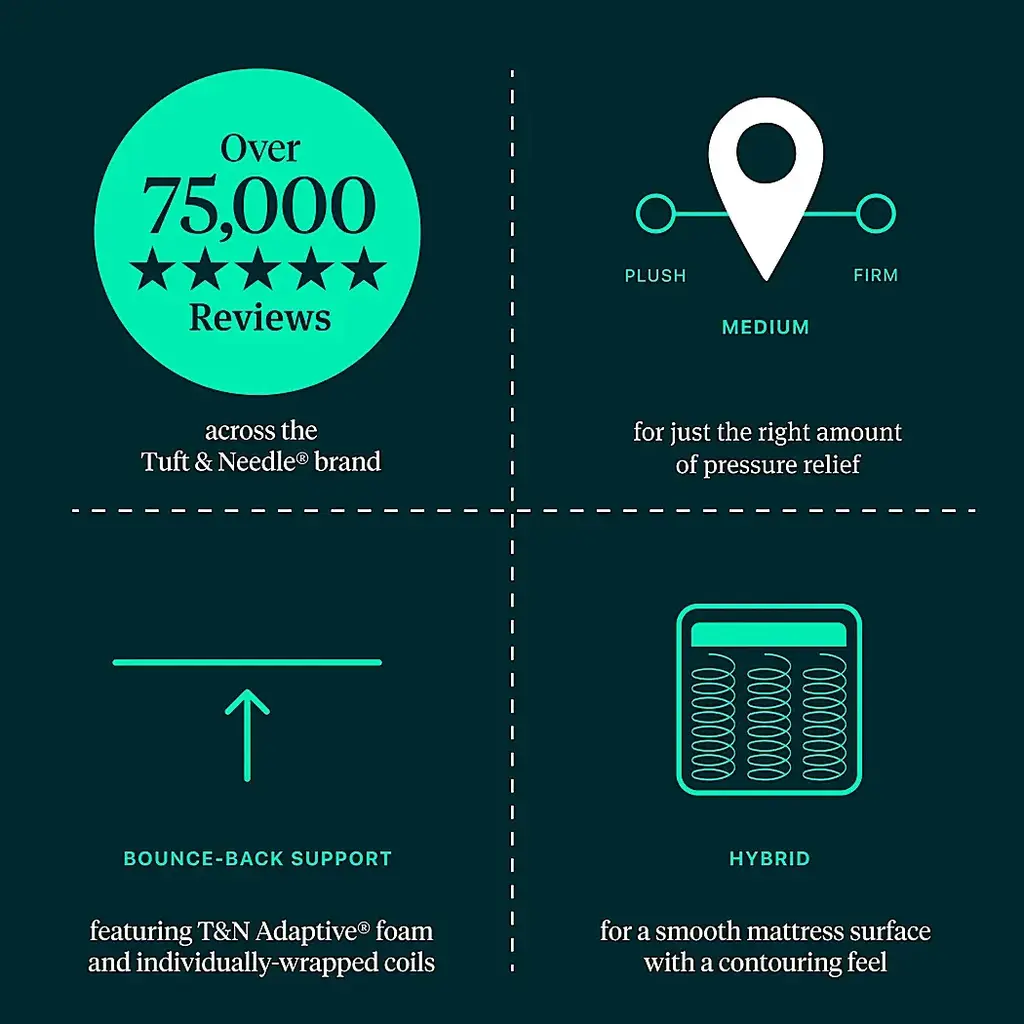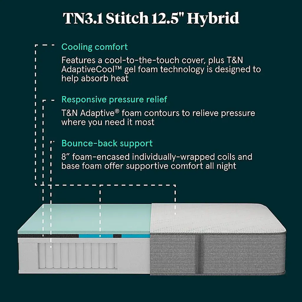 Firm 875-density individually wrapped coils offer responsive pressure relief and durable bounce-back support. Foam-encased seating edge provides corner-to-corner edge support to eliminate sleep partner disturbances. The cool-to-the-touch cover and T&N AdaptiveCool gel foam technology is designed to help absorb heat for a cooler nights sleep.