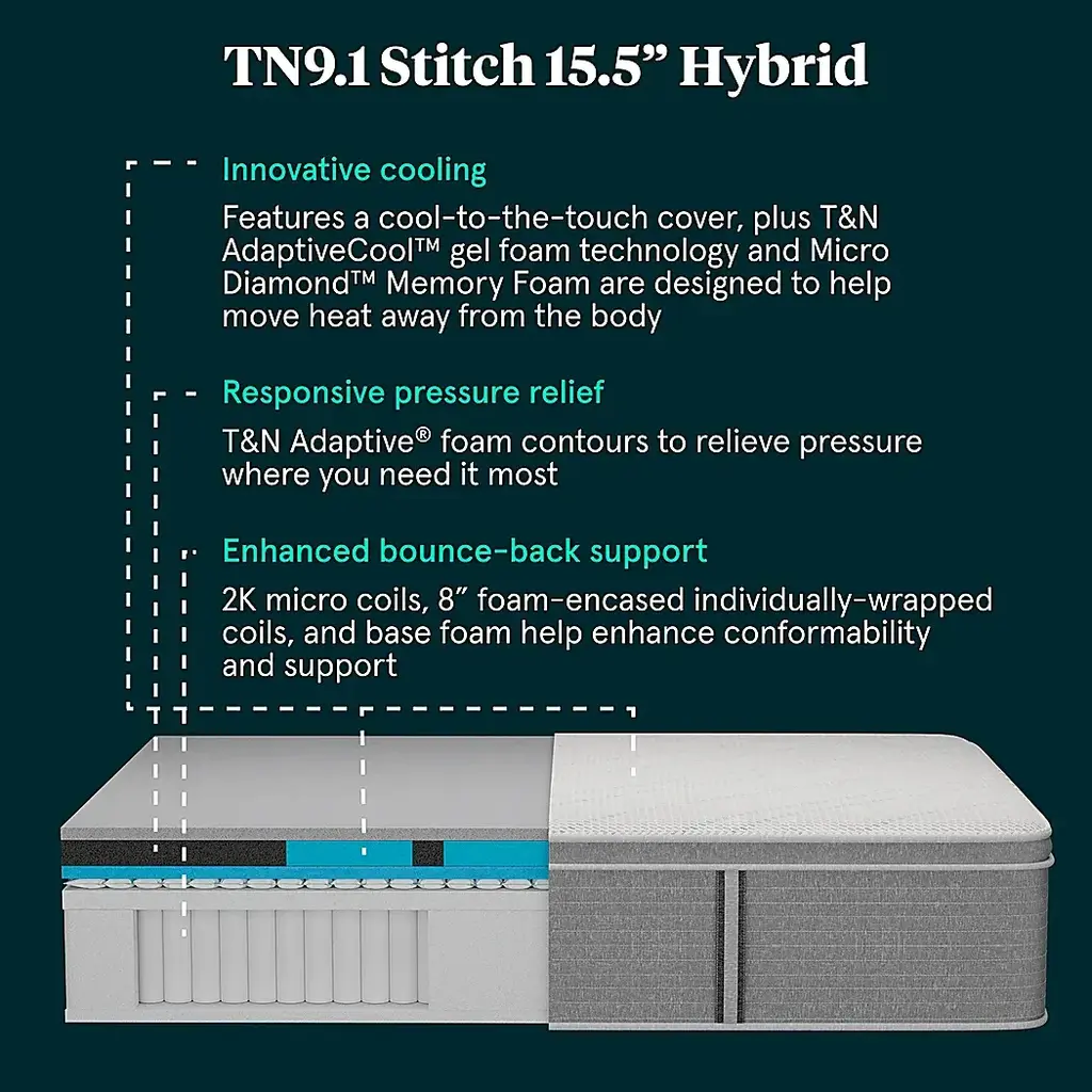 Plush 1000-density individually wrapped coils with body-conforming Micro coil upgrade offer responsive pressure relief and Tuft & Needle's most premium bounce-back support. Foam-encased seating edge provides corner-to-corner edge support to eliminate sleep partner disturbances. The cool-to-the-touch cover and T&N AdaptiveCool gel foam technology is designed to help absorb heat for a cooler nights sleep. A Micro Diamond memory foam upgrade is designed to help transfer heat away from the body for a comfortable rest. Conveniently raise or lower the head of your mattress using the RTG Sleep 2900 adjustable base with wireless remote control.