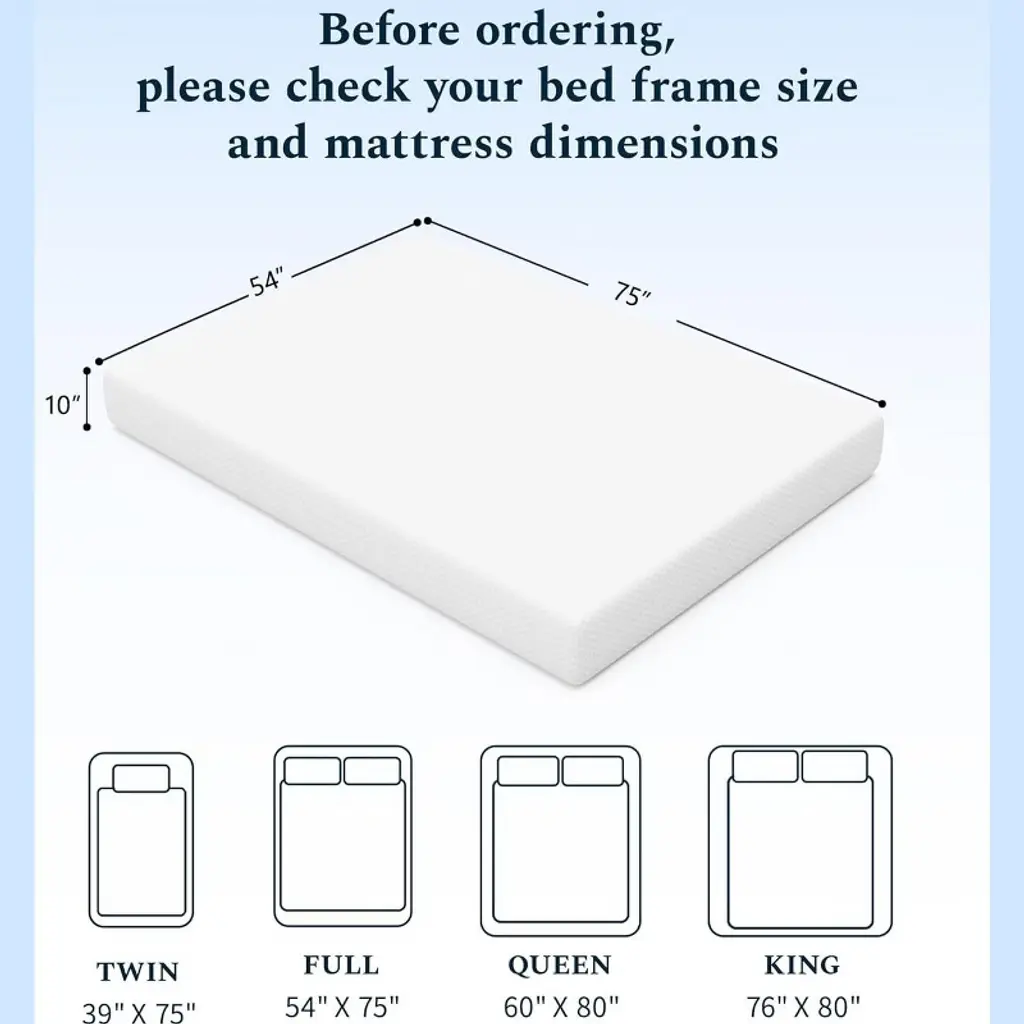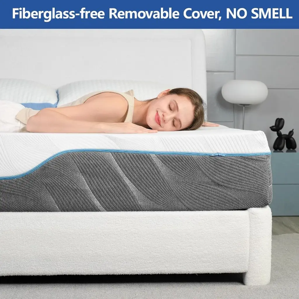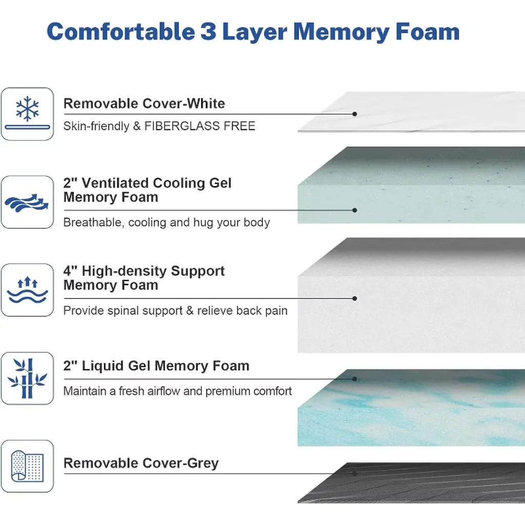 1. Premium Memory Foam Mattress Our mattress - in - a - box blends premium gel foam with bamboo memory foam, plus a dual - sided, fiberglass - free cover. It offers medium - to - extra firm support to ease back pain, along with low motion transfer for luxurious, undisturbed and restful sleep. 2. Adjustable Firmness for Custom Comfort The upgraded design provides medium to extra firm options — more breathable and durable than traditional toppers. Flip the foam layer to tailor the firmness, balancing comfort and support just the way you like. 3. Fiberglass - Free & Skin - Friendly Cover The odor - free, skin - friendly cover (white on one side, chic grey on the other) is free of fiberglass. It ensures safe, worry - free sleep, and you can pick the side that suits your mood. 4. Certified Safety & USA - Made Quality Manufactured in Fontana, California, under strict quality control. Certified by CertiPUR - US and Oeko - Tex Standard 100, it’s safe for families, including pregnant women and babies, bringing peace of mind. 5. Hassle - Free Trial & Setup Enjoy a 365 - night trial. Compressed in a box for easy transport: unpack, let it stretch out, and give it 24 - 48 hours to fully expand. Ideal for quick bedroom makeovers.