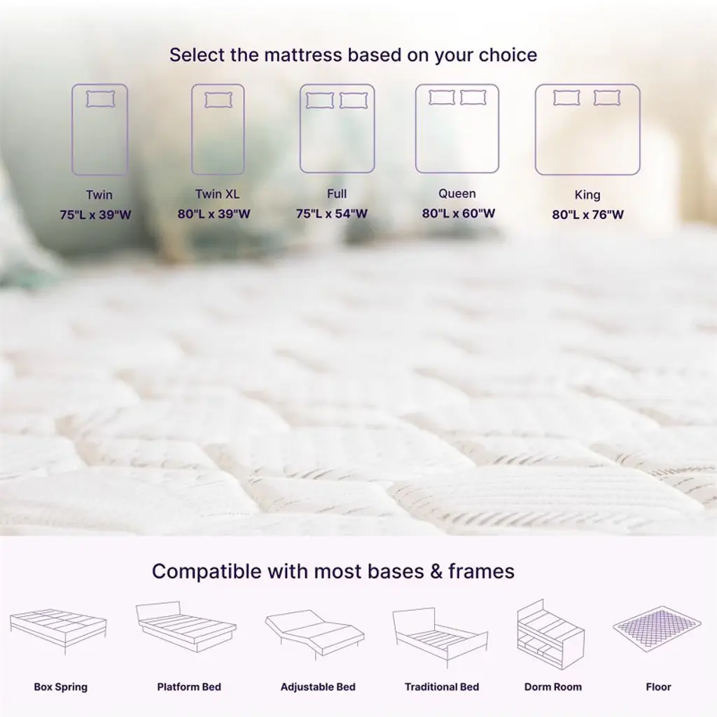 The 12-inch Twin Cooling Gel Hybrid Mattress combines advanced comfort technology with practical functionality. Its hybrid design features cooling gel memory foam layers over a supportive pocketed coil system, delivering both pressure relief and temperature regulation. The mattress is compatible with adjustable base frames, making it versatile for various sleep setups. With its water-resistant cover and low motion transfer design, it offers durability and undisturbed sleep. Like premium hybrid mattresses, it includes reinforced edge support and CertiPUR-US certified foams for safety and longevity.