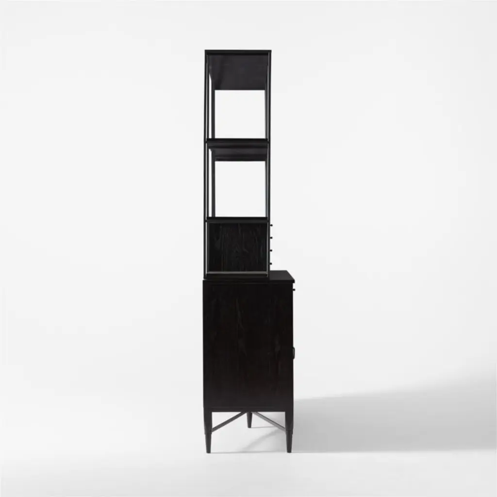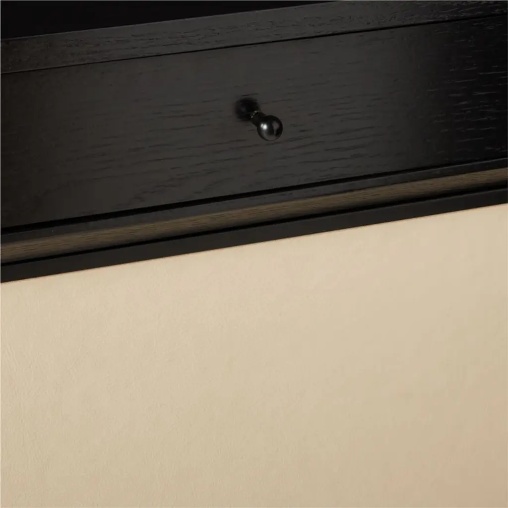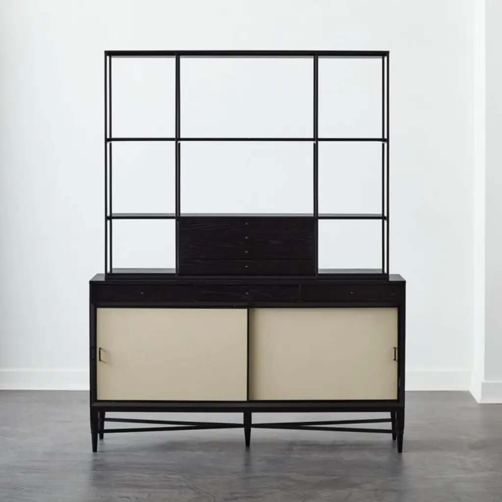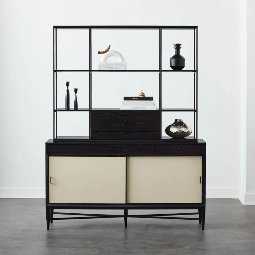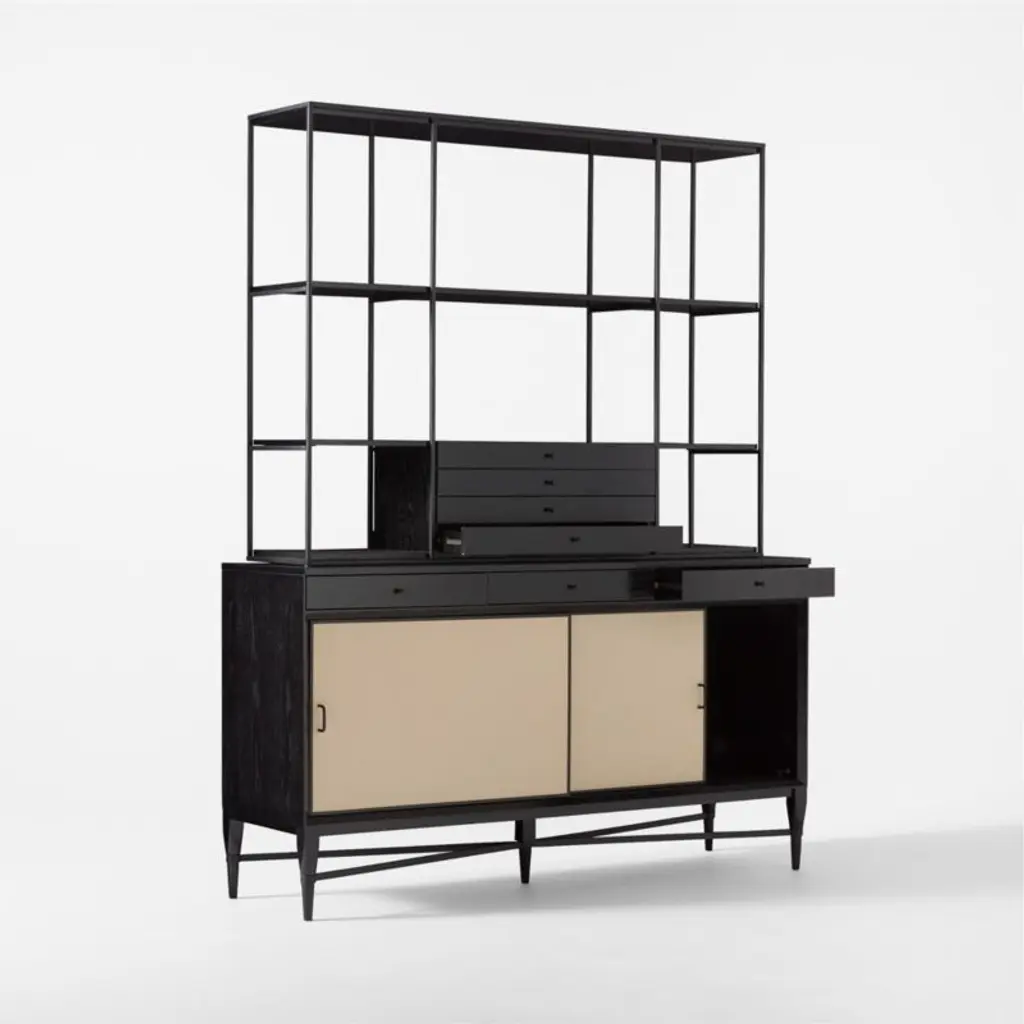 The slender lines, fine veneers and architectural detailing of Paul McCobb's Connoisseur Group are just as elegant today as they were when first introduced in 1954. Hutch and cabinet set features FSC ®-certified ebonized oak, black powdercoated metal details and sliding doors updated in luxe ivory leather. Hutch with four drawers is removable for versatility; console also features adjustable shelves and cord management. CB2 exclusive.