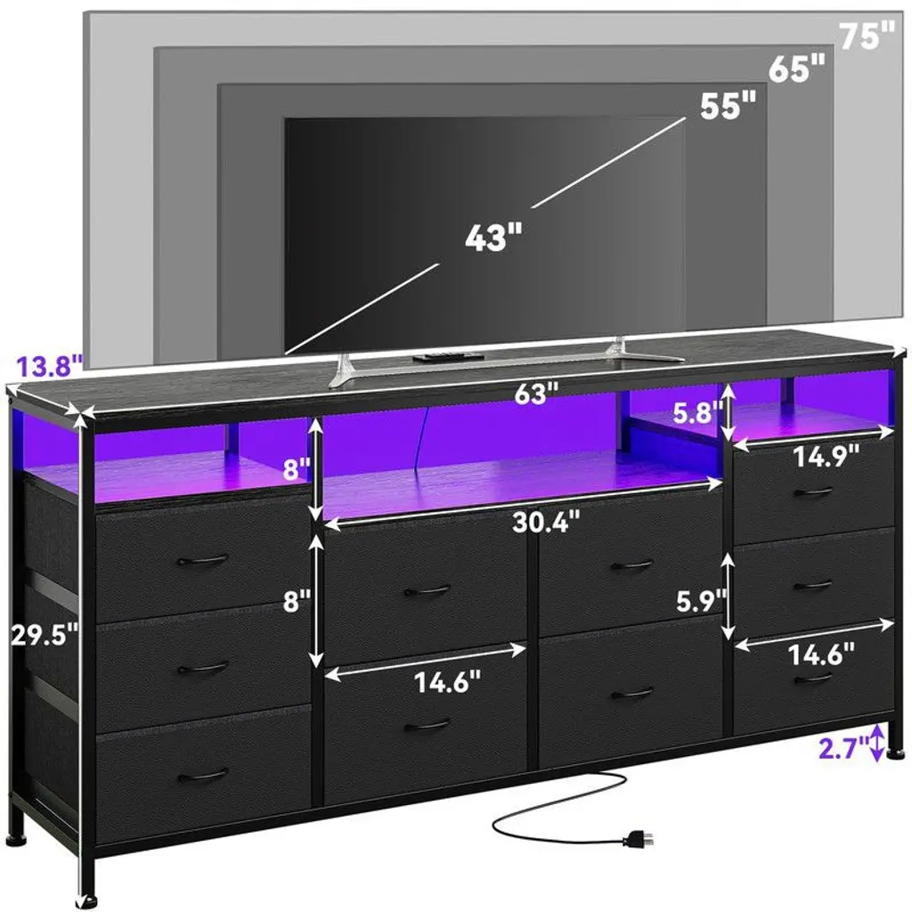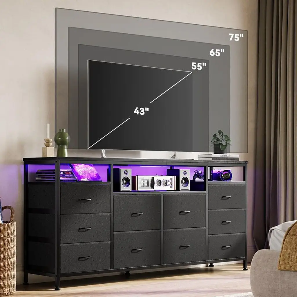 10 Drawer Dresser TV Stand for 65 70 75 Inch TV, 63" W Long Fabric Dresser Entertainment Center, Chest of Drawers Dresser for Bedroom with Led Lights & Power Outlets