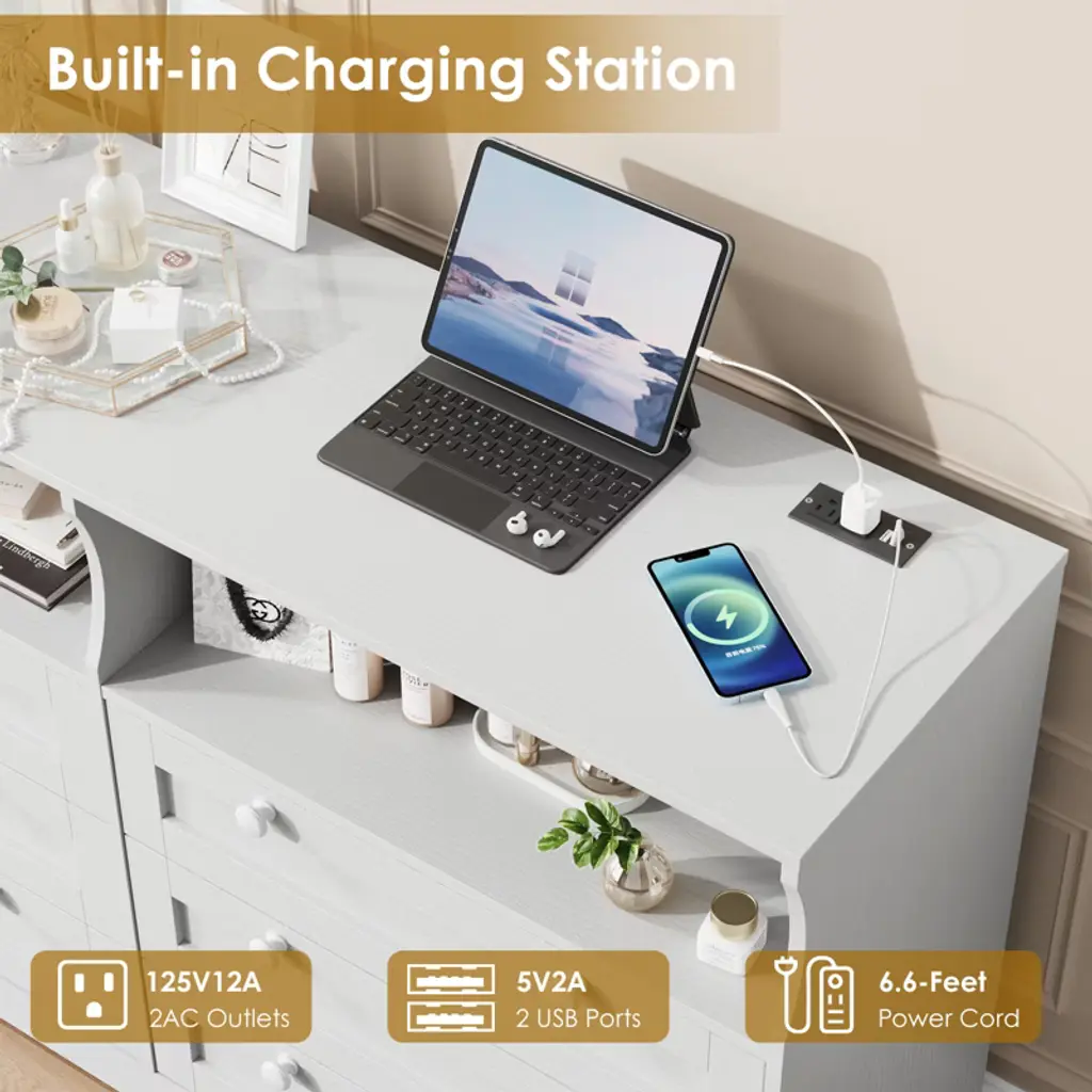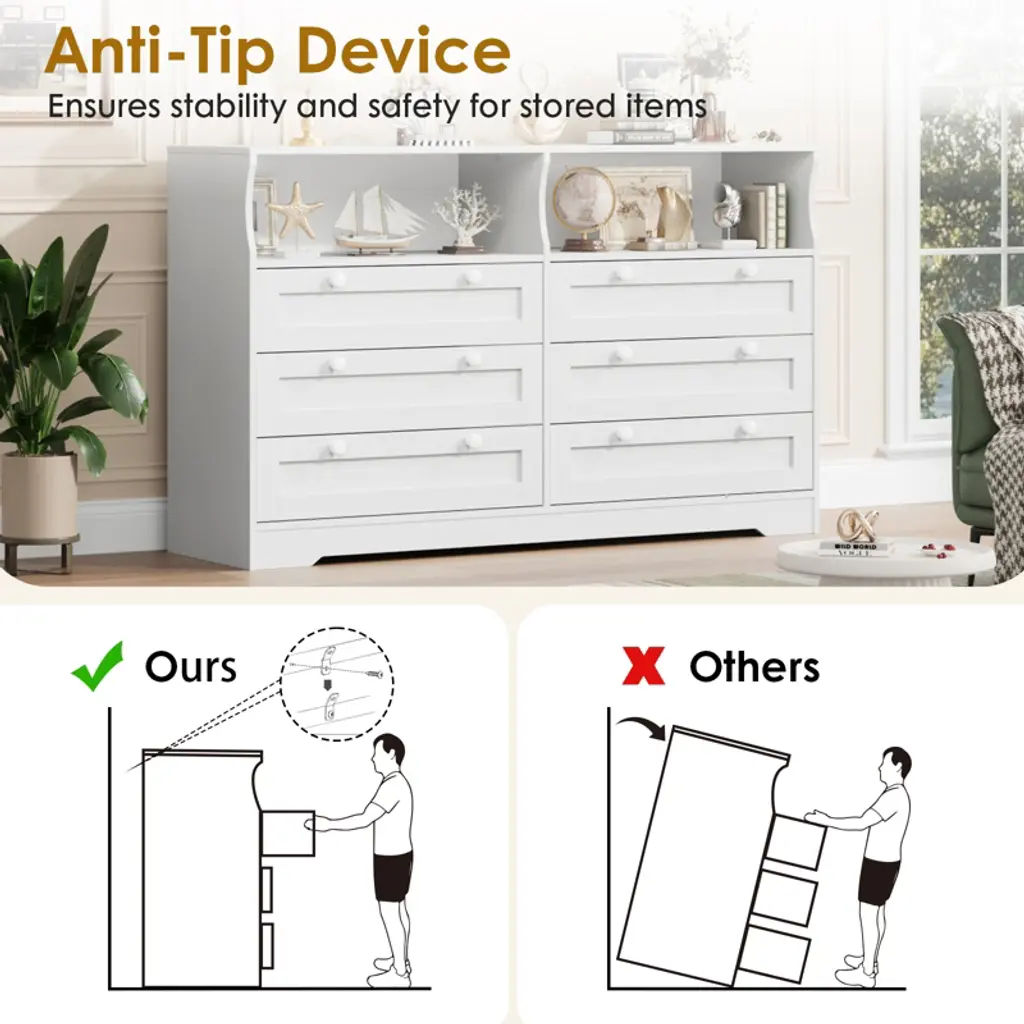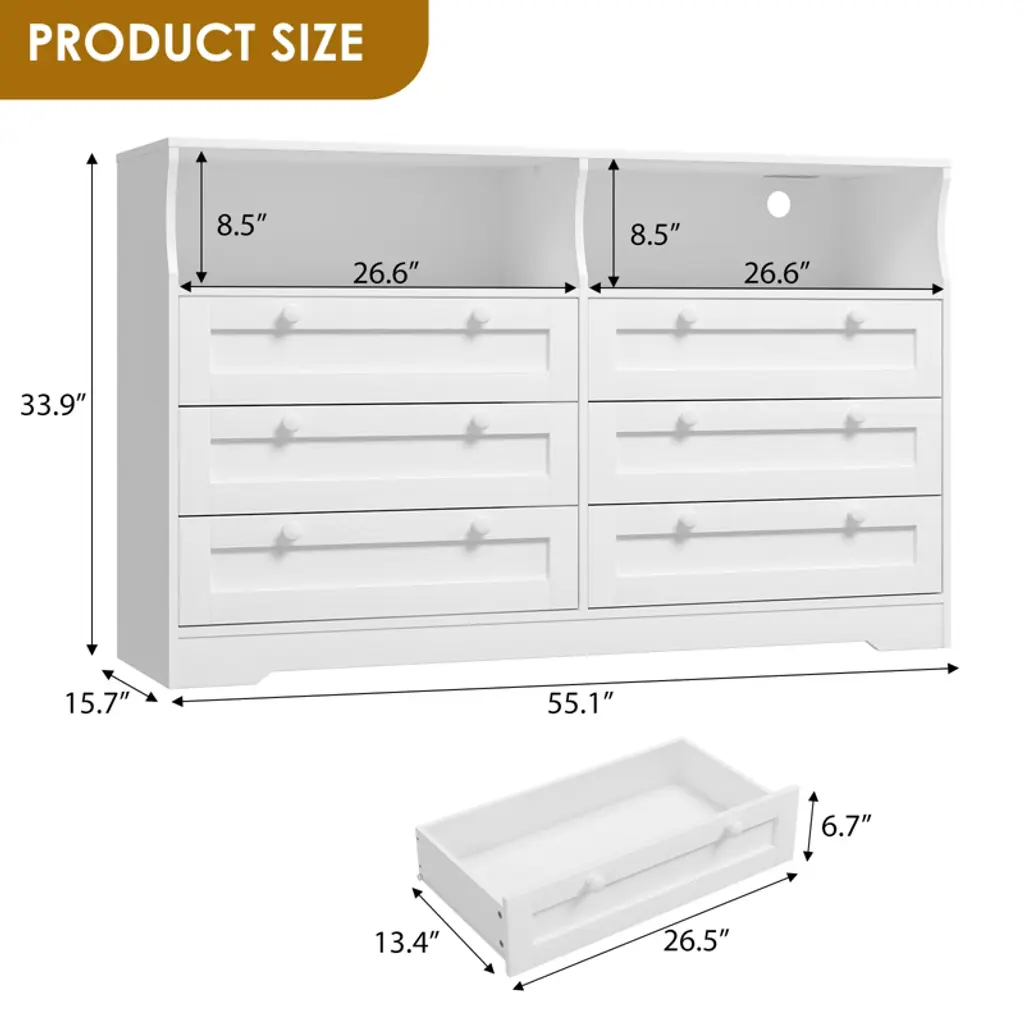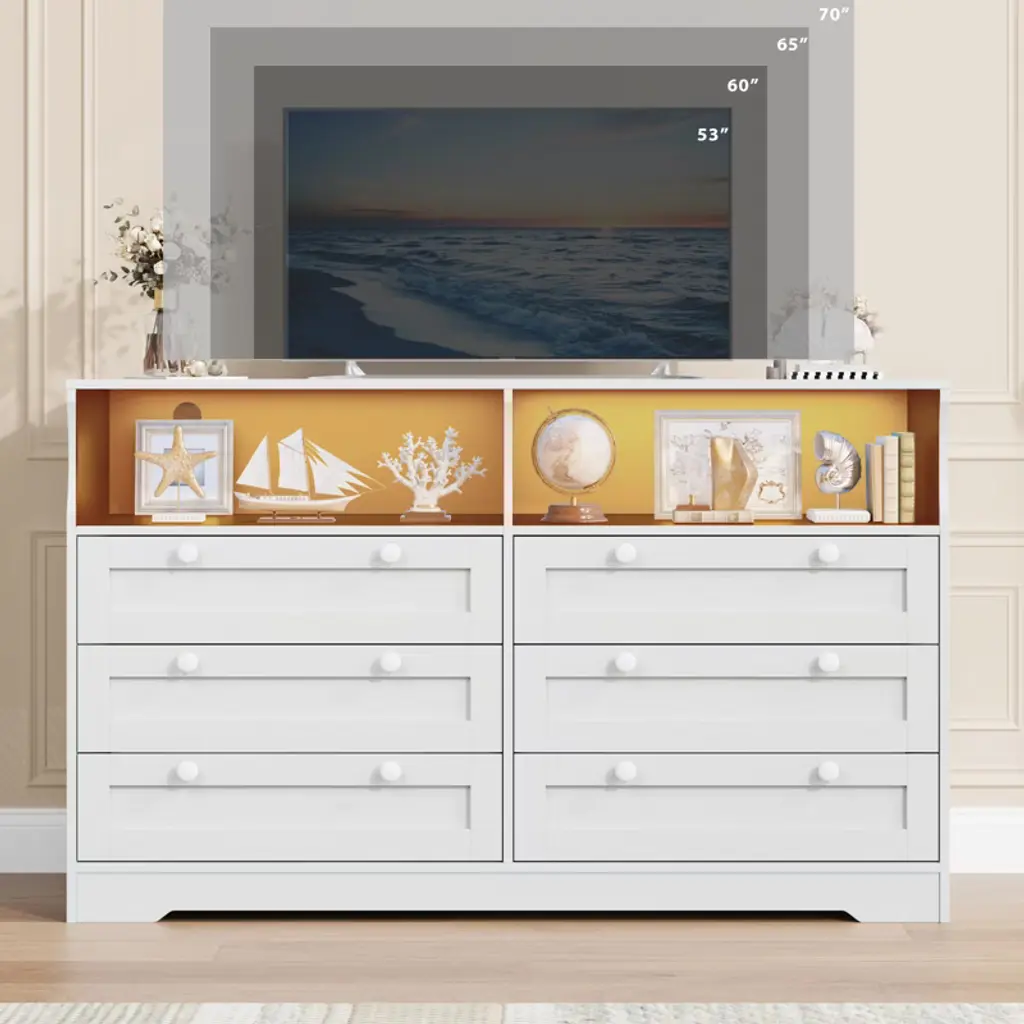 Enhance your living space with this 55" Modern TV Stand and Wood Chest of Drawers, designed to combine style, functionality, and convenience. Featuring six spacious drawers measuring 26.5" L x 13.4" D x 6.7" H, this dresser provides ample storage for clothing, blankets, and accessories, helping you keep your bedroom, living room, or hallway neat and organized. Two additional storage compartments and a generous tabletop offer extra space to display decor or store everyday essentials.