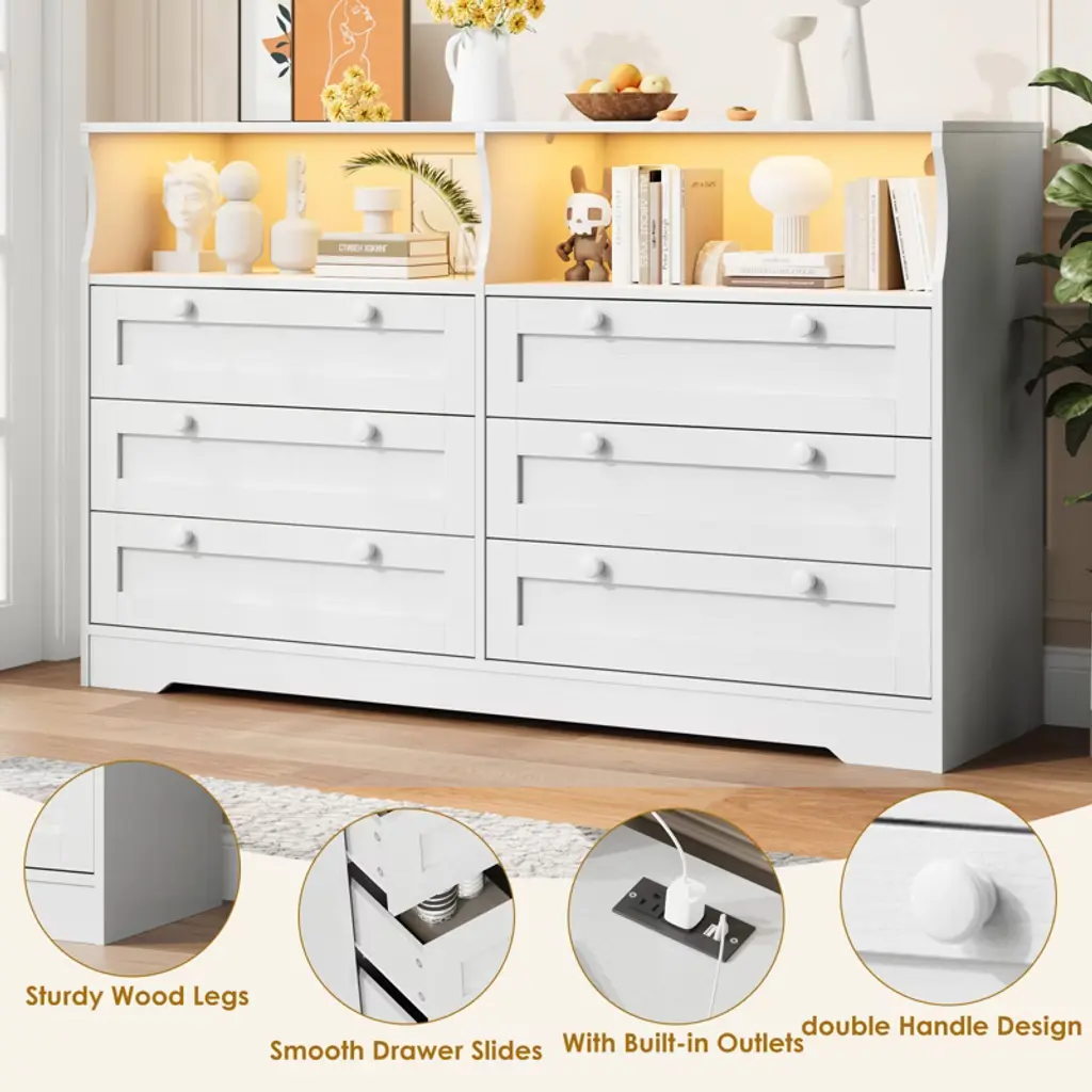 55" Modern Tv Stands, Wood Chest Of Drawers With Charging Station, Led Lights And 2 Storage Compartments, 6 Drawer Dresser For Living Room, Hallway