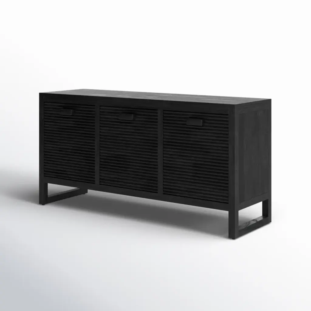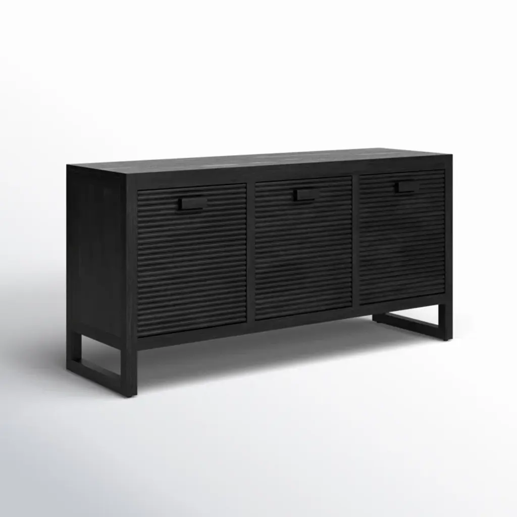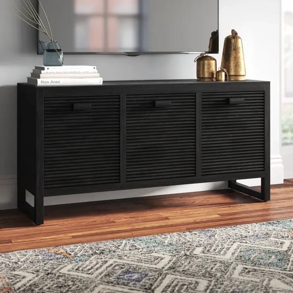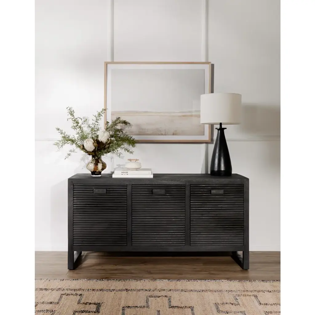 Reclaimed wood in a warm brown or black finish forms a beautifully substantial console, with carved reeding for a linear look. Rear cutouts for cord management.