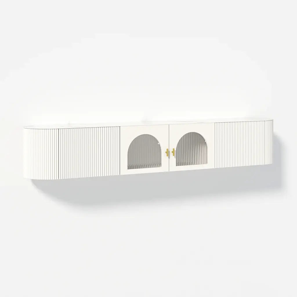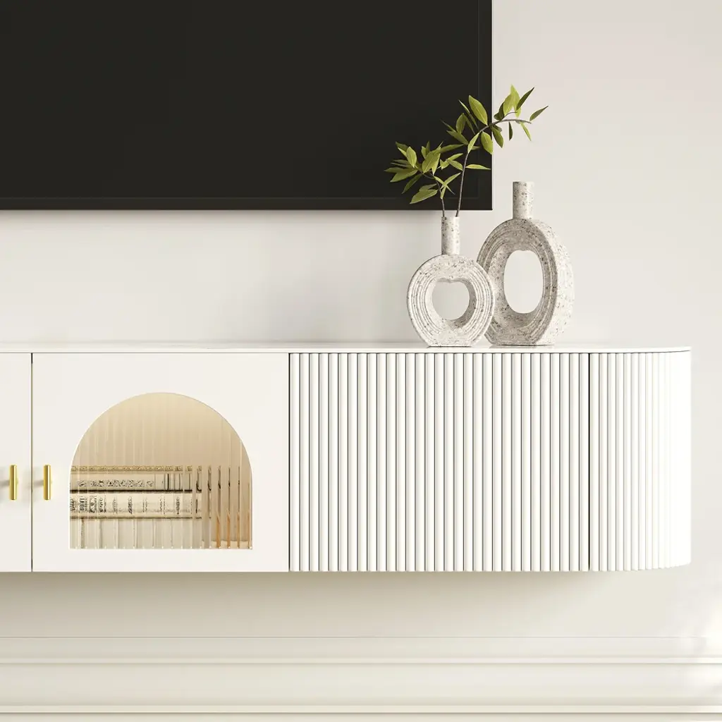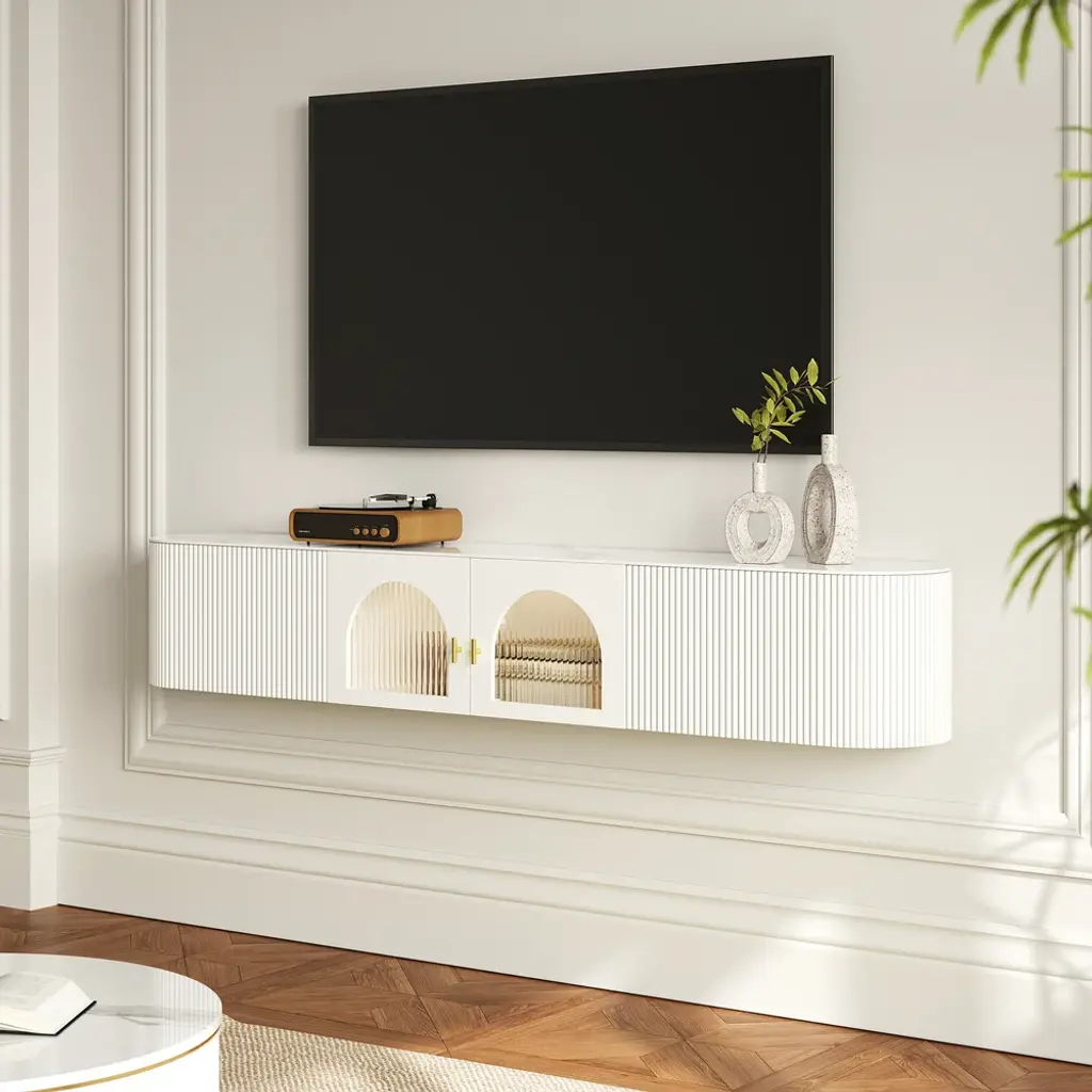 Upgrade your living room with this sleek and stylish floating TV stand. The cabinet’s arch-shaped doors add a touch of elegance, while the spacious interior provides ample storage for your media accessories. Perfect for saving space, this wall-mounted unit offers a clutter-free solution, keeping your floor area open and your room looking neat.