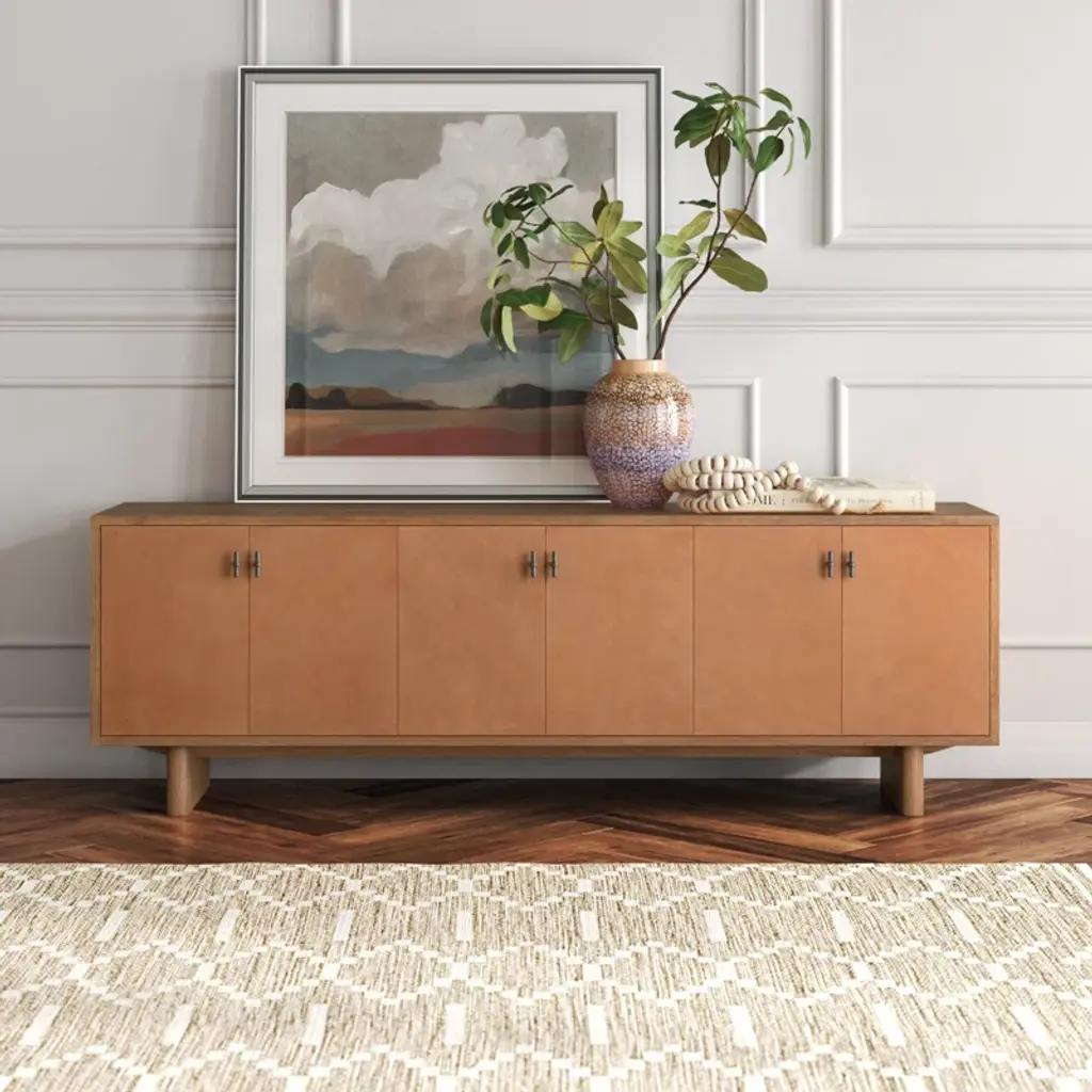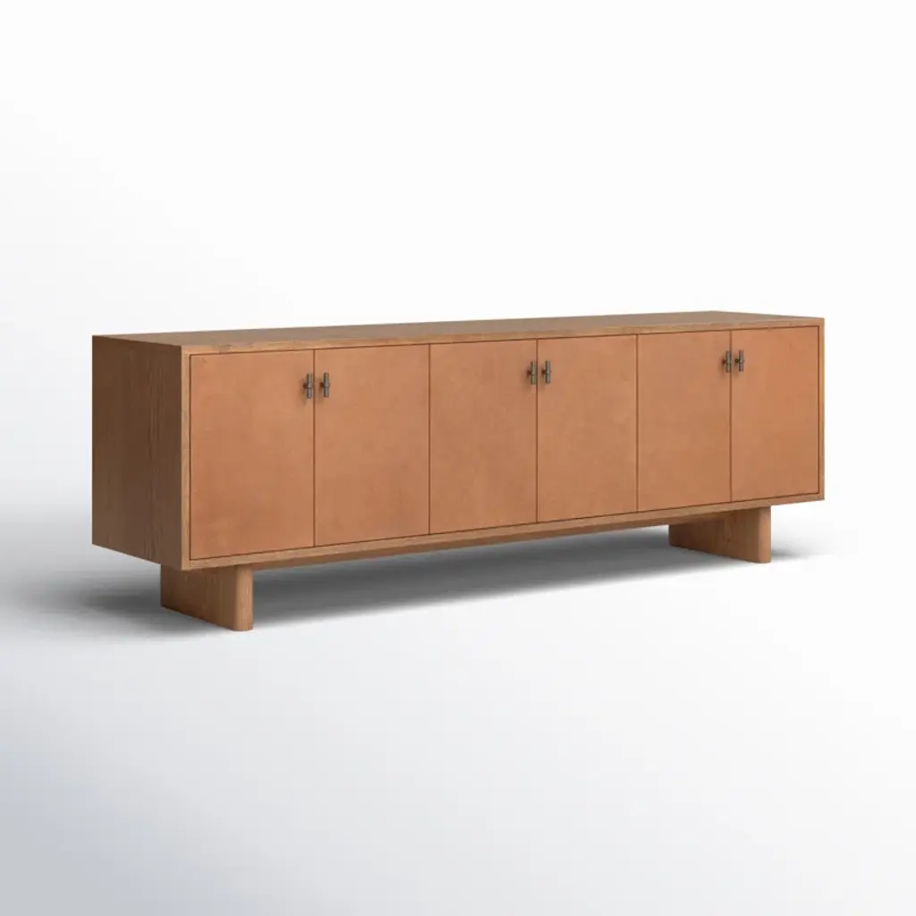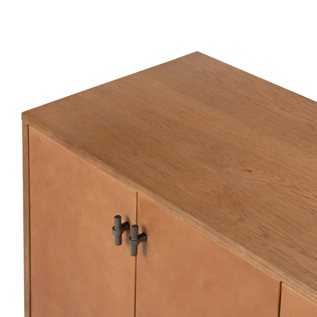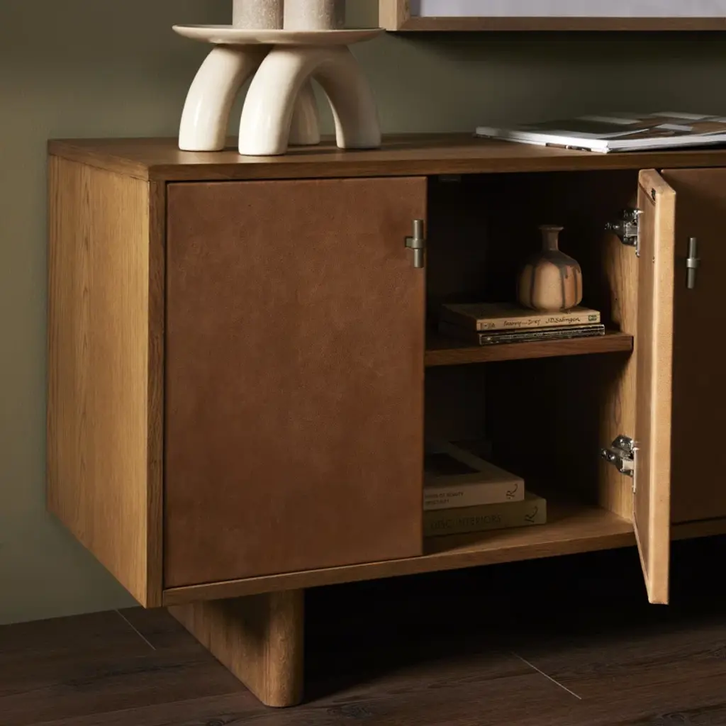 A storage-driven console of amber-finished oak features door fronts of top-grain leather in a rich cognac, with inset legs and cord cutouts.