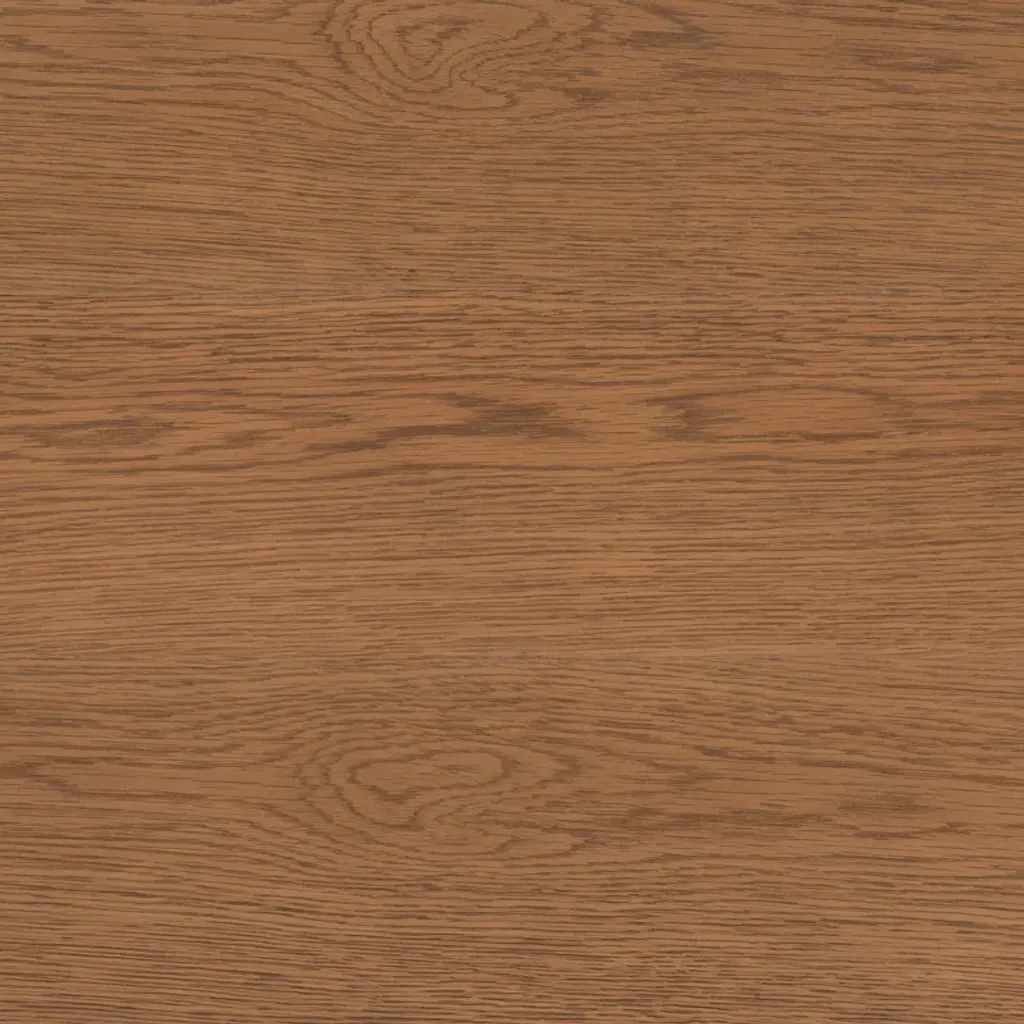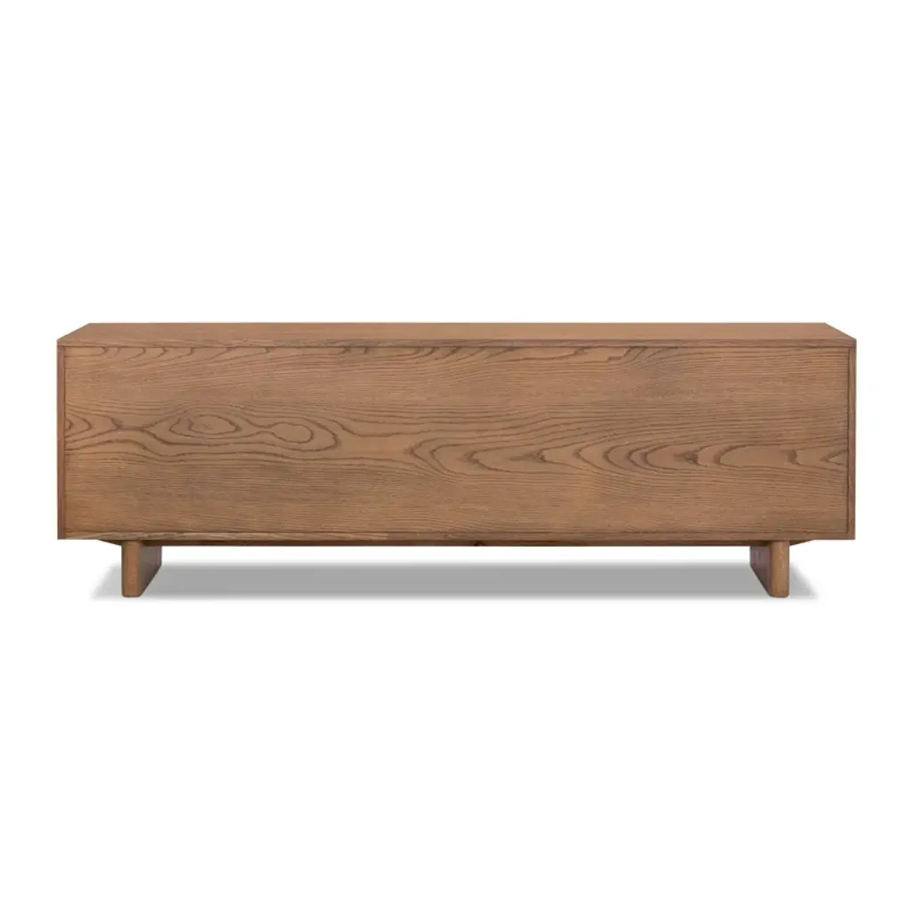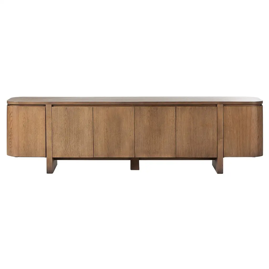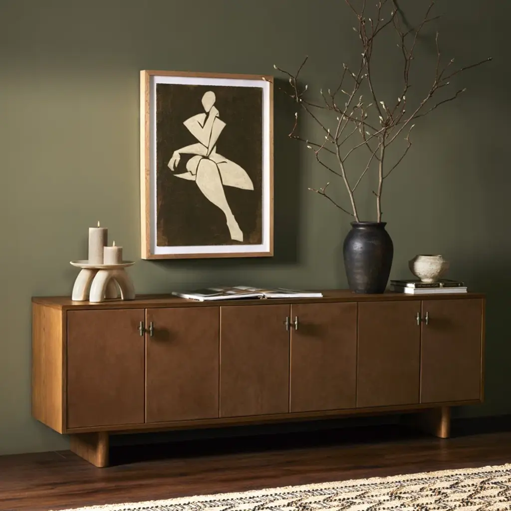 A storage-driven console of amber-finished oak features door fronts of top-grain leather in a rich cognac, with inset legs and cord cutouts.