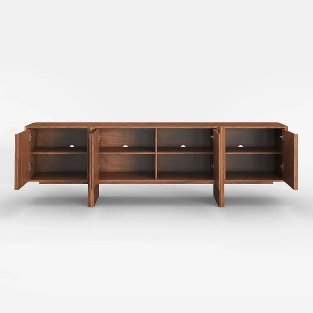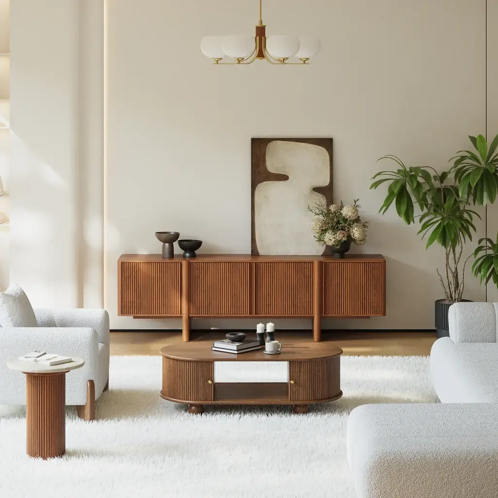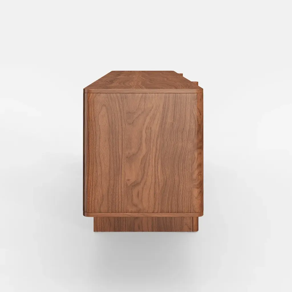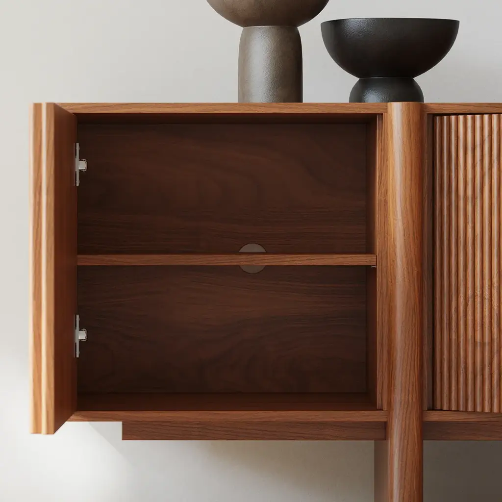Bring timeless style to your living space with this elegant TV stand. Featuring solid ash wood slatted doors and a walnut-veneered engineered wood body, it offers a perfect blend of texture and durability. A refined centerpiece with functional charm.