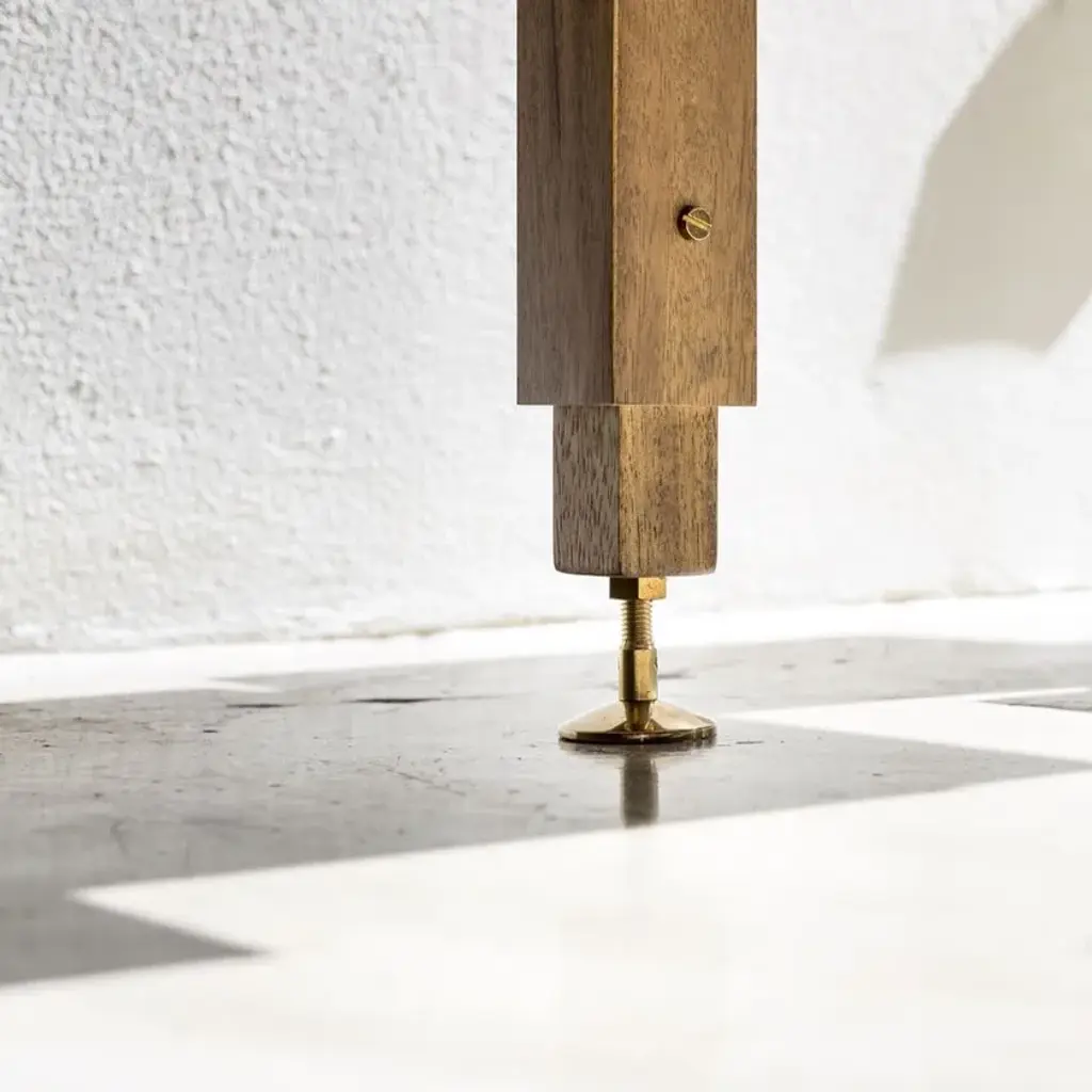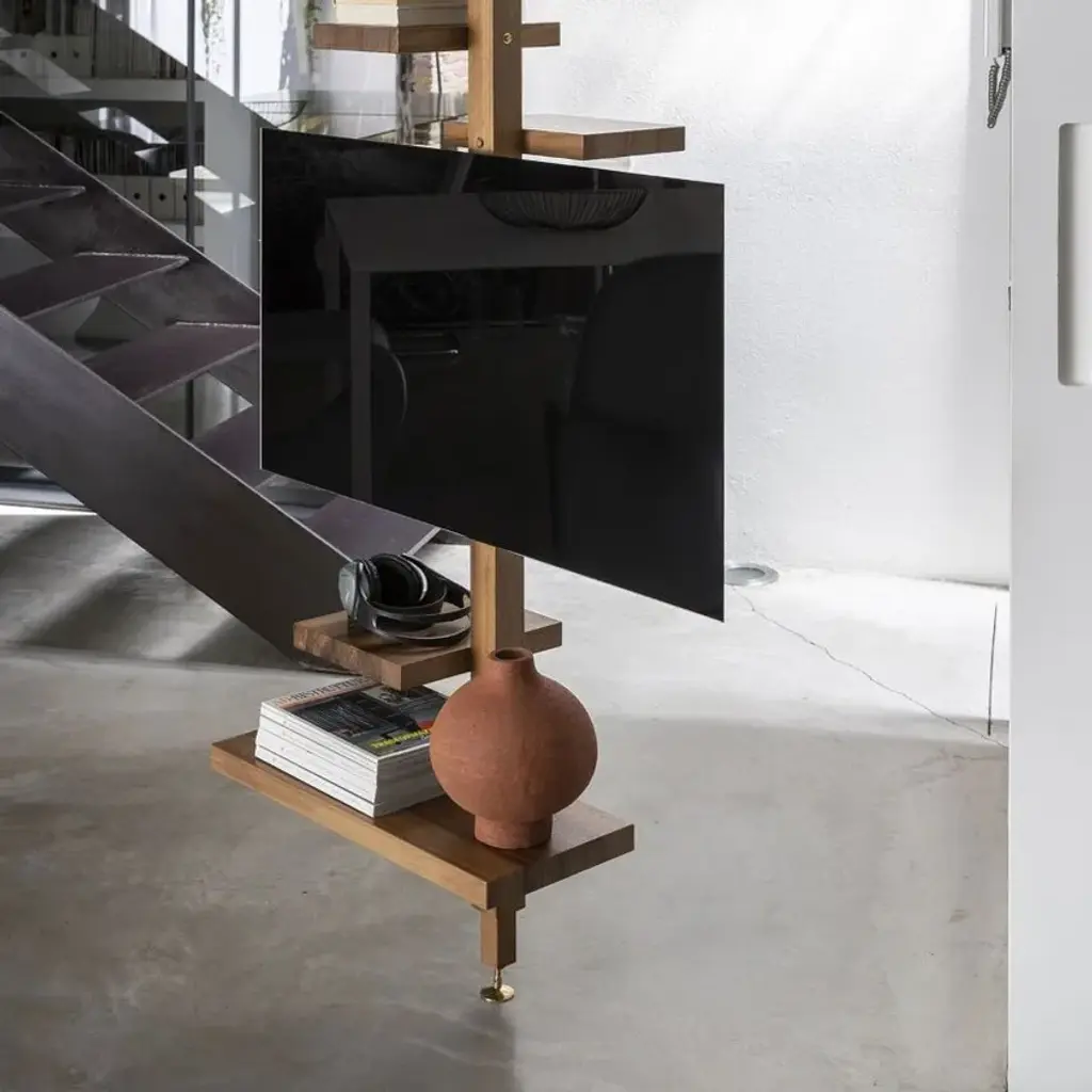 Adelaide is a floor-to-ceiling étagère in stained solid ash wood, featuring a cable management tube running from the bottom shelf to the TV mount. It comes complete with 9 shelves, a TV support compatible with VESA standards (mounting holes 20x20 and 40x40 cm), and a lower A-type end element. Designed for ceiling pressure installation or wall mounting using the complementary structural components. A top end element (A-B-C) must be selected based on the ceiling height (from 236 to 344 cm). Feet and screws come in a brass finish. The structure can rotate up to 180° in both directions. Suitable for TVs up to 65 inches.WARNING: For installation on plasterboard ceilings and/or suspended ceilings, please order the appropriate wall or ceiling mounting systems.