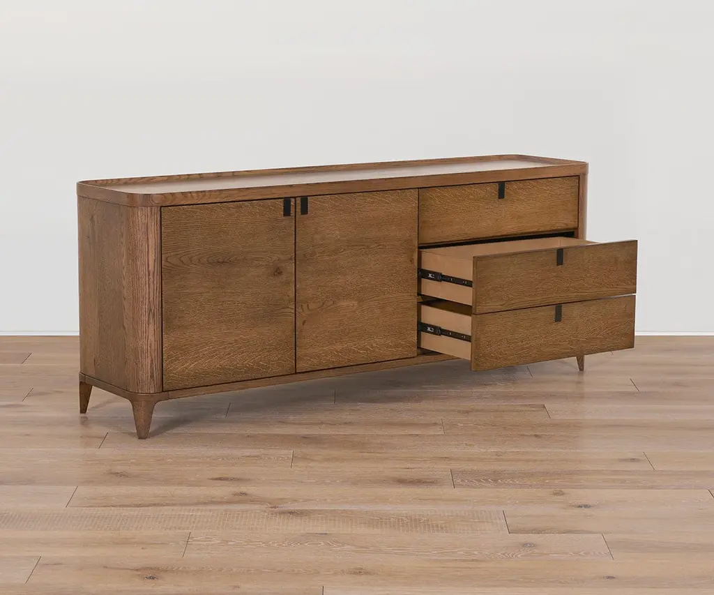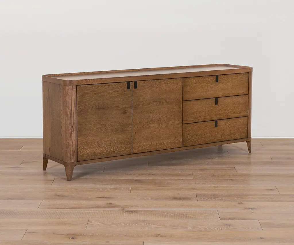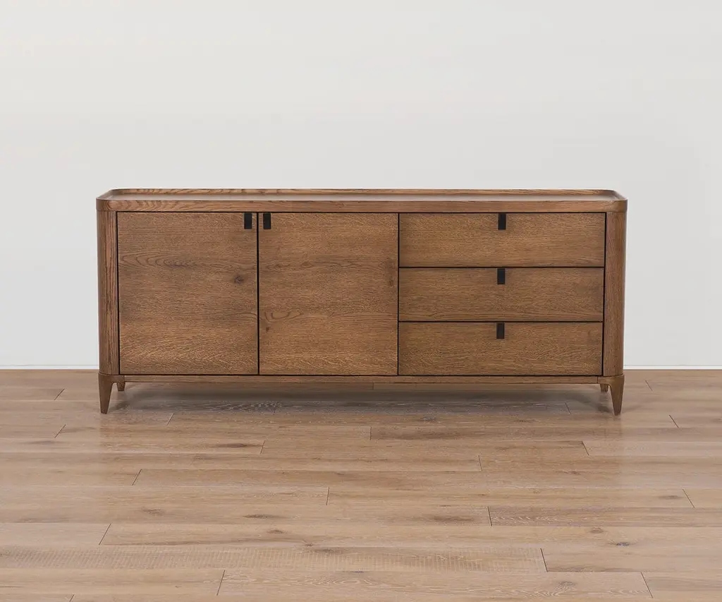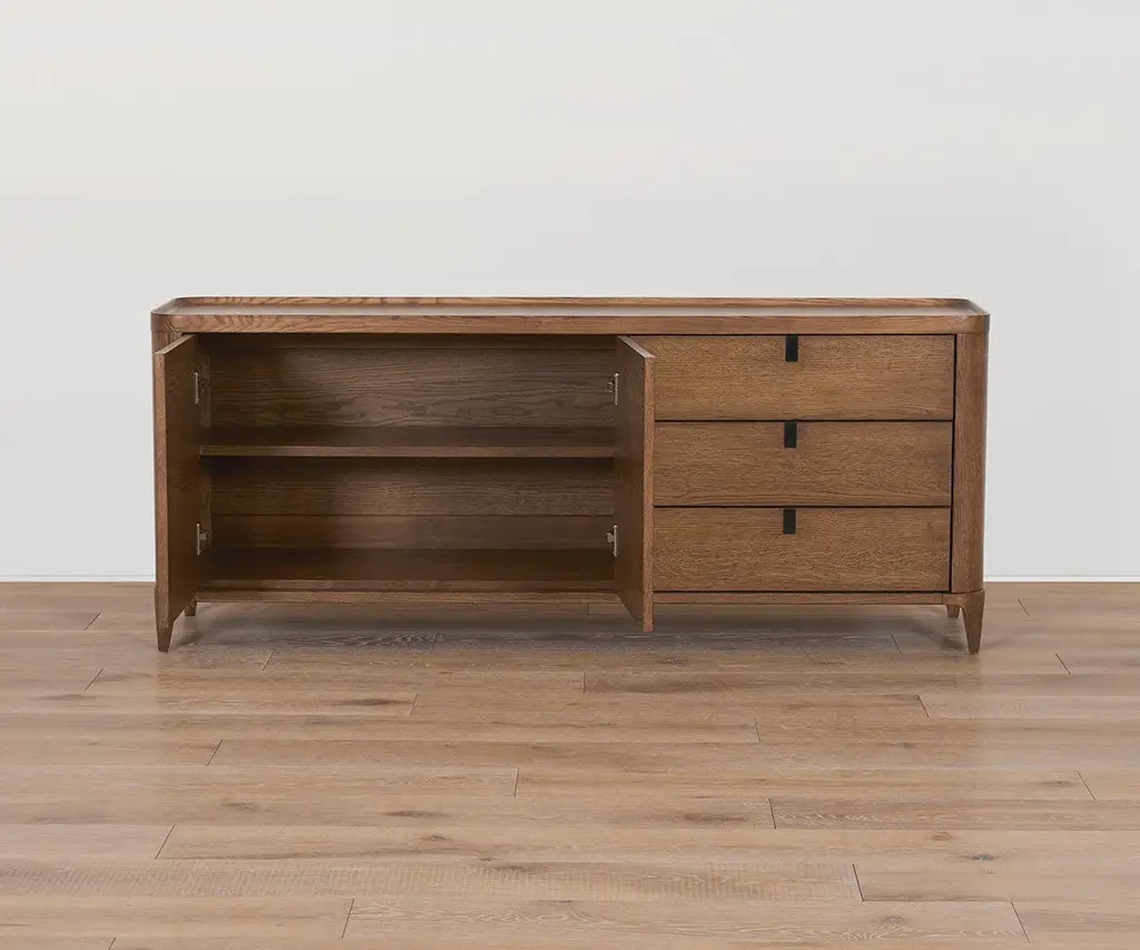 Crafted from solid oak with a beautiful dark finish, the mid-century Aden Media Stand features a versatile design that's rounded at the edges for a softer, sleeker look. Other enhancements include drawer pulls that pop in and out to maintain a minimalist profile, a unique lip around the top edge, and soft-close drawers and doors to protect fingers and contents. Mix and match it with other pieces in the Aden Collection to create a stylish, complementary set.