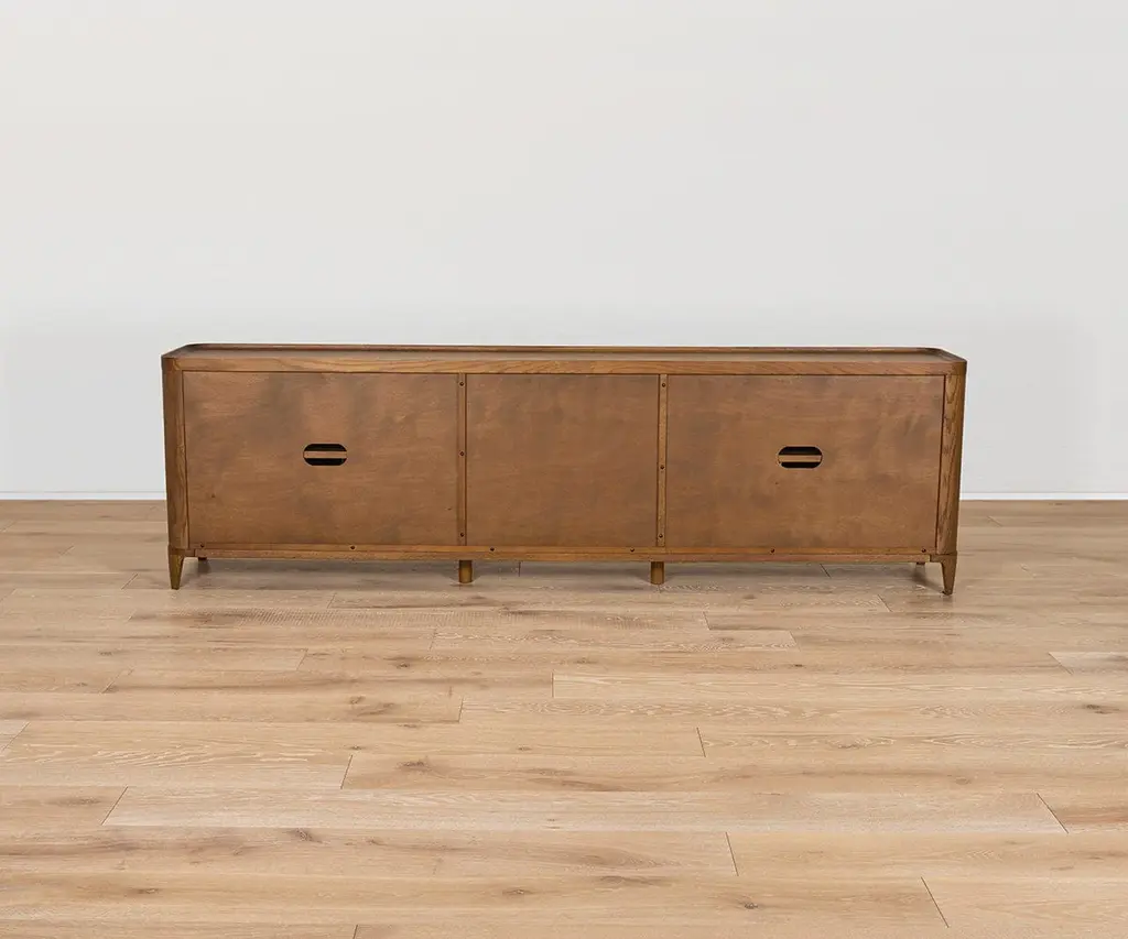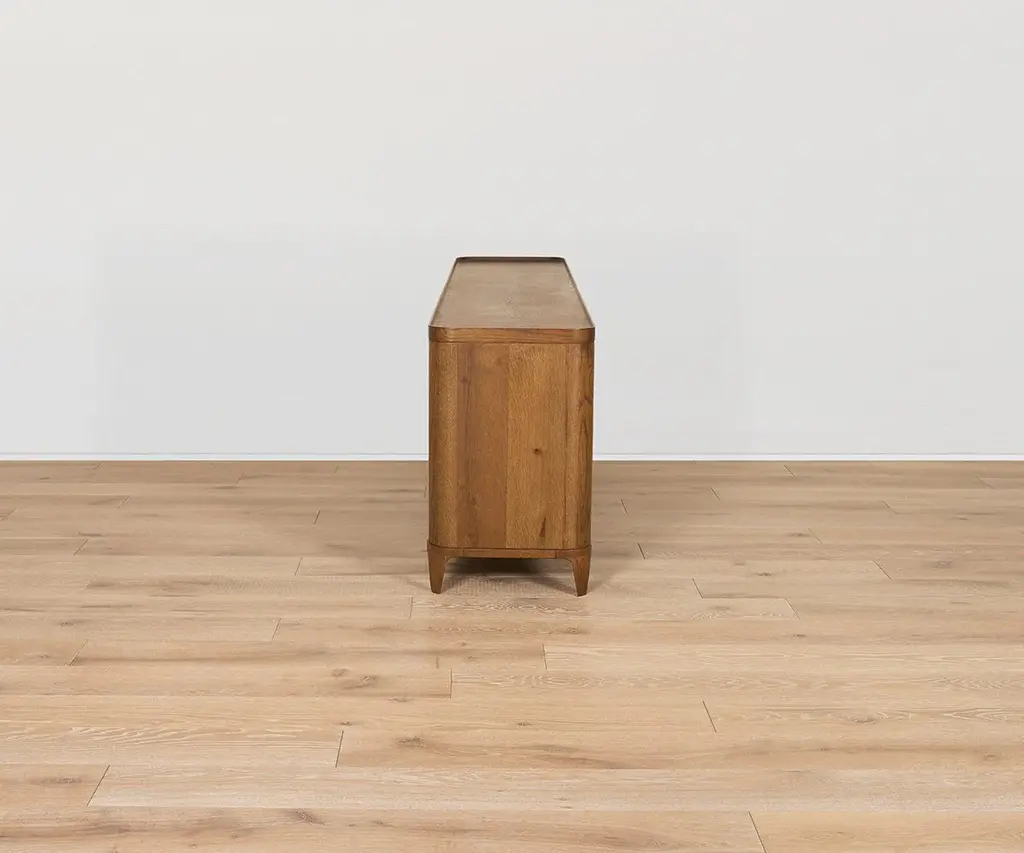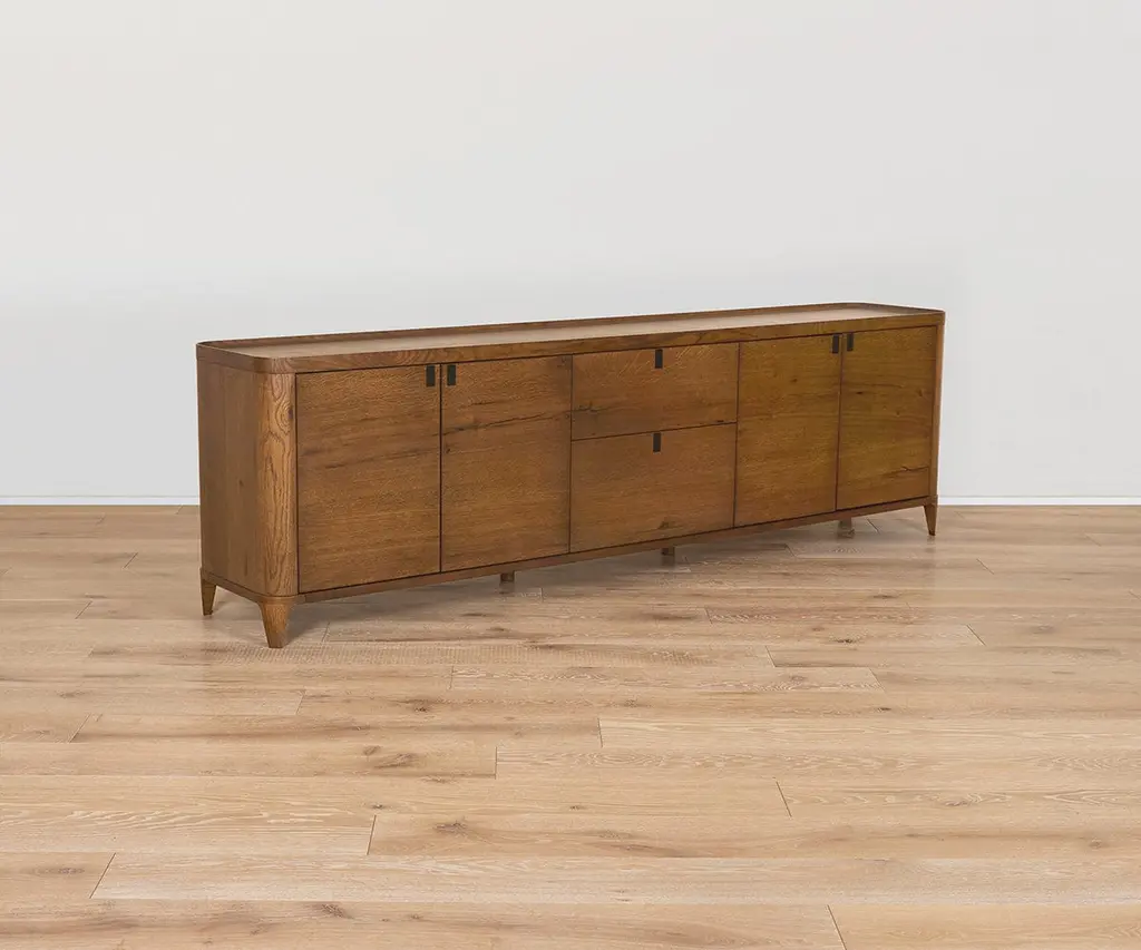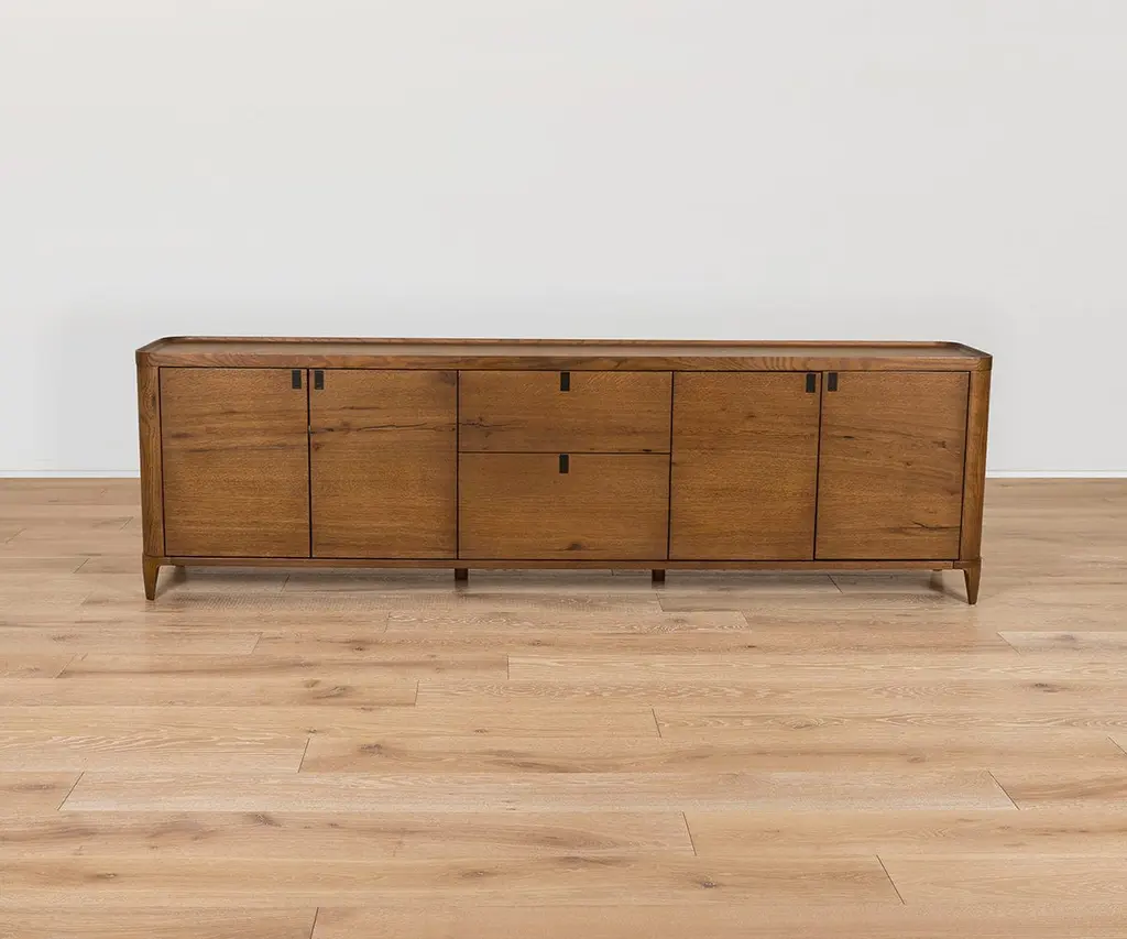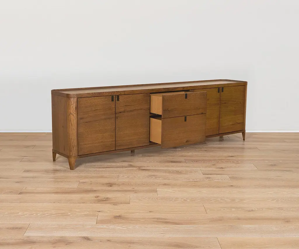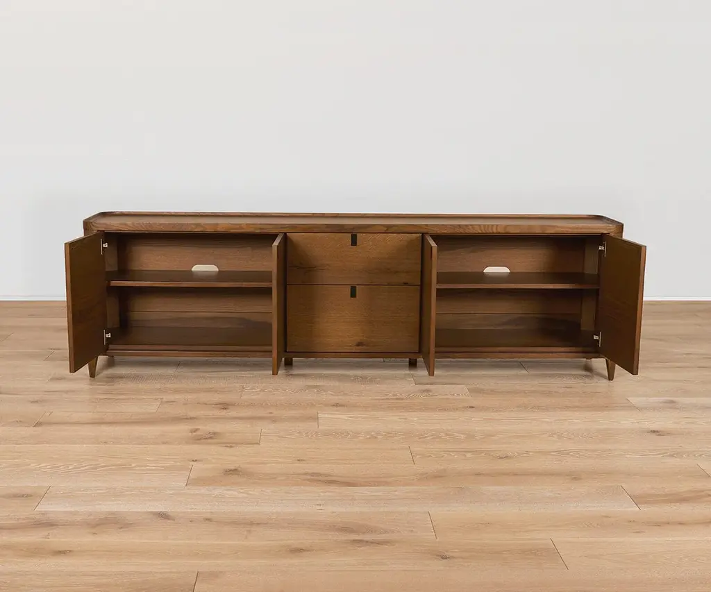 Crafted from solid oak with a beautiful dark finish, the mid-century Aden Media Stand features a versatile design that's rounded at the edges for a softer, sleeker look. Other enhancements include drawer pulls that pop in and out to maintain a minimalist profile, a unique lip around the top edge, and soft-close drawers and doors to protect fingers and contents. Mix and match it with other pieces in the Aden Collection to create a stylish, complementary set.