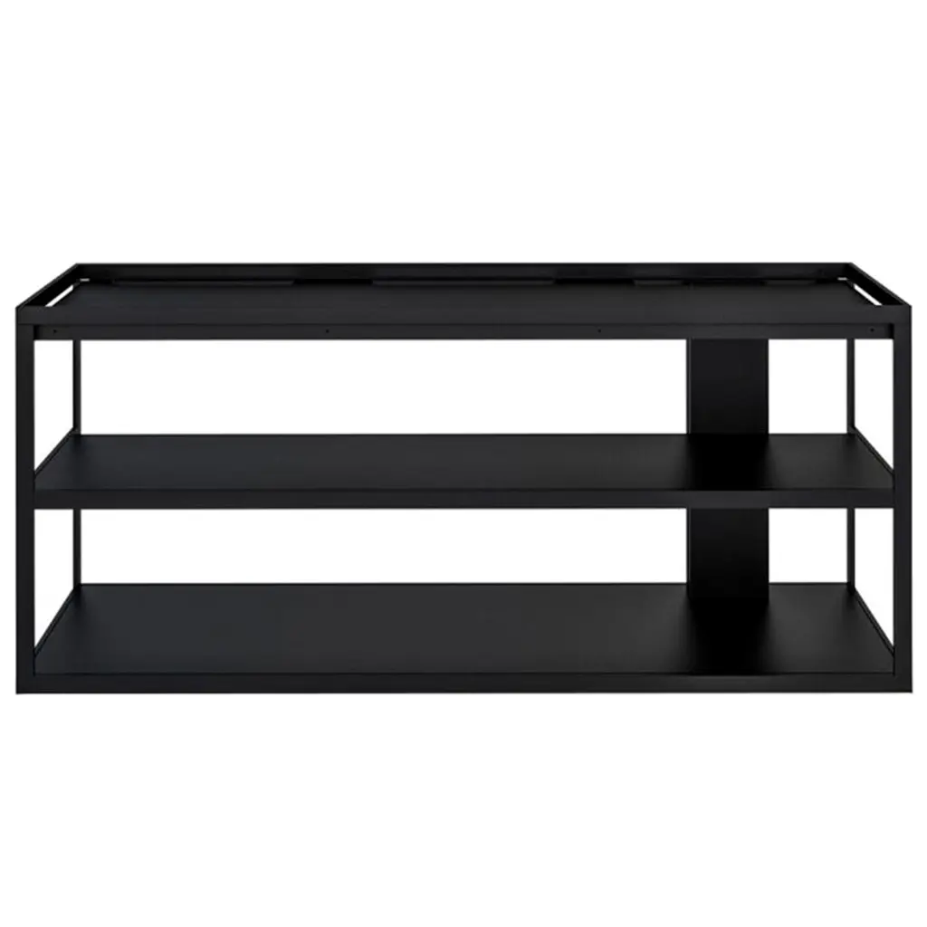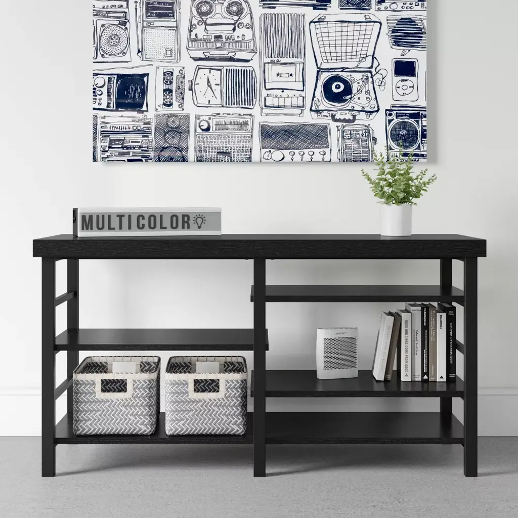 Organize your entertainment space or media room with the Adjustable Storage Media Stand from Room Essentials™. Standing atop a metal frame for durability and lasting use, this media console features adjustable shelves that give you flexible and customized options to store and display your media, electronics or books with ease, while the sturdy tabletop provides a base for placing framed photographs, succulents or other decorative items. Showcasing a matte black finish with an open design and sleek lines, this decorative media stand fills your space with contemporary and modern flair.Overall Height: 25"Overall Width: 47 1/4"Overall Depth: 19"Shelf Width: 21 1/8"