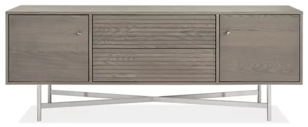 Make a statement with the Adrian media cabinet. Louvered center drawers crafted from a solid wood panel add unexpected texture and feature push-to-open functionality, while sleek soft-close doors on each side balance out the design. Hourglass door knobs are a delicate detail on this piece. The cabinet is made entirely of domestically sourced solid wood and sits atop a unique X-base steel frame with rounded tube legs that play back to the soft shape of the hardware. Beautiful and extremely well crafted of U.S. and imported materials, Adrian is a unique testament to modern design and American craftsmanship.