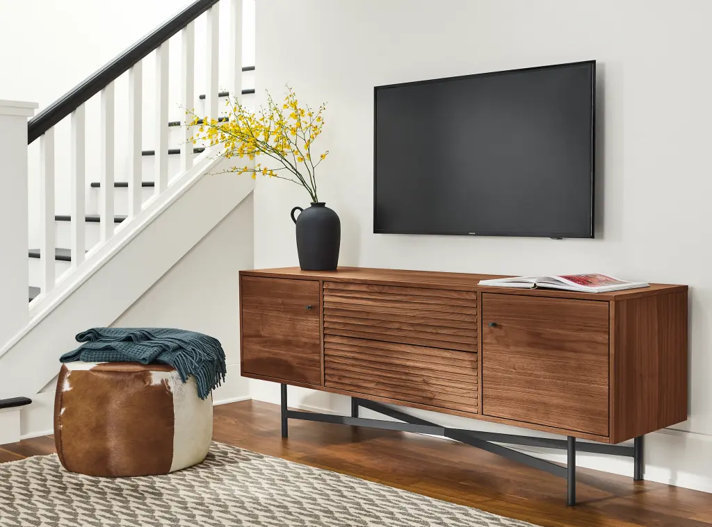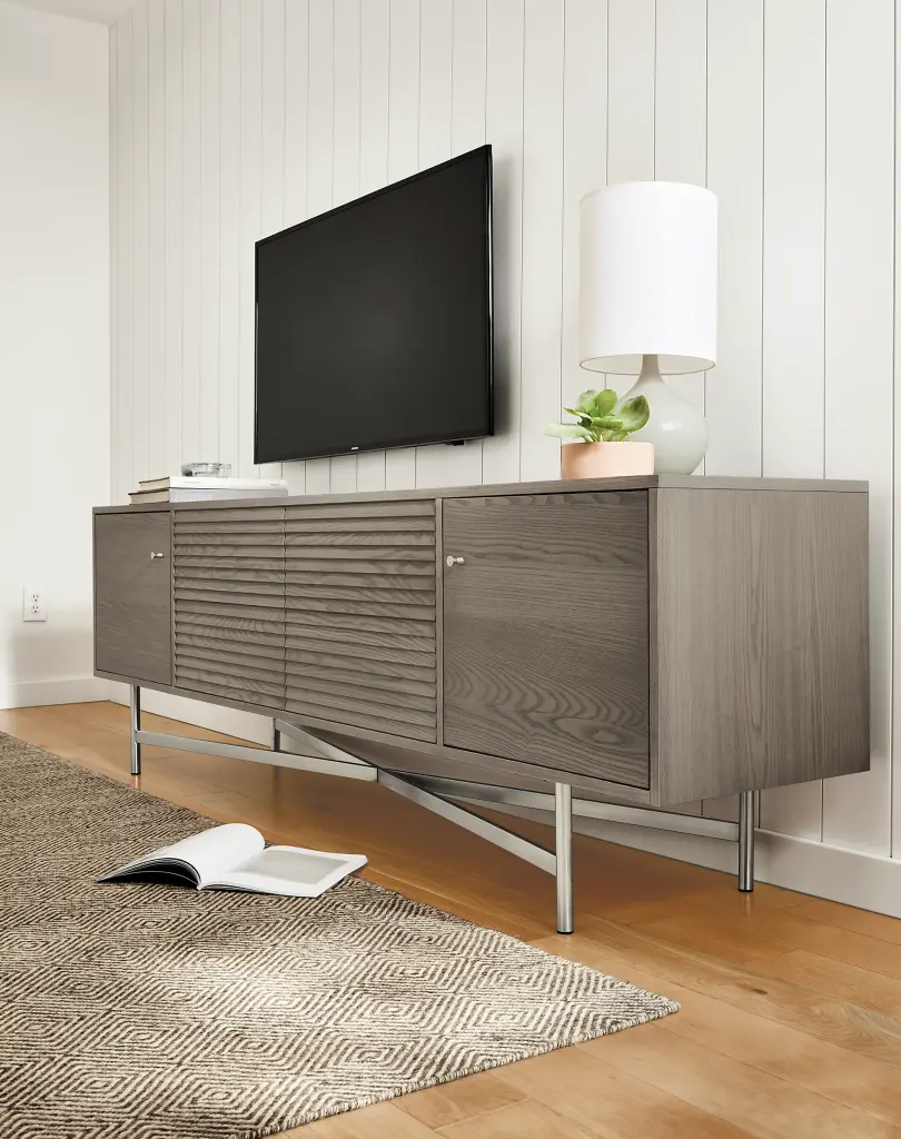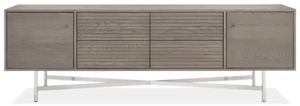 Make a statement with the Adrian media cabinet. Louvered center drawers crafted from a solid wood panel add unexpected texture and feature push-to-open functionality, while sleek soft-close doors on each side balance out the design. Hourglass door knobs are a delicate detail on this piece. The cabinet is made entirely of domestically sourced solid wood and sits atop a unique X-base steel frame with rounded tube legs that play back to the soft shape of the hardware. Beautiful and extremely well crafted of U.S. and imported materials, Adrian is a unique testament to modern design and American craftsmanship.