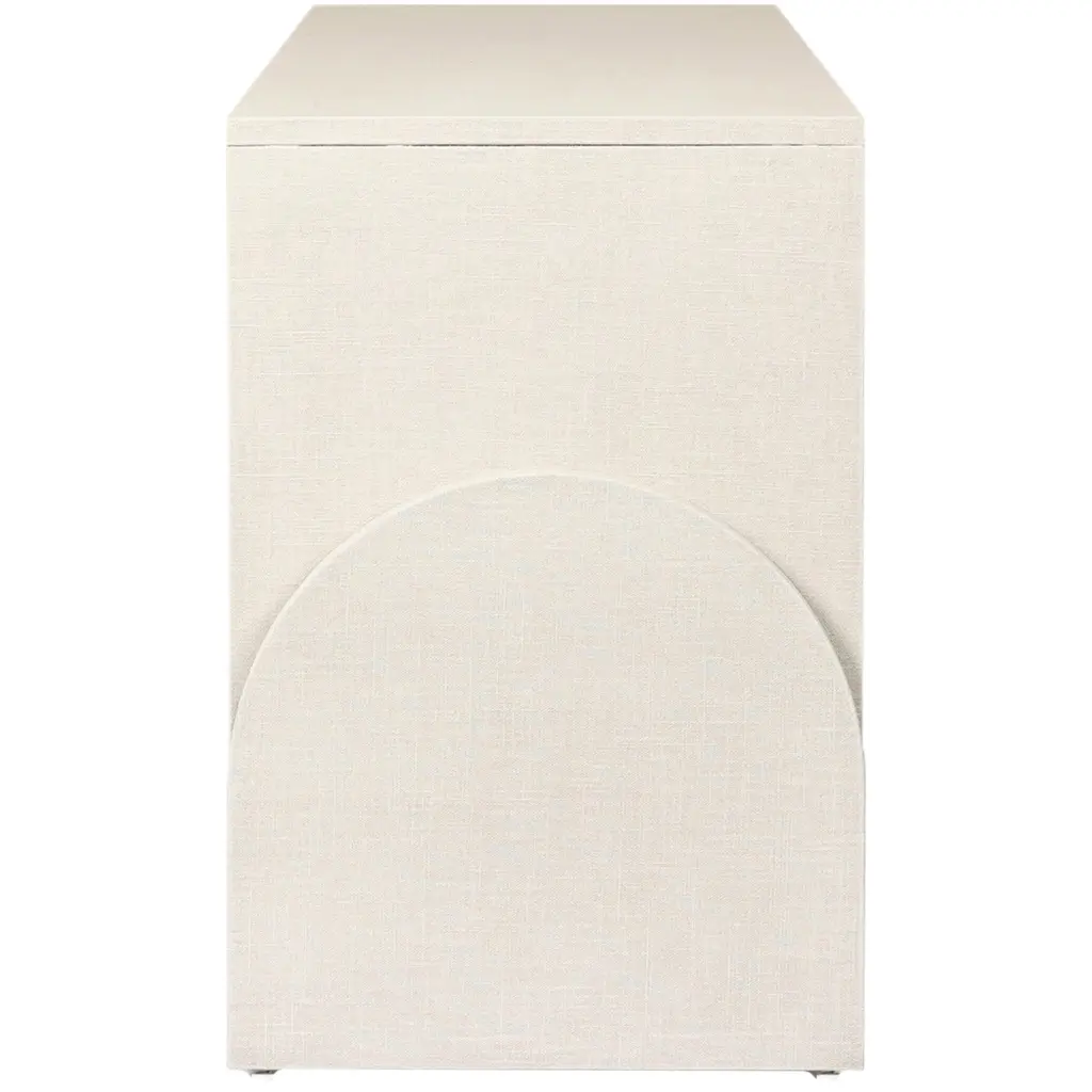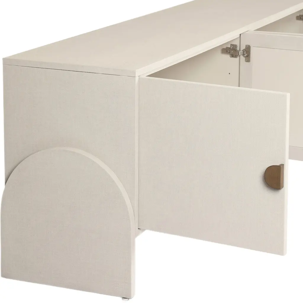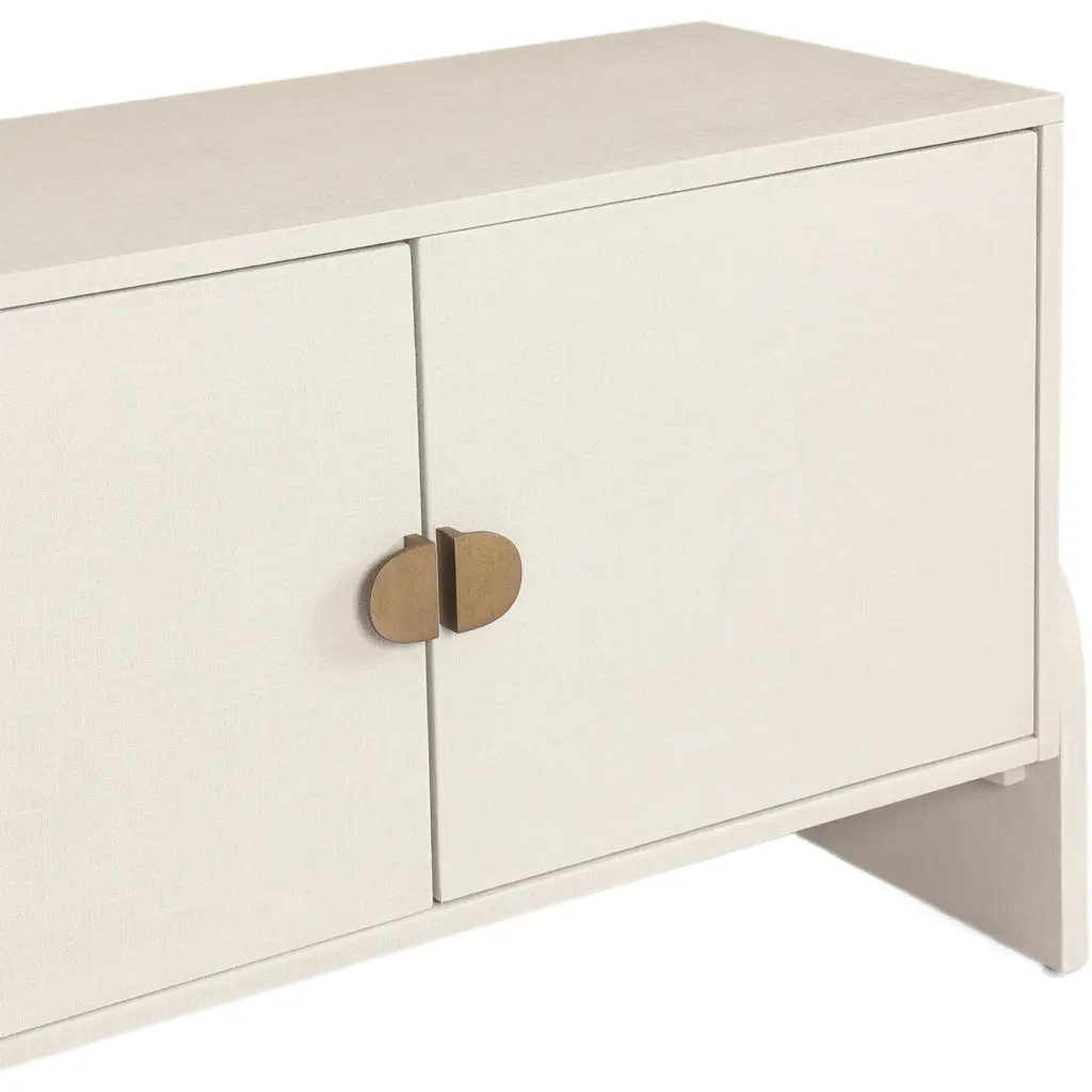 The Aeris Media Console is a true novelty in design. Crafted from painted linen in a light ivory hue, its arched legs introduce a gentle softness to the otherwise clean and modern lines. The console is elegantly finished with antique brass, half-moon iron hardware, adding a touch of sophistication to its media storage capabilities. Thoughtfully designed with dual rear cutouts, it ensures seamless cord management for your convenience.