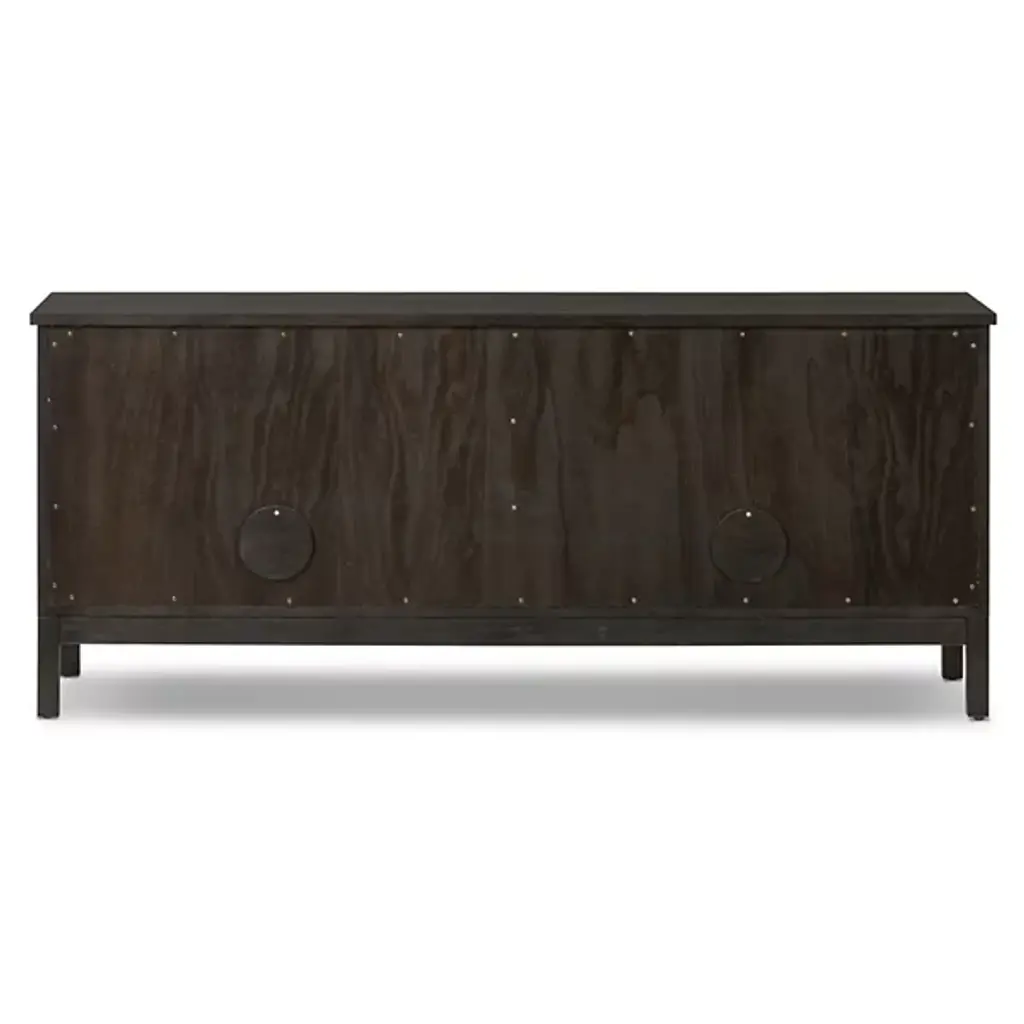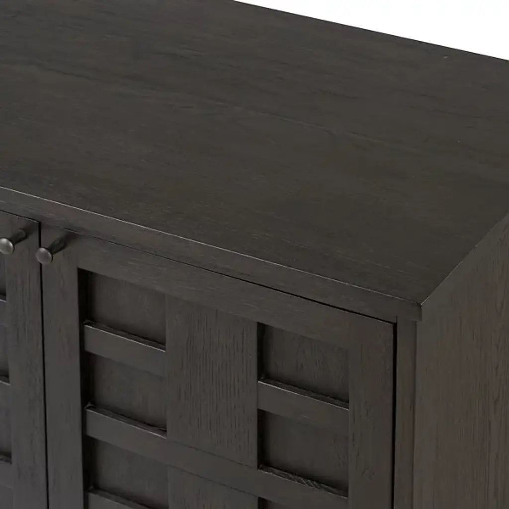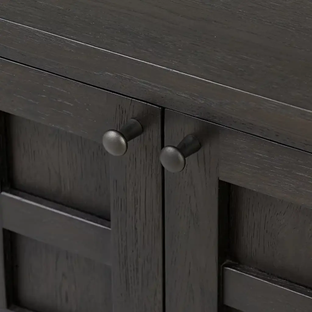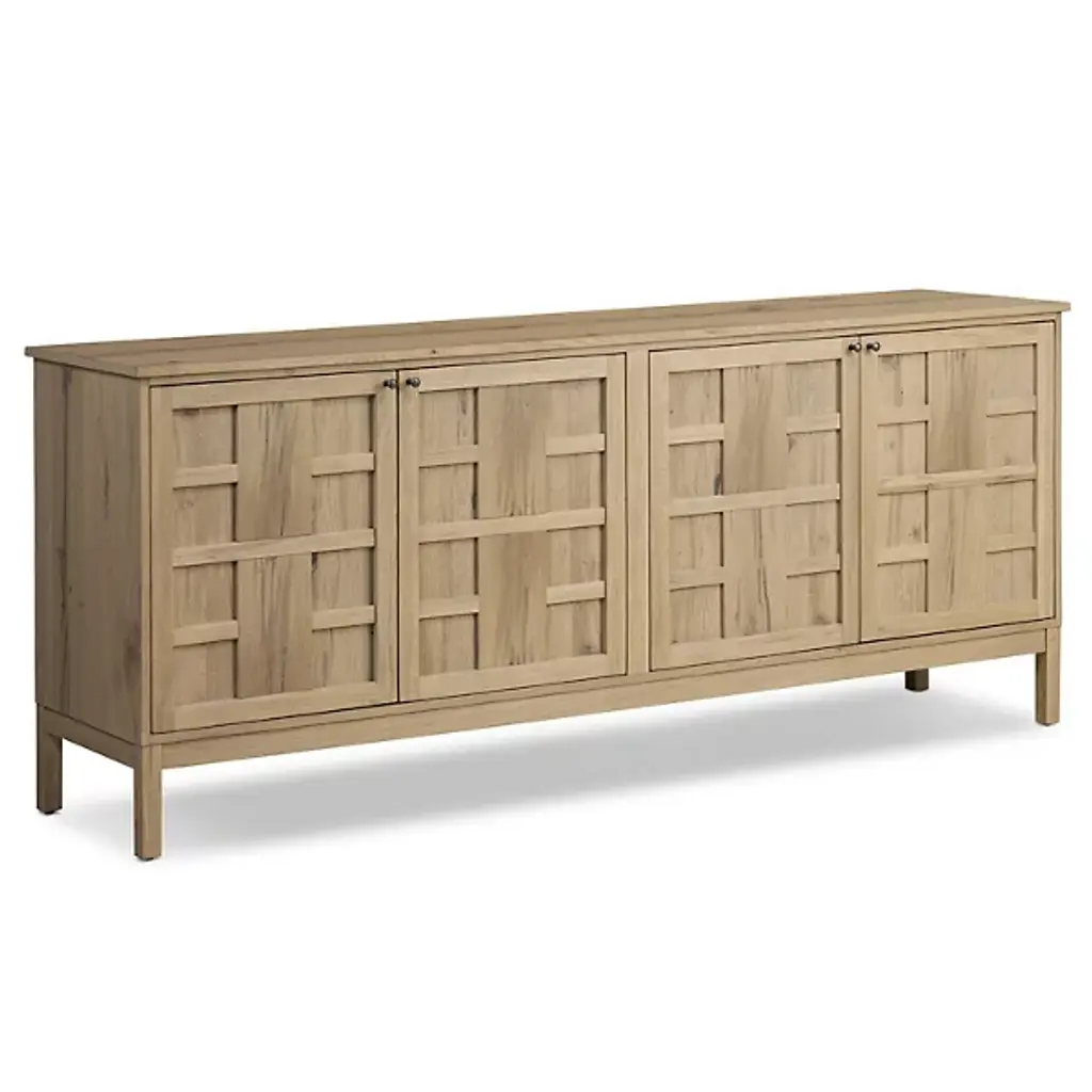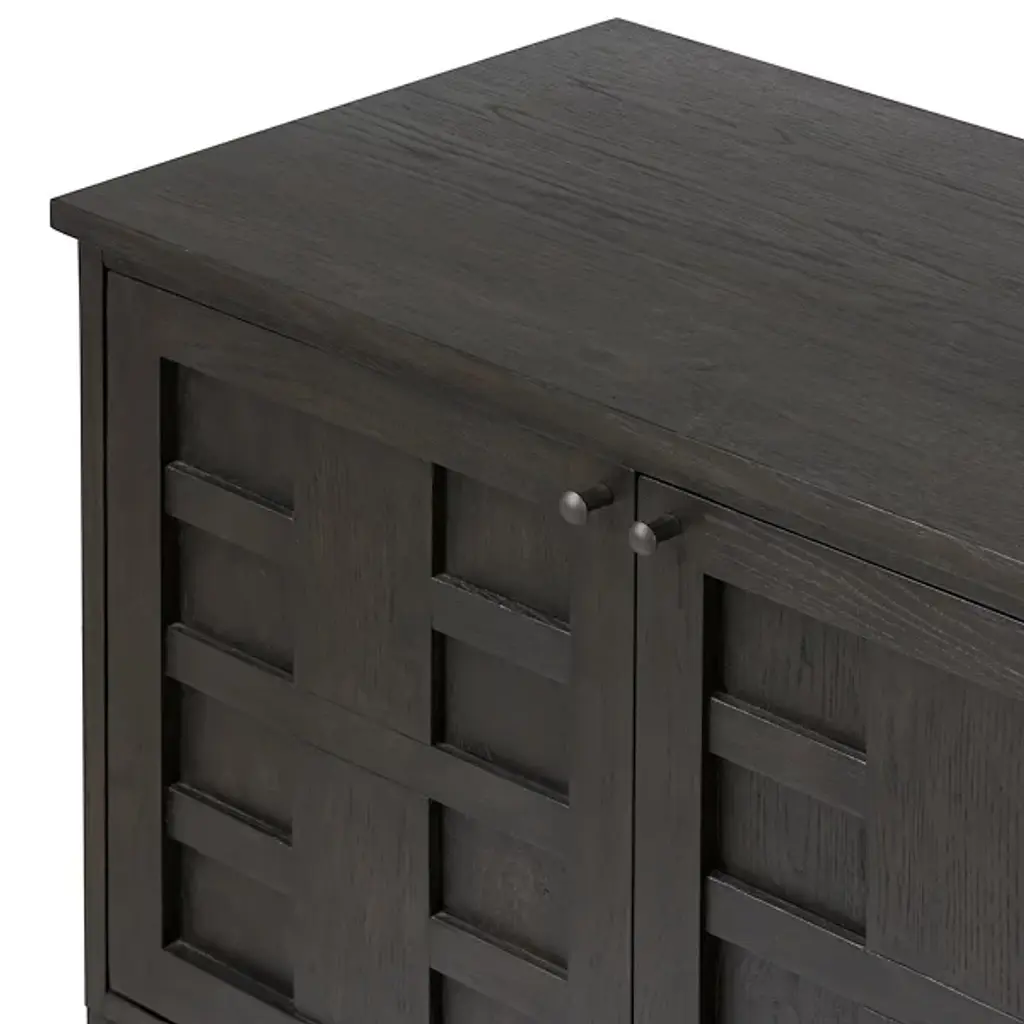 The Alessio Media Console from Four Hands shows off a refined transitional character able to stand out in a crowd. It’s a rectangular construction of solid oak with a fine finish, showing off minute imperfections and the graining. The console top overhangs four doors with grid-style patterns, while four slim block legs add air underneath. The knots and cracks contrast well with the fine design, while cord management cutouts add a bit of functional flexibility.