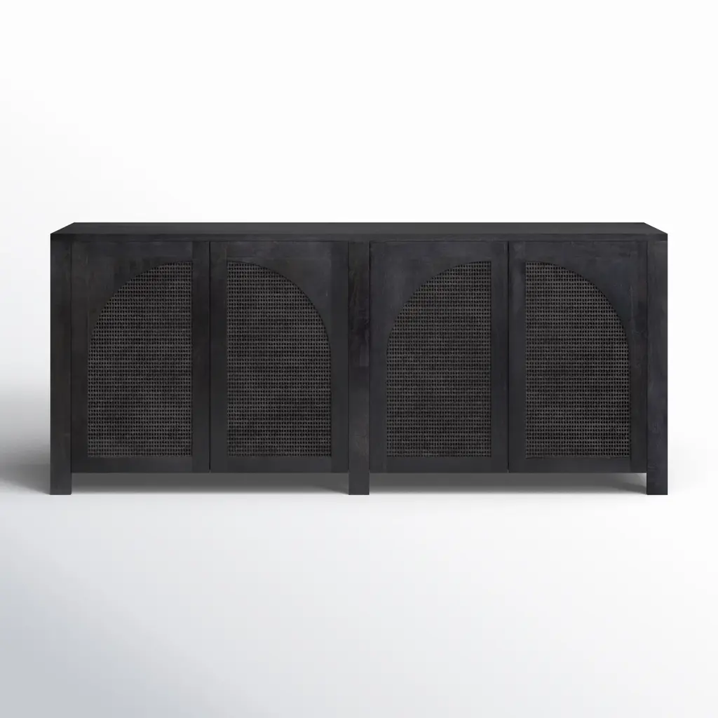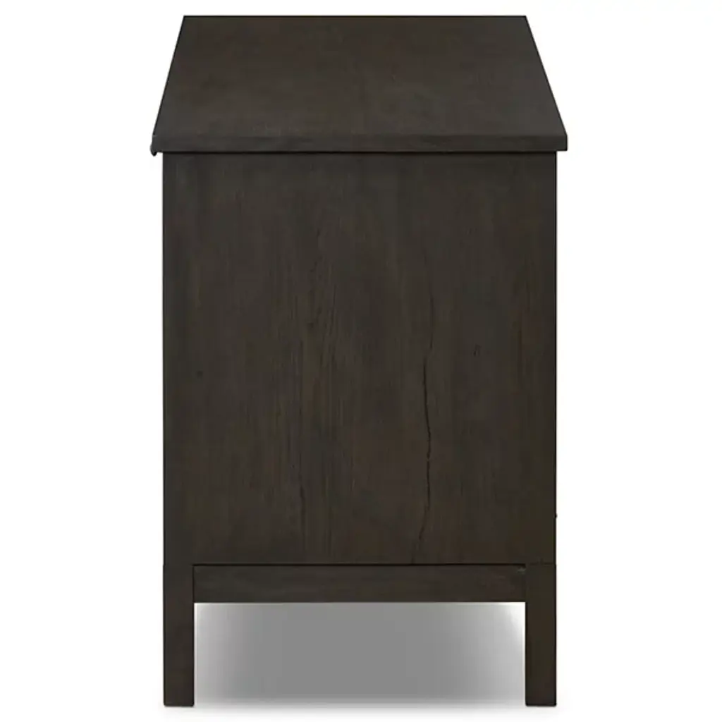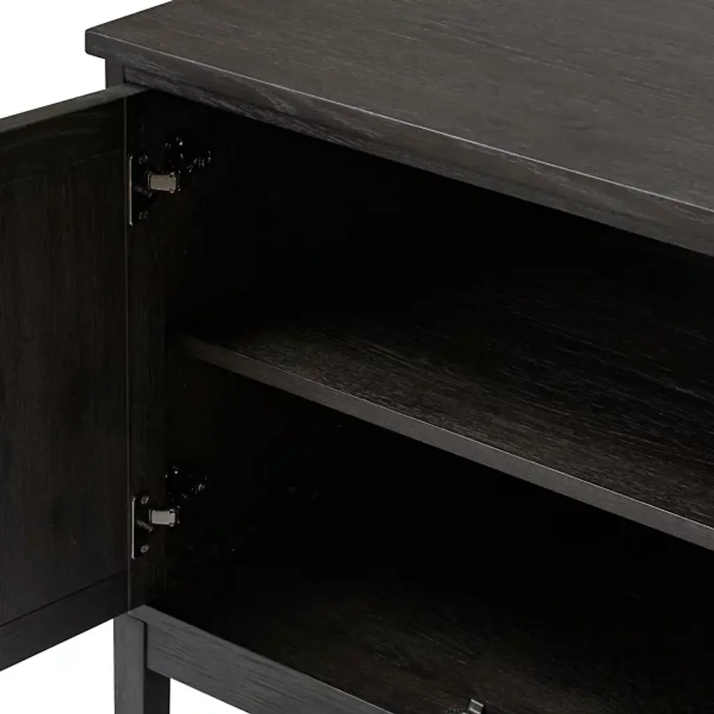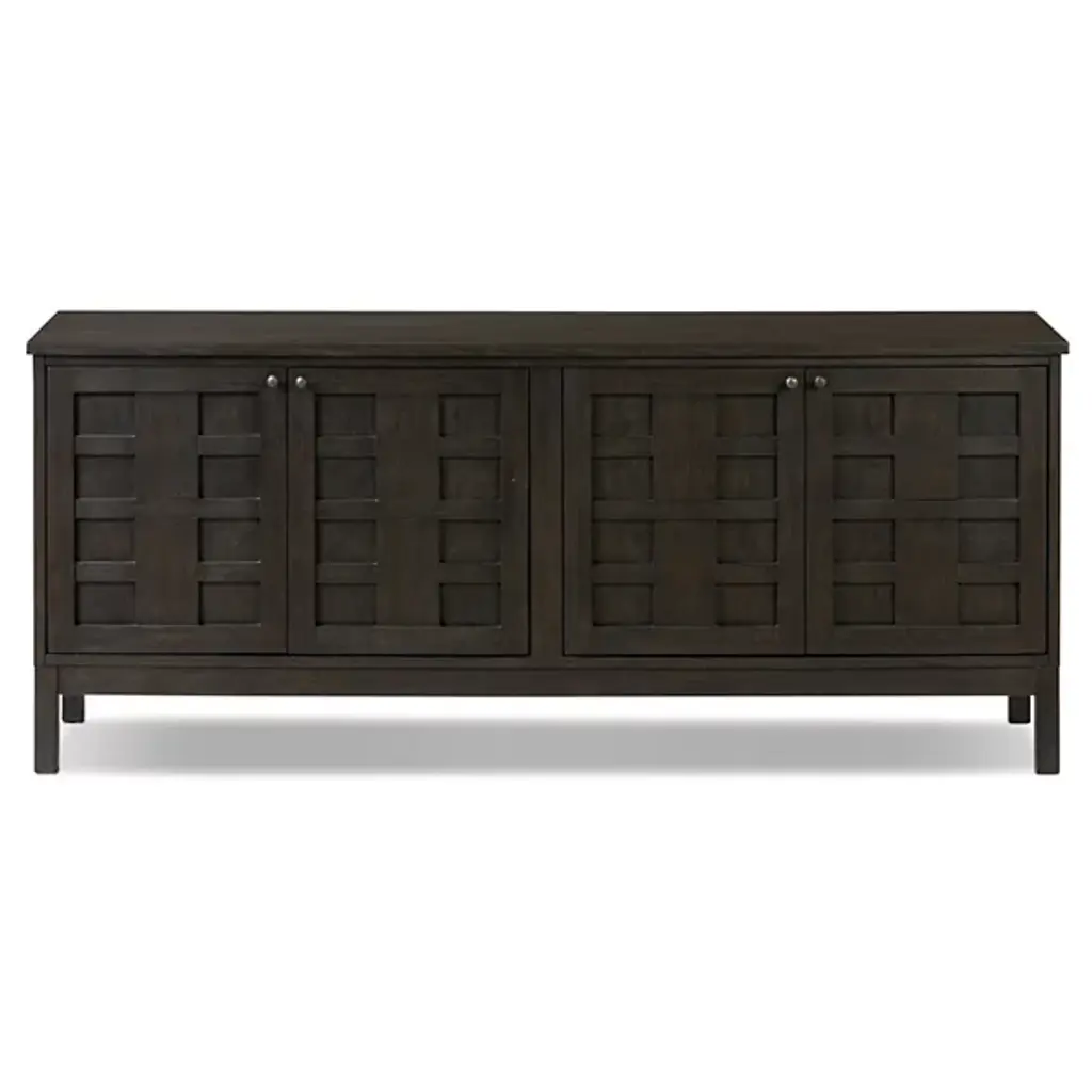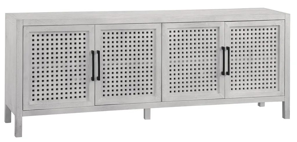 The Alessio Media Console from Four Hands shows off a refined transitional character able to stand out in a crowd. It’s a rectangular construction of solid oak with a fine finish, showing off minute imperfections and the graining. The console top overhangs four doors with grid-style patterns, while four slim block legs add air underneath. The knots and cracks contrast well with the fine design, while cord management cutouts add a bit of functional flexibility.