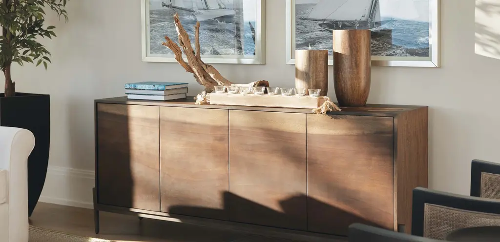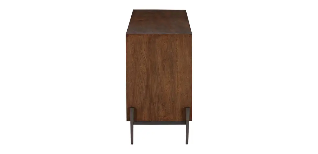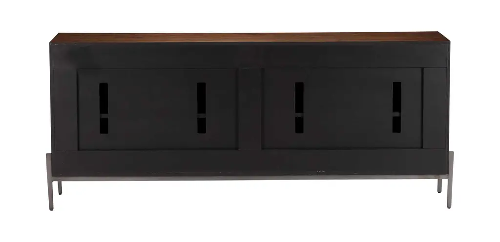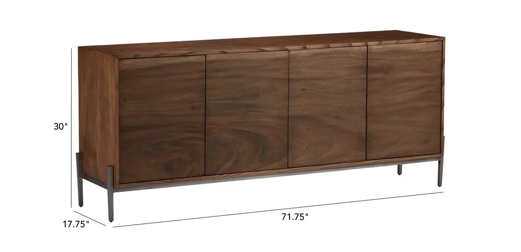 Continuous, hand-matched Guanacaste veneers create striking natural flow on the front doors of our Altan media cabinet. Set upon a modern, hand-forged steel base, each is as unique as the reclaimed tree from which it was made.