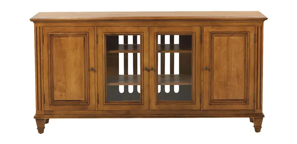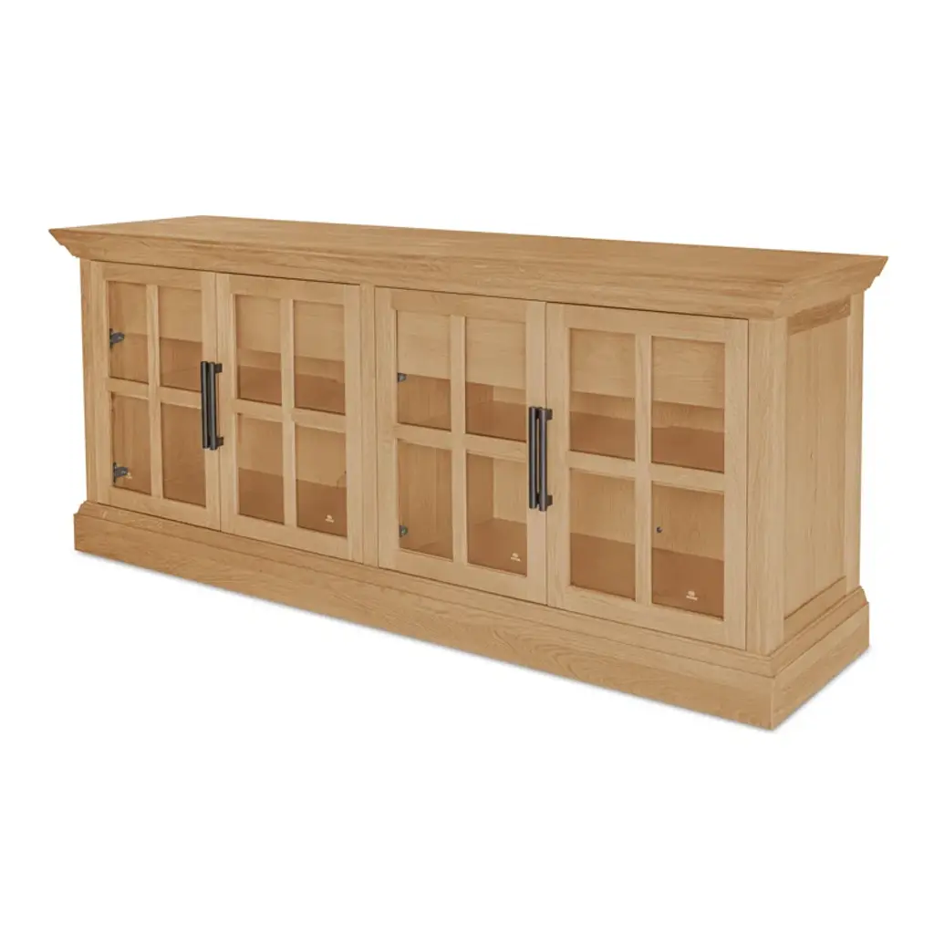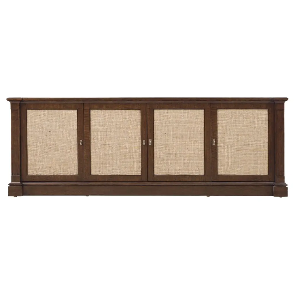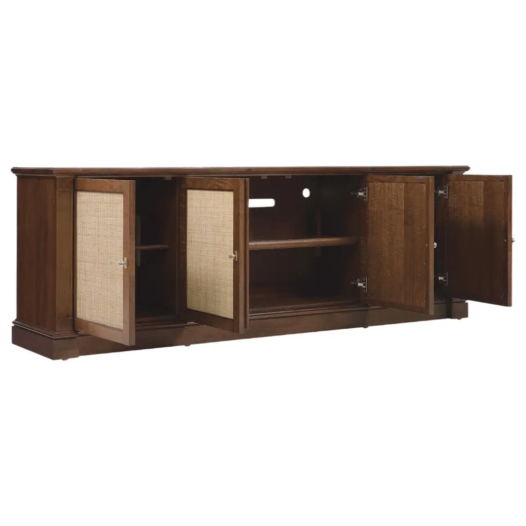 The Archives Entertainment Console brings a sophisticated blend of materials and finishes to your home entertainment space. Featuring four woven-cane panel doors and adjustable shelving, this console is designed to accommodate an 80" flat-screen TV, offering style and functionality. The high-clarity finish over veneers adds warmth and richness, while the ventilated back panel ensures your electronics stay cool. Ideal for those seeking a luxurious, yet practical piece to enhance their living room.