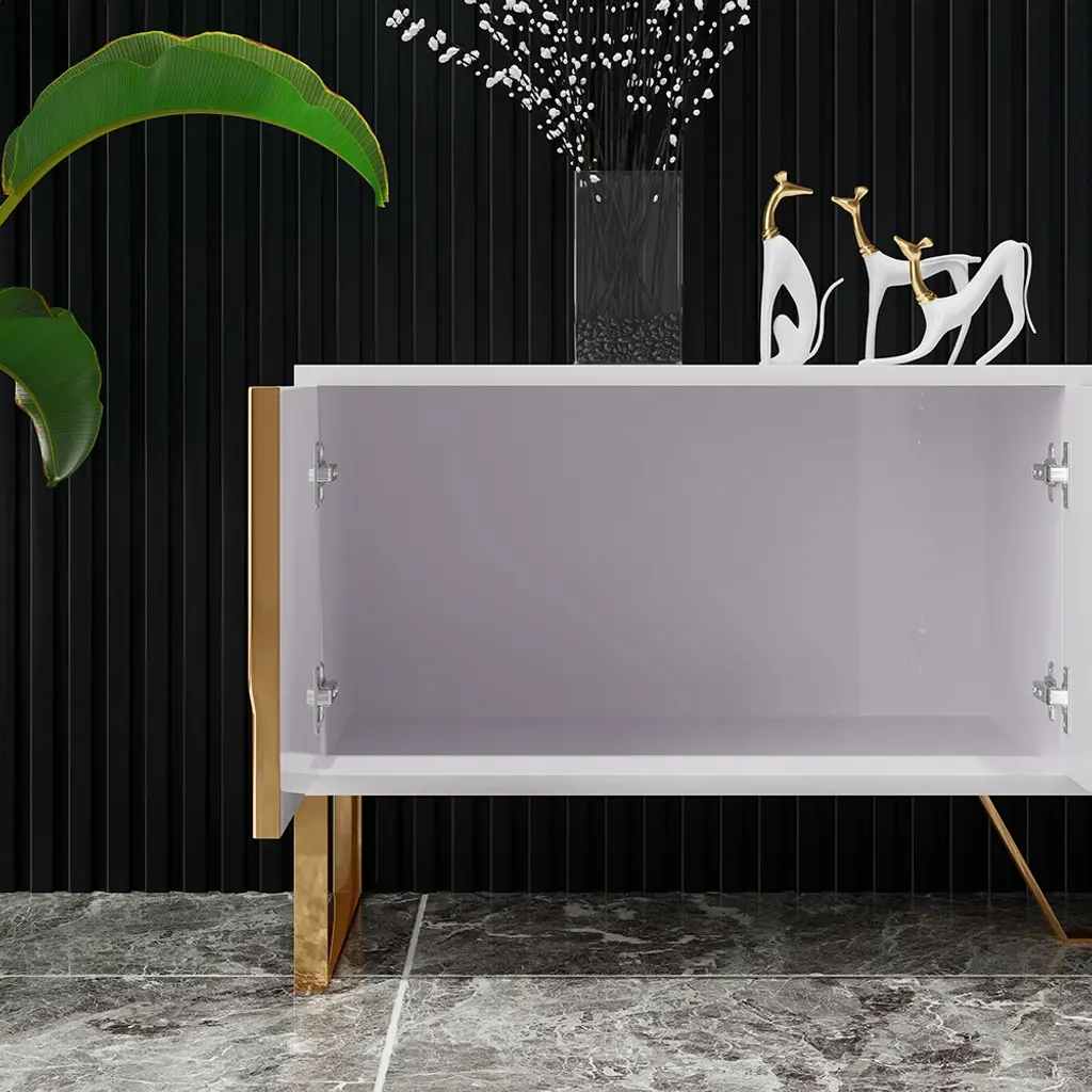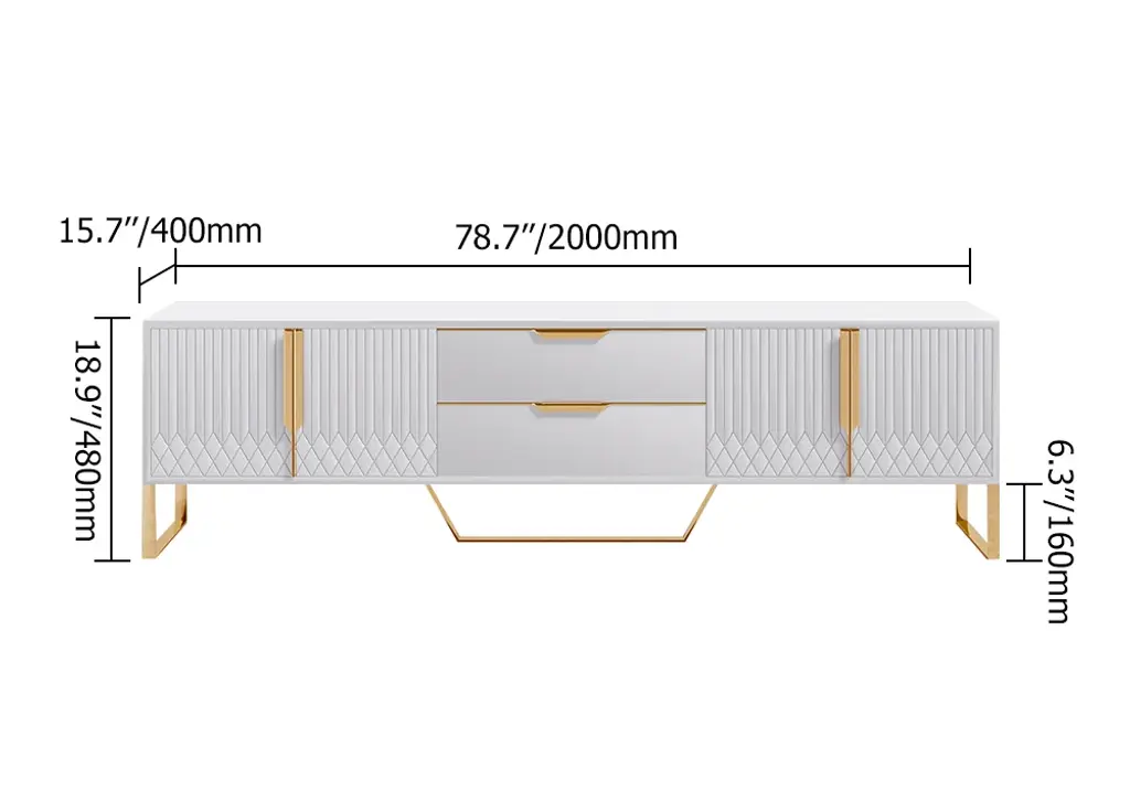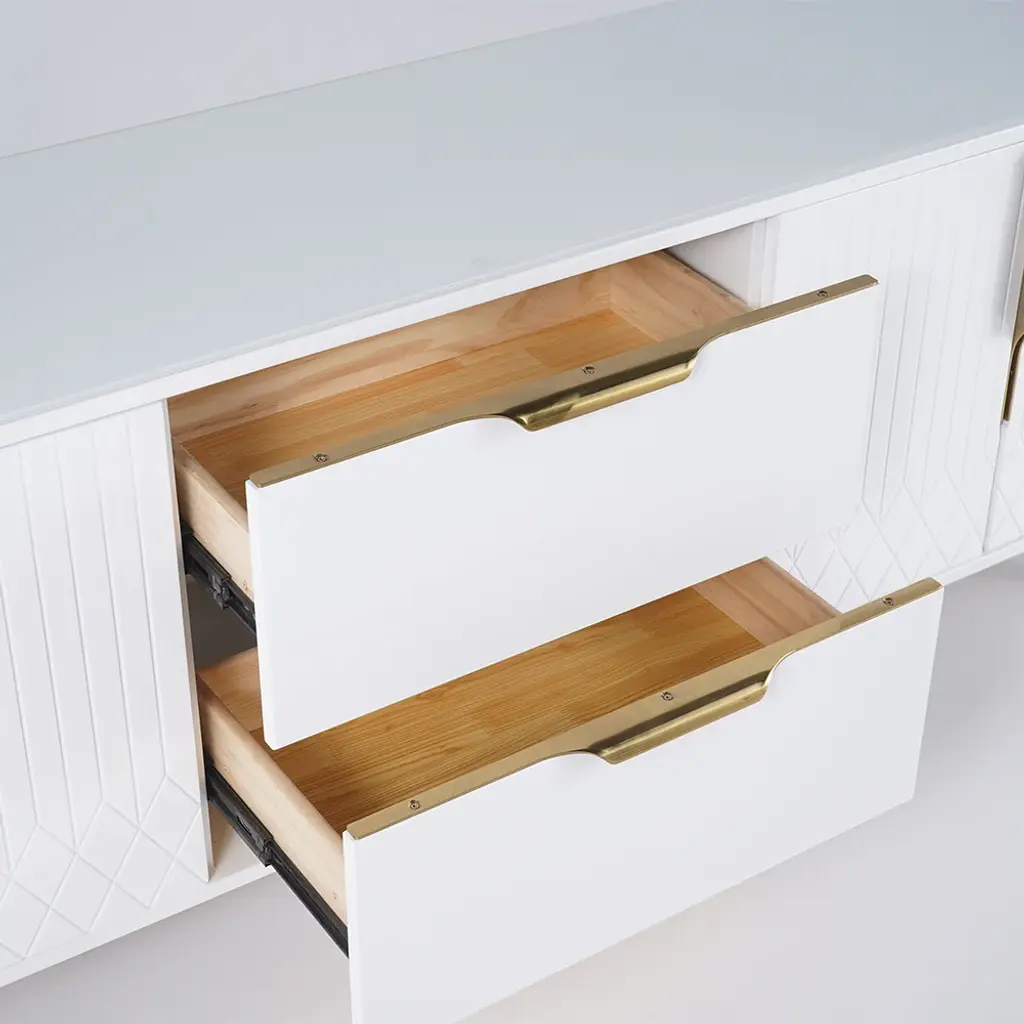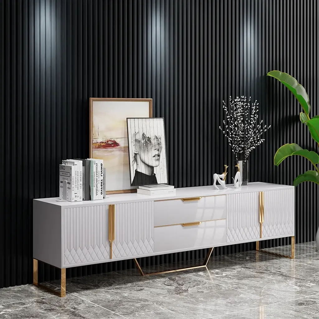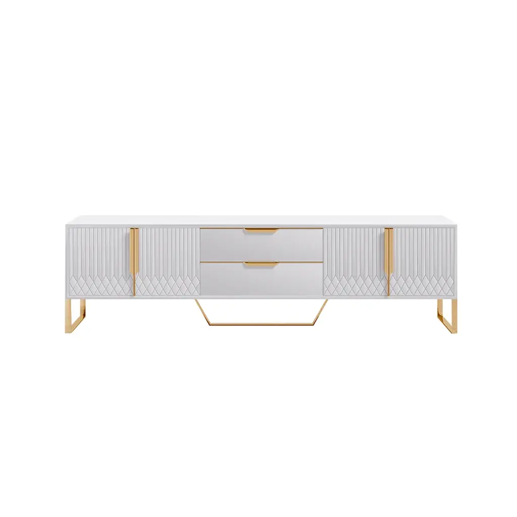 Aro TV stand combines modern elegance with practical function, featuring two spacious drawers and two side cabinets for versatile storage. Its sophisticated glossy finish sets a high-end mood, while the minimal assembly required lets you enjoy your new centerpiece almost instantly.