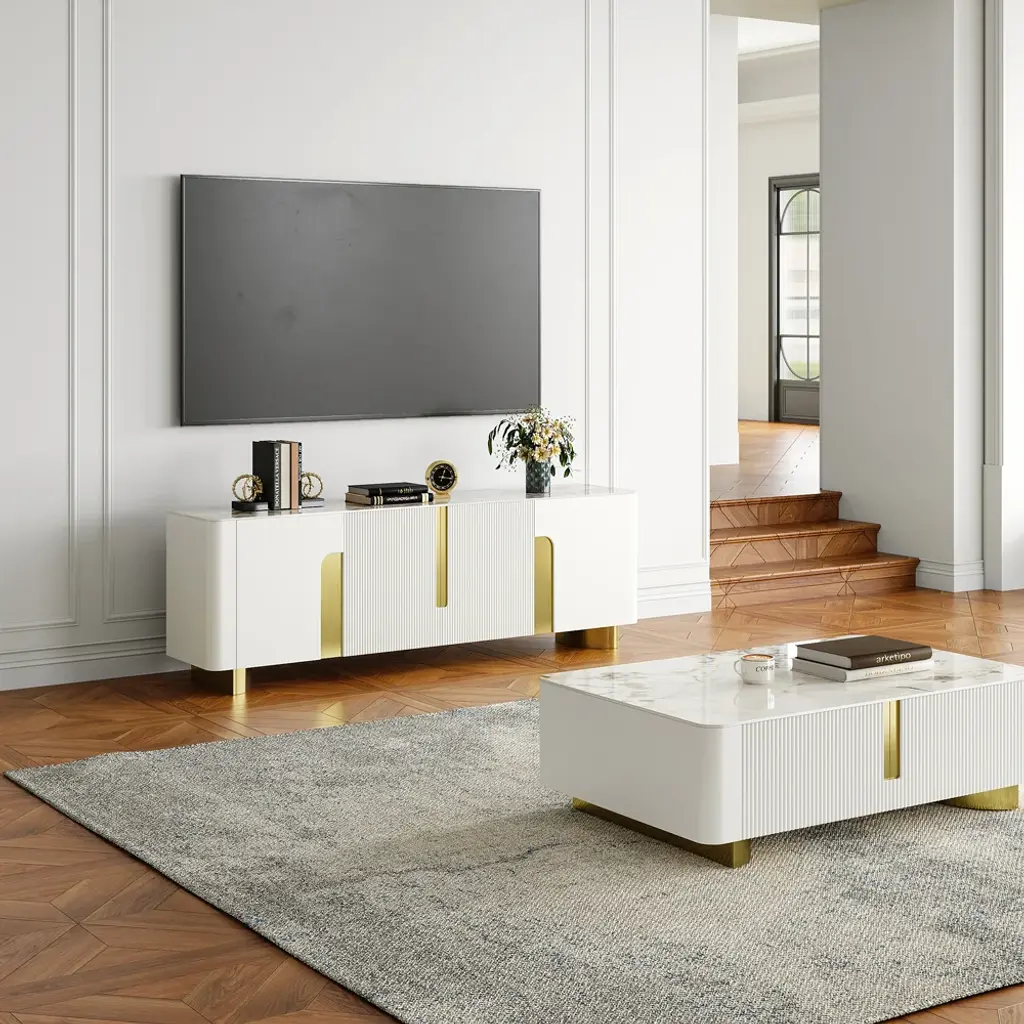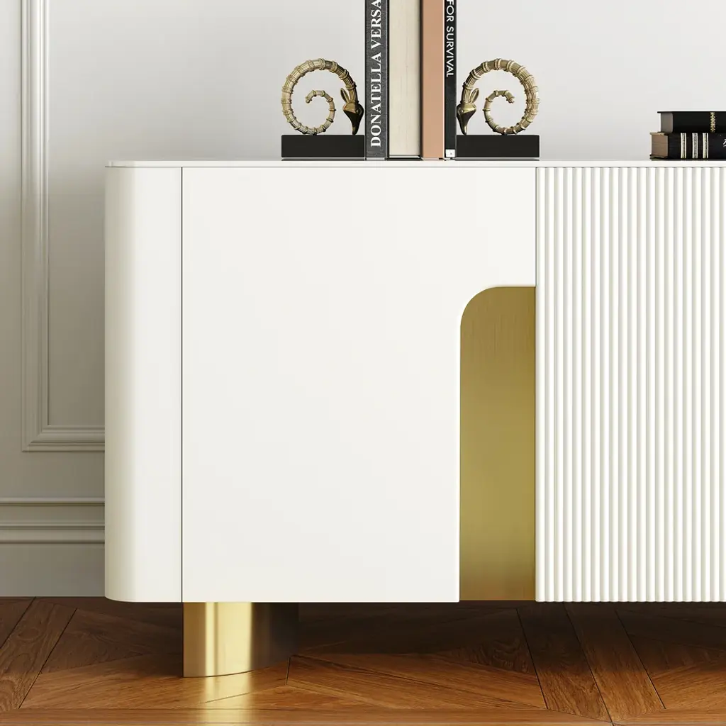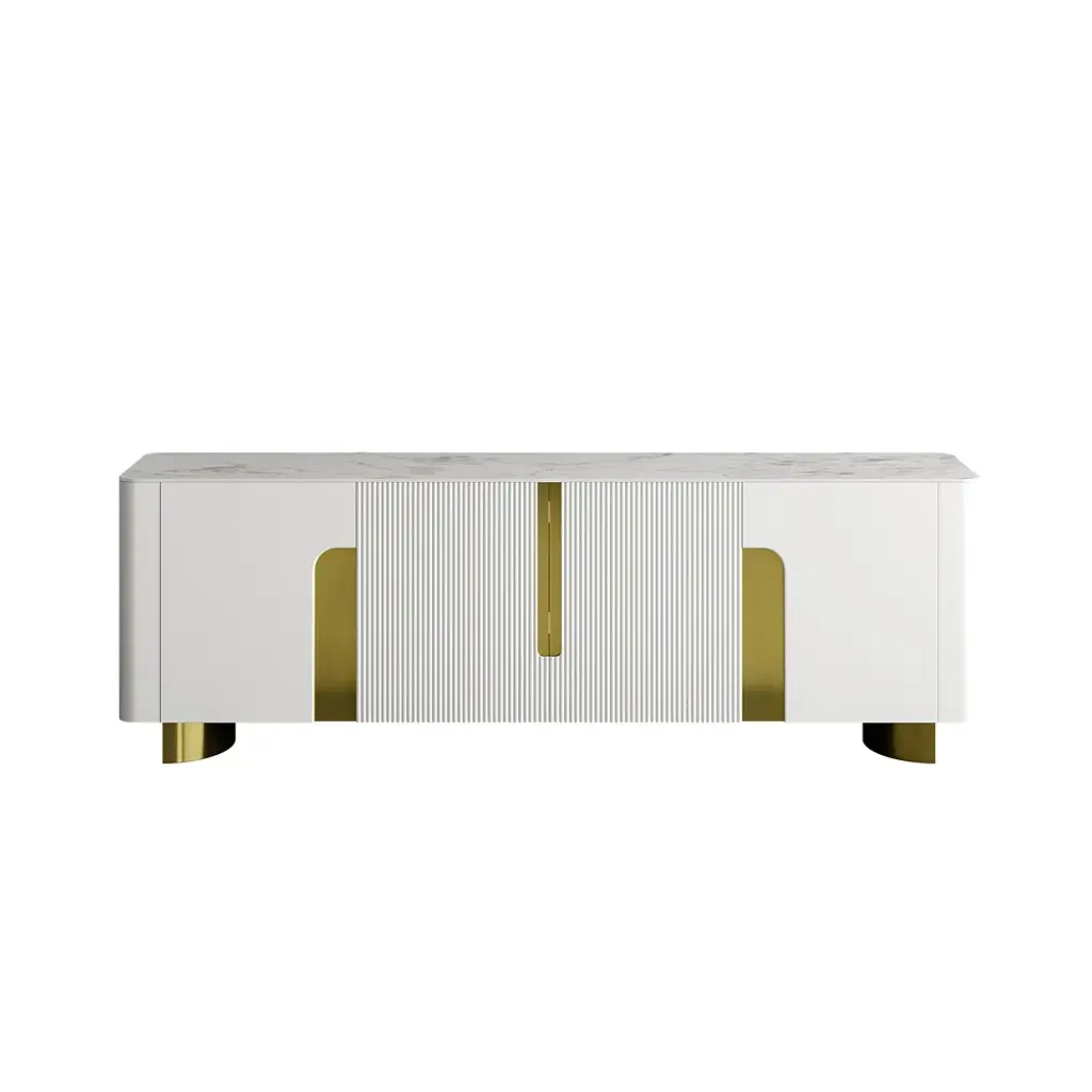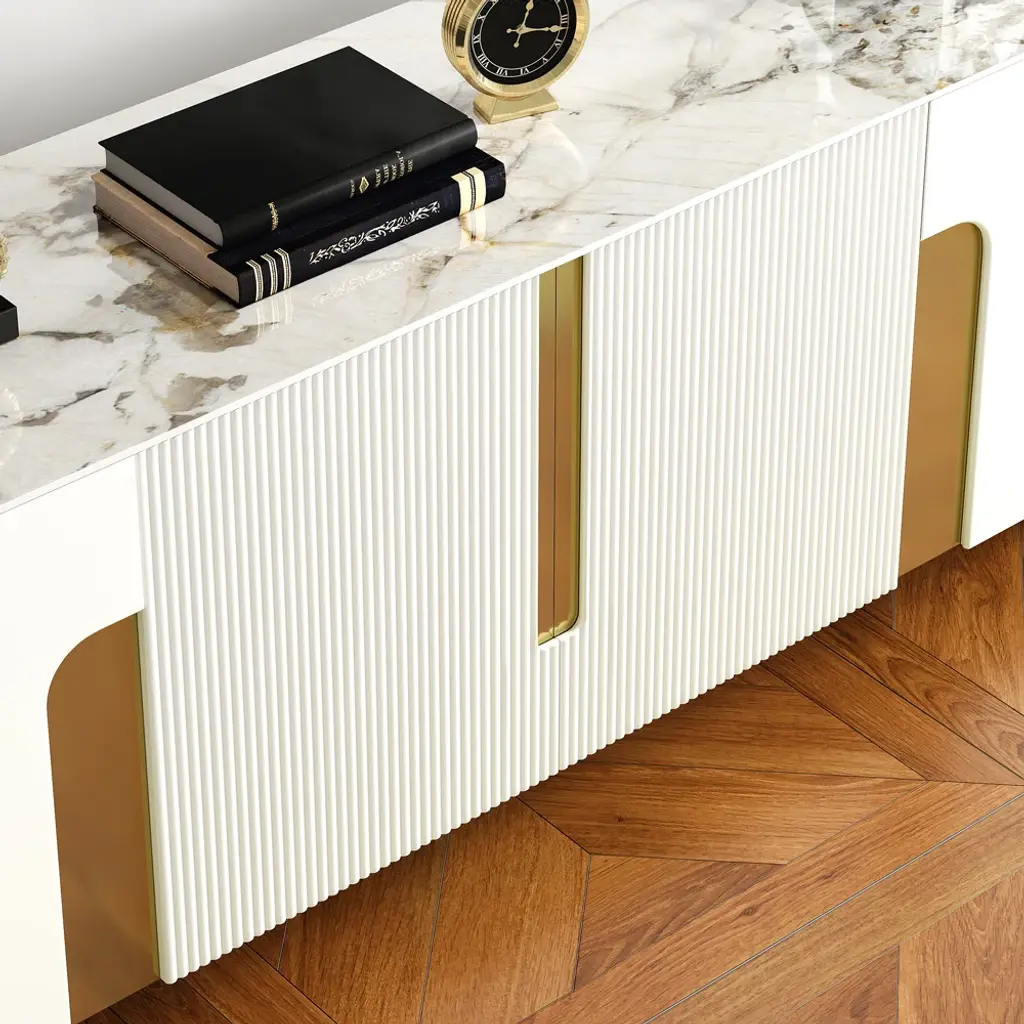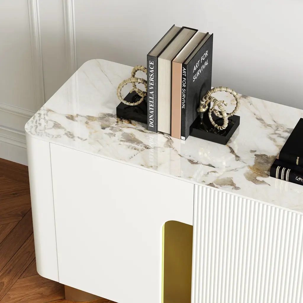 Functional elegance defined: Artus features scratch-proof stone tabletop, gold-trimmed slatted doors, and optimized storage compartments. Install in minutes, enjoy for years.
