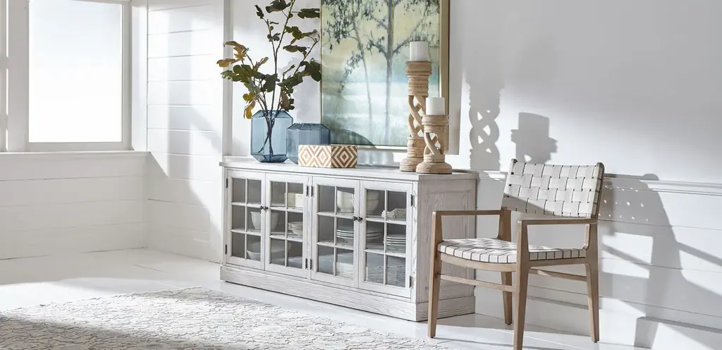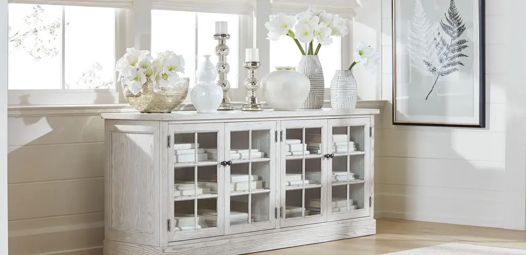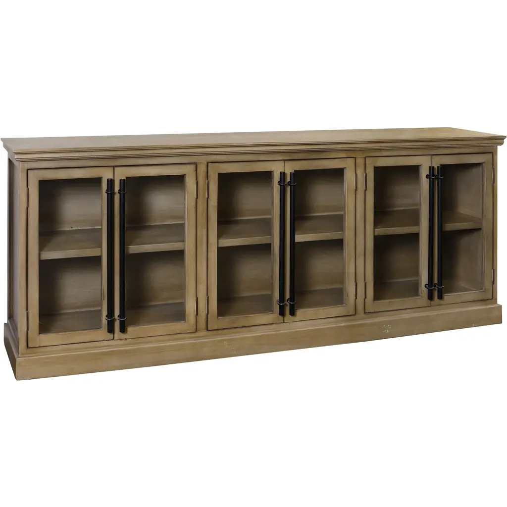 The charming pleasure of peering through wood-framed farmhouse windows, rendered in a farmhouse-style media cabinet that has plenty of space for storage and can double as a buffet. Gather for entertainment, or lay out a hearty spread. Great quality leads to good times ahead.