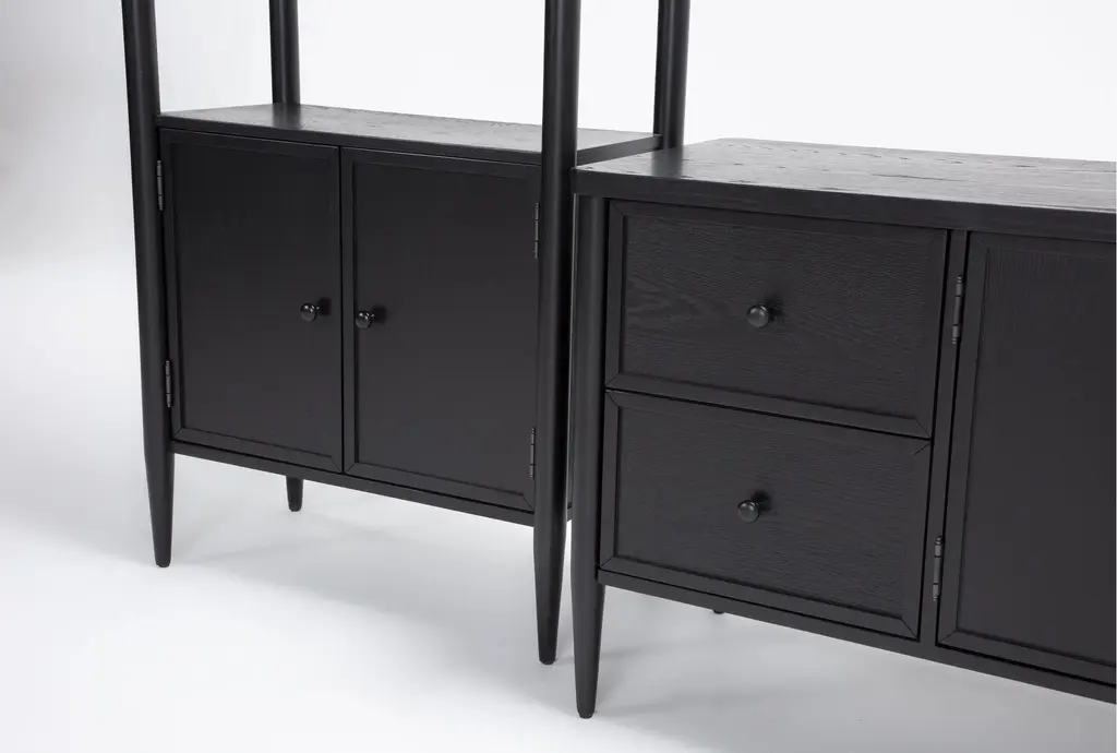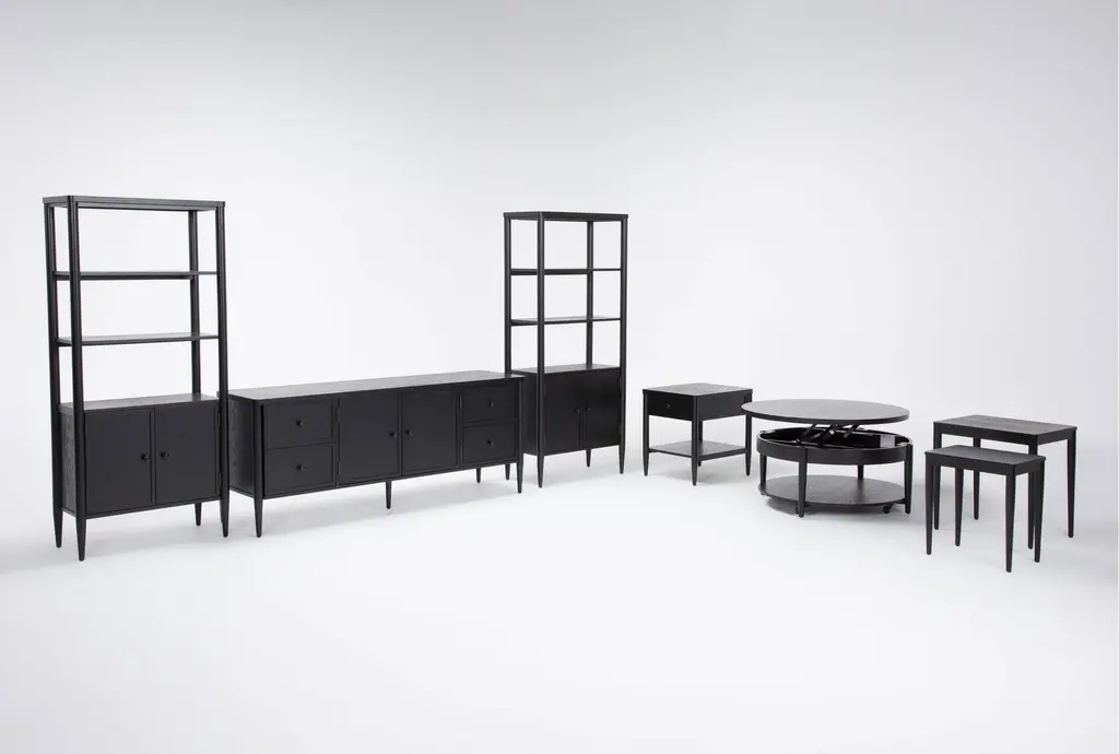 Enhance your living room with the Austen Black Traditional 6 Piece TV Stand and 40" Round Lift-Top Coffee Table Set. This beautifully designed set, featuring a traditional style, offers both functionality and aesthetic appeal. Crafted from oak veneer and solid rubberwood, it delivers durability and a timeless black finish that complements any decor.