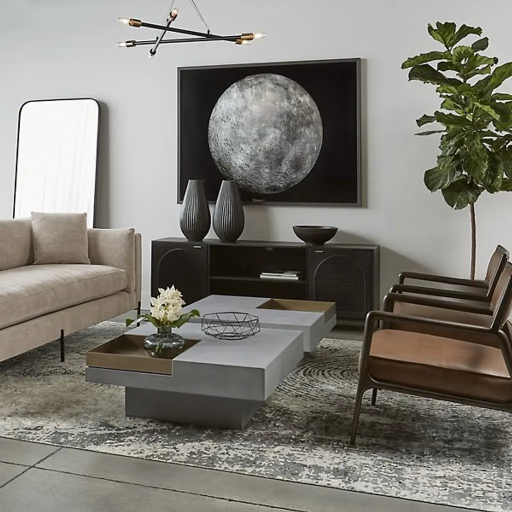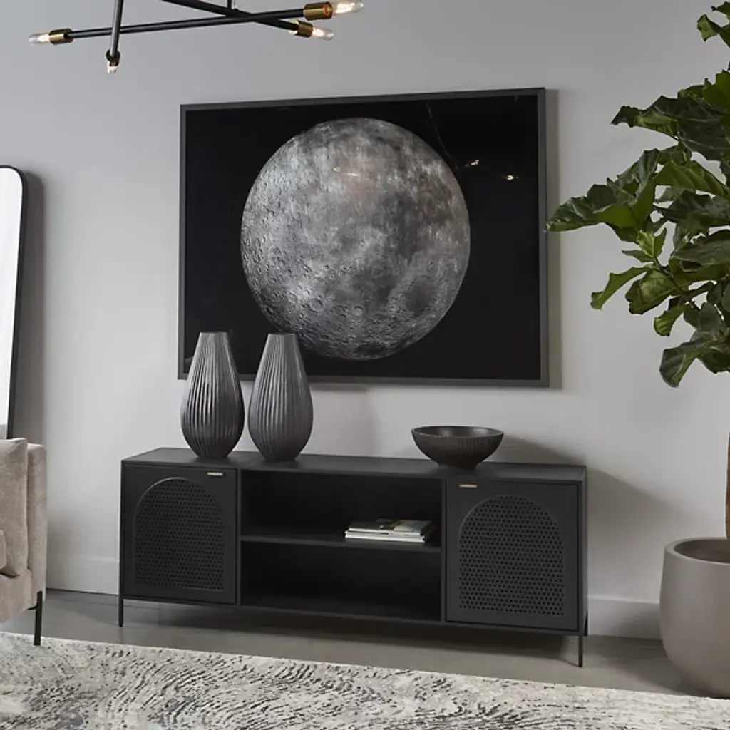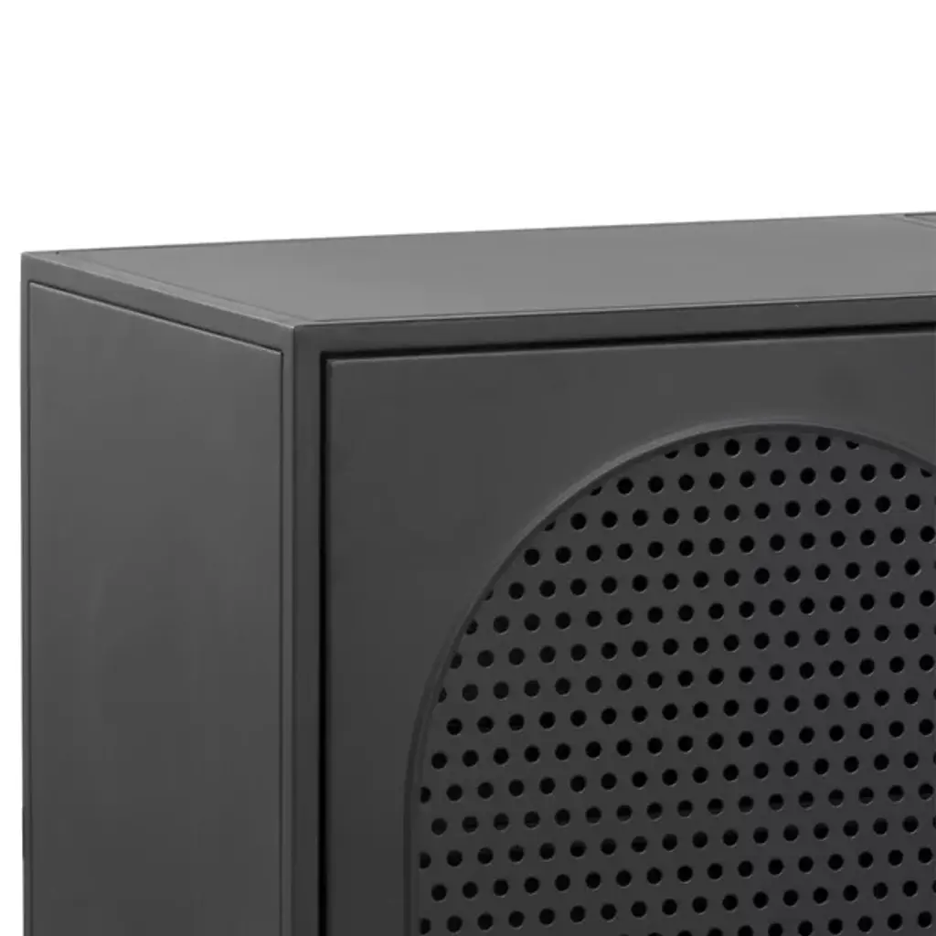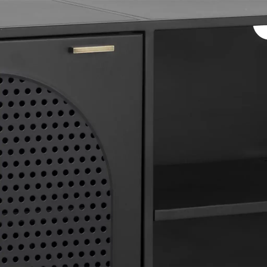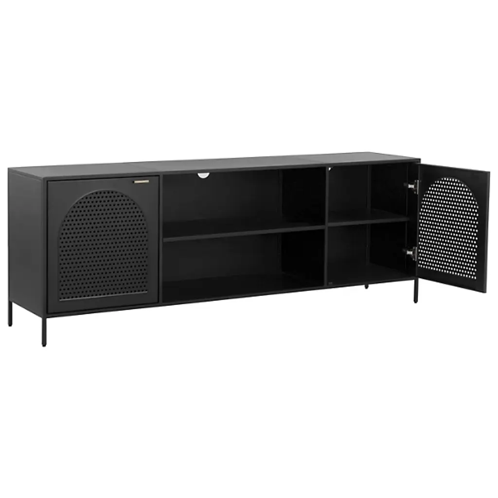 Match industrial design with modern functionality with the Aziza Media Console and Cabinet from Sunpan. Made in India with a black metal frame, it’s complemented by brass-finished handles that add welcome sophistication. The console features open shelving flanked by two cabinets with arched perforated metal doors on either side. Small cord management openings offer easy organization, while artisanal craftsmanship ensures that each piece is uniquely characterized by subtle variations, making it a singular addition to any space.